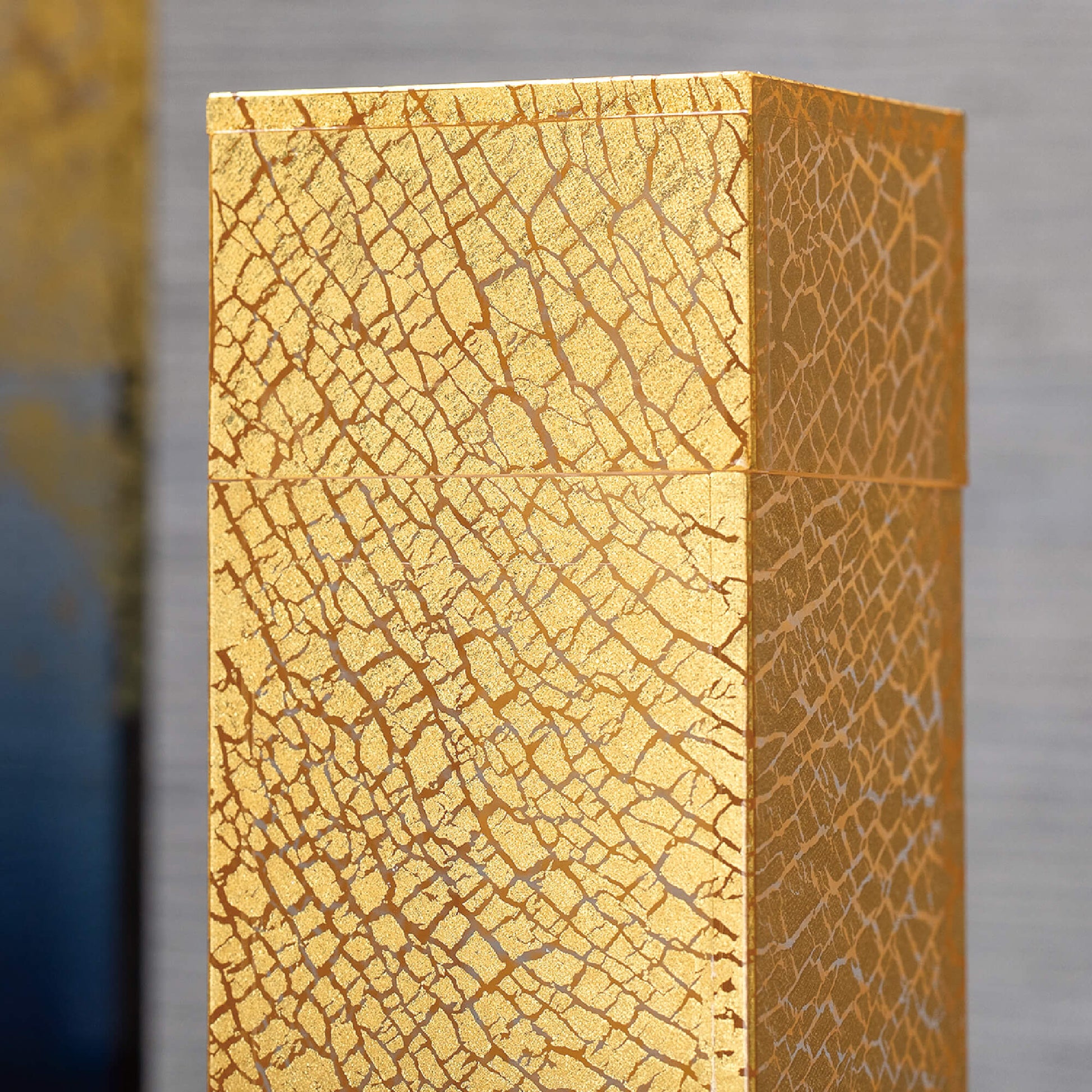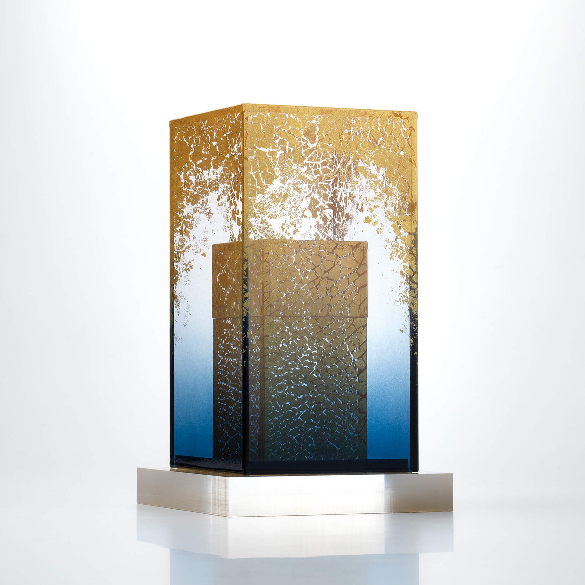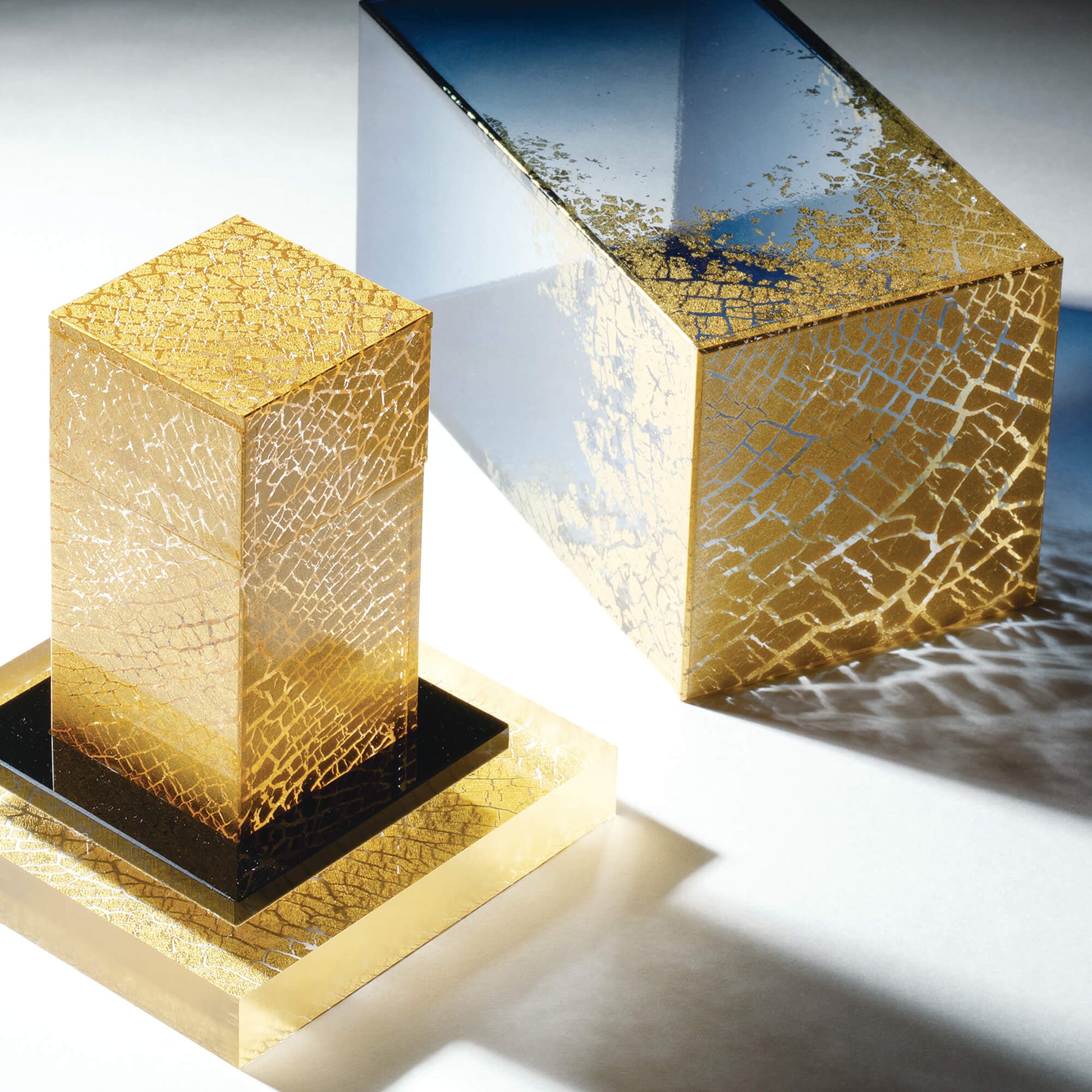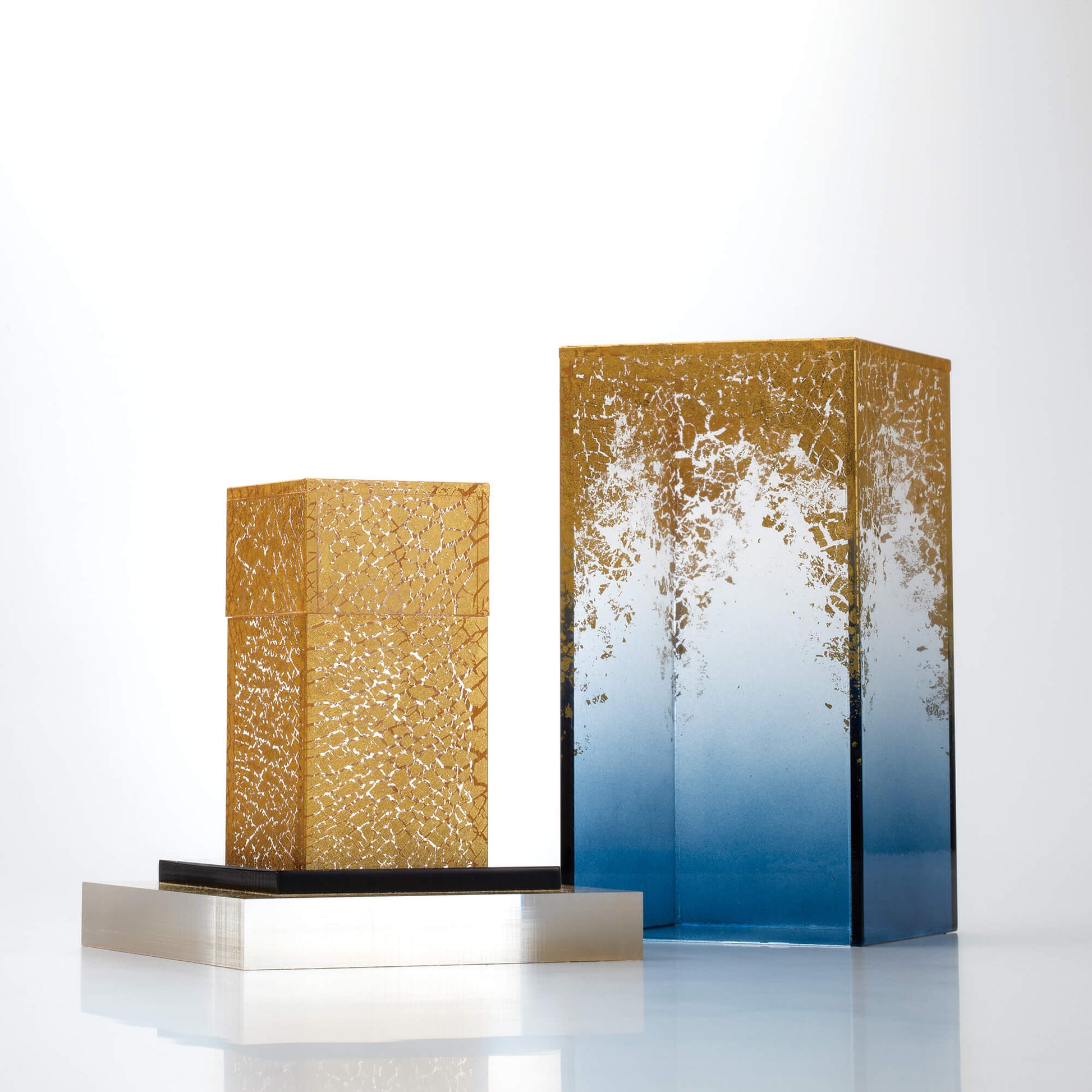 この祈りの塔は、お骨や形見を収めるよう設計されました。日本の伝統技術である金沢箔の金箔を使い、 透明感のあるアクリルと組み合わせる事で、新たな祈りの塔となりました。 ひび割れは、誕生を意図し、輪廻転生を願ったものです。