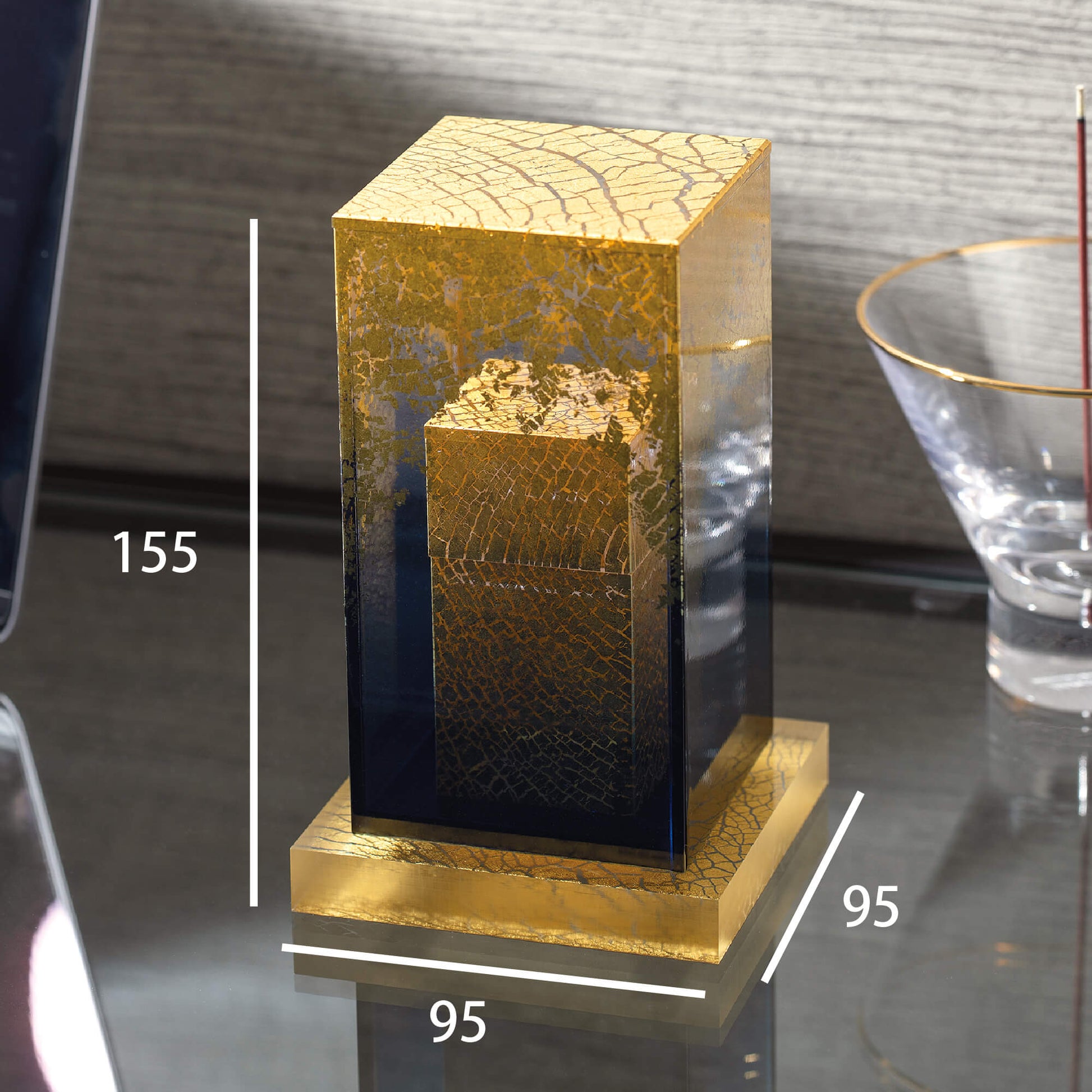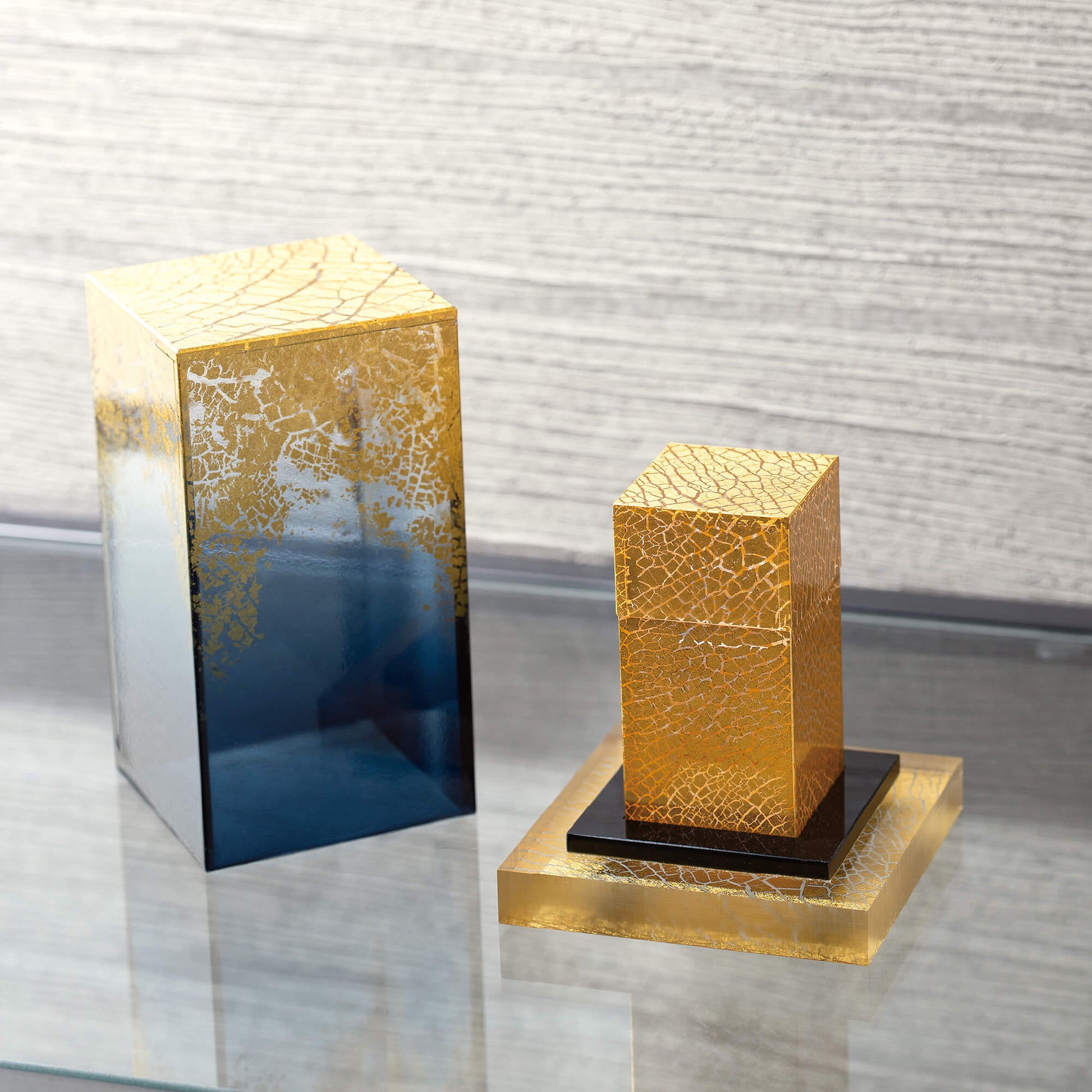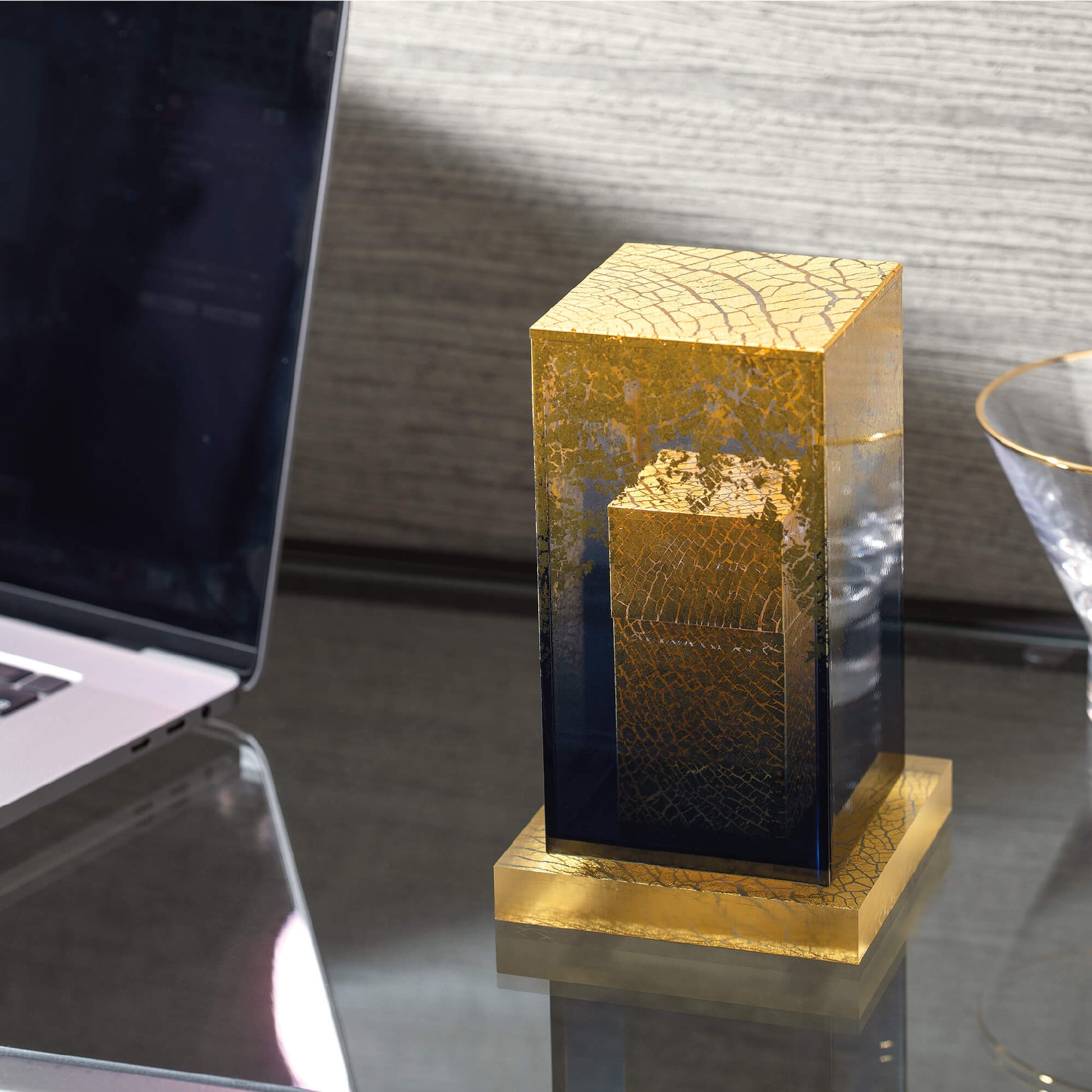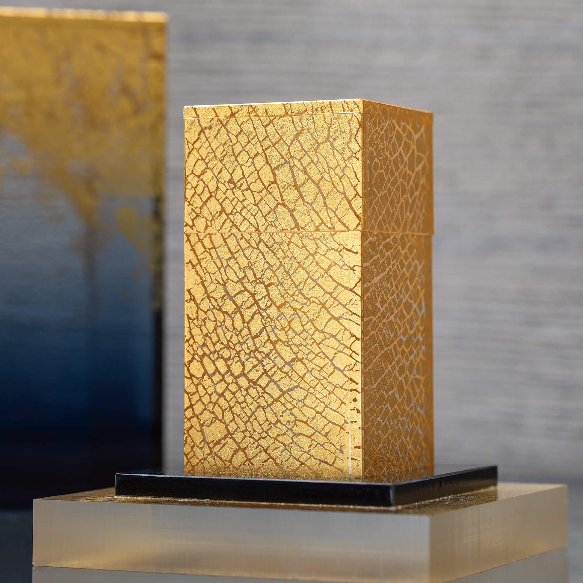 この祈りの塔は、お骨や形見を収めるよう設計されました。日本の伝統技術である金沢箔の金箔を使い、 透明感のあるアクリルと組み合わせる事で、新たな祈りの塔となりました。 ひび割れは、誕生を意図し、輪廻転生を願ったものです。