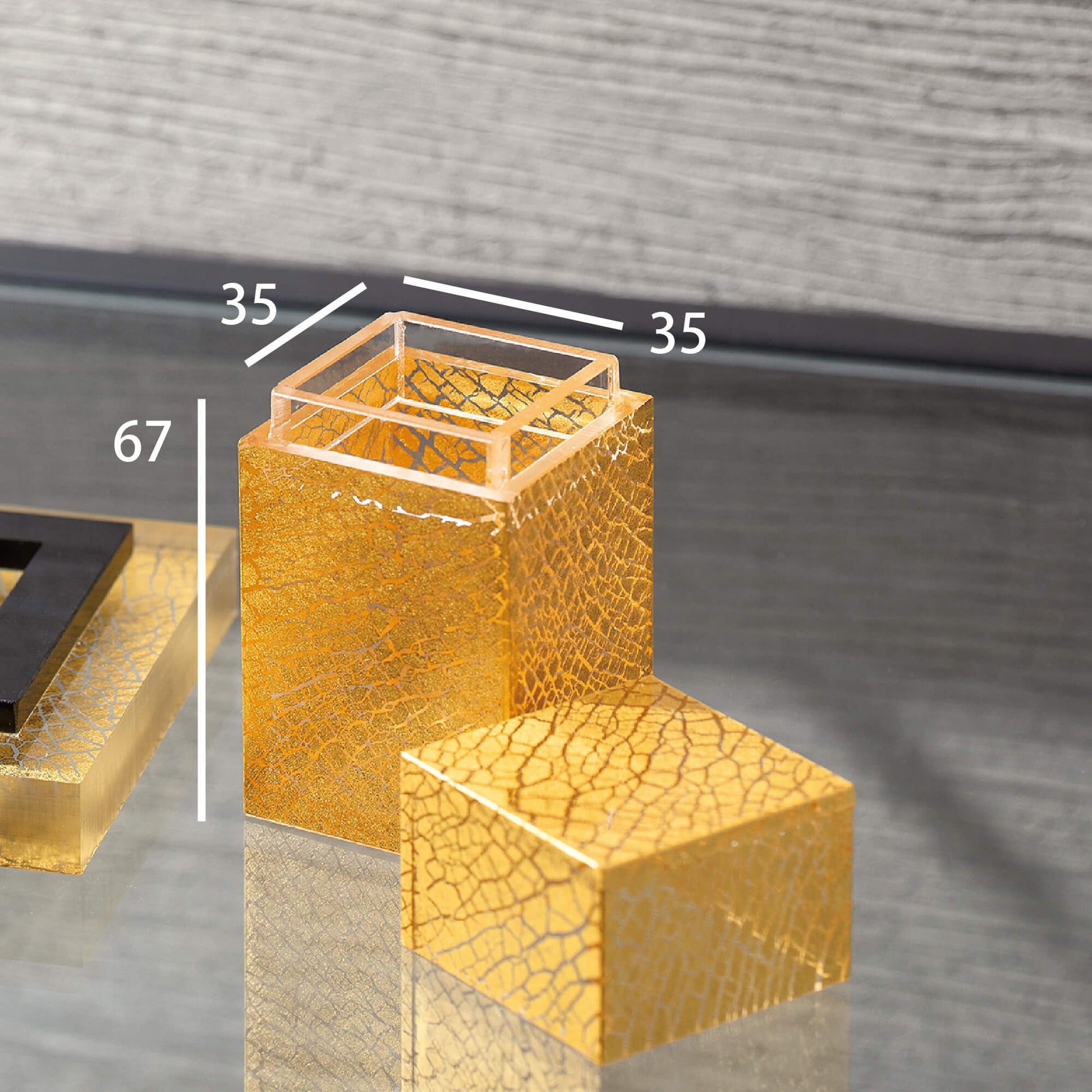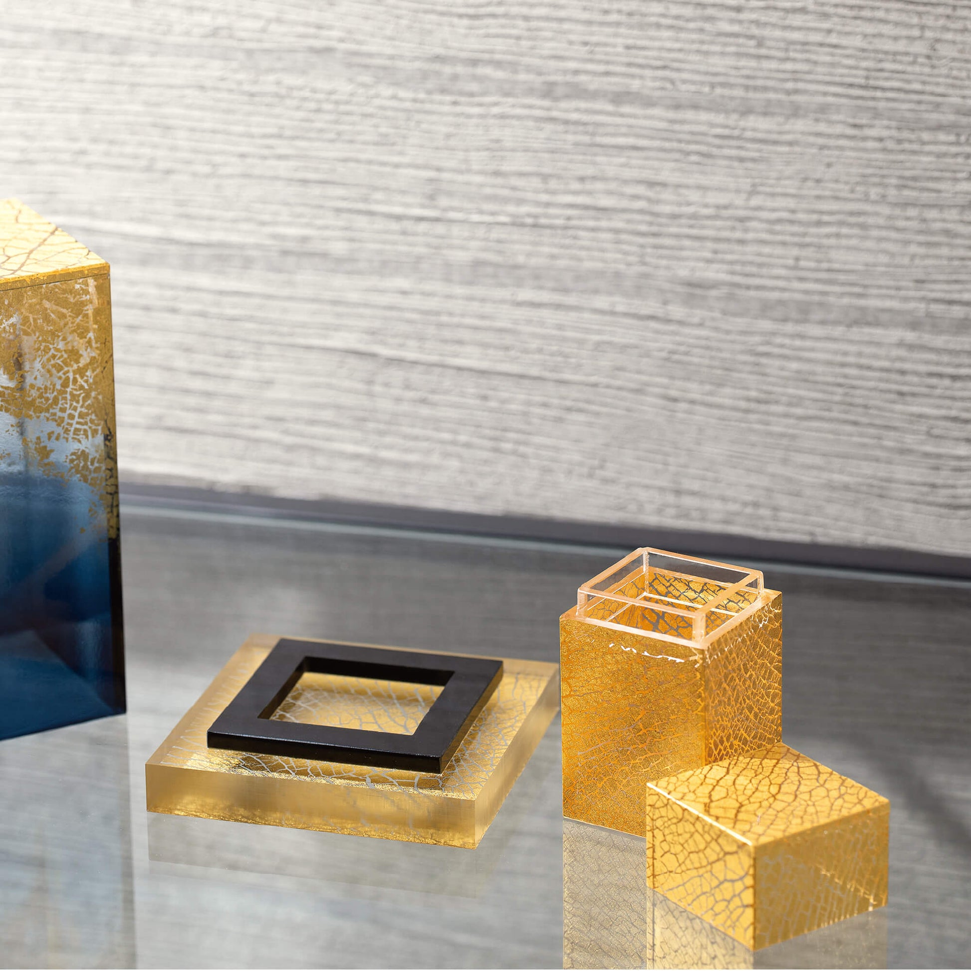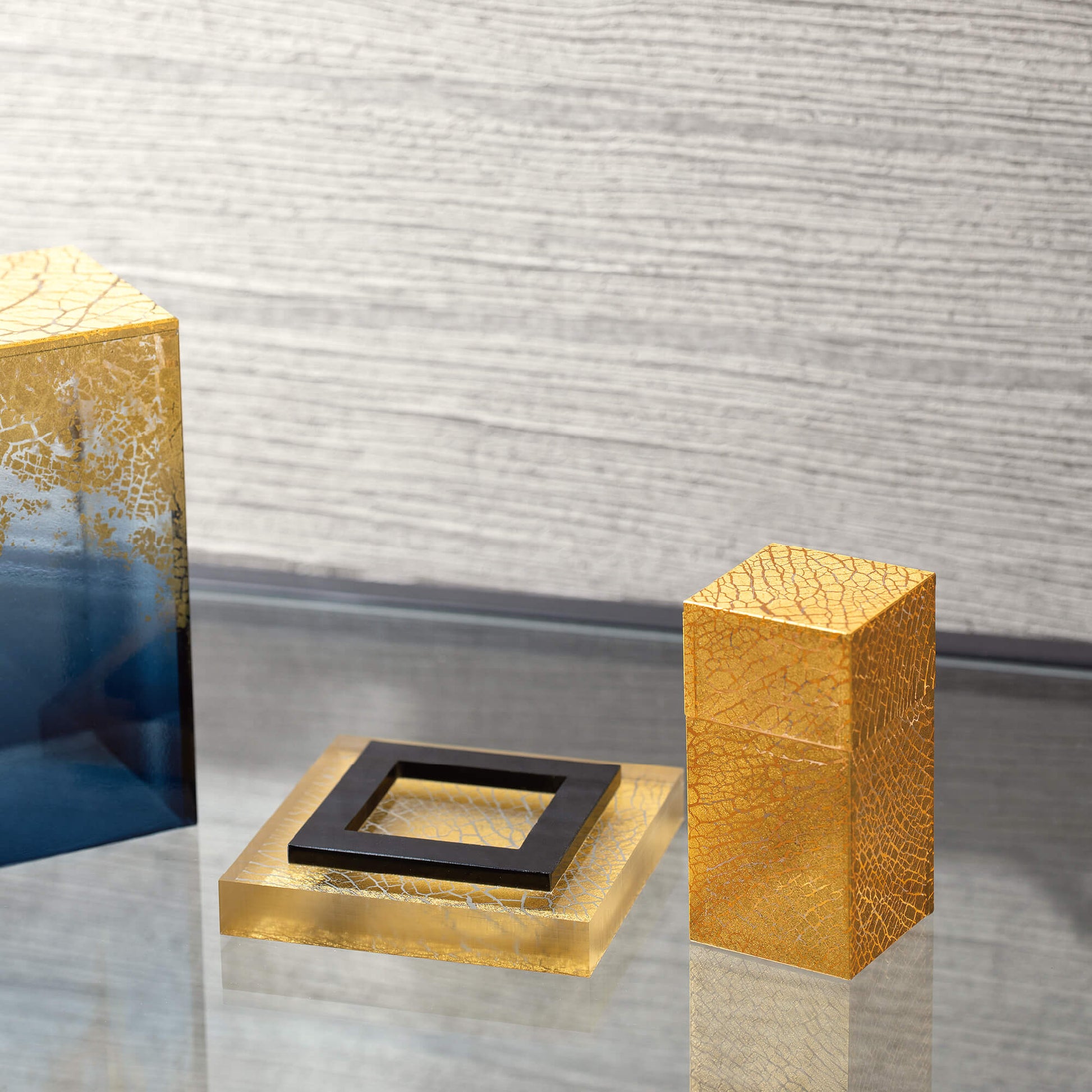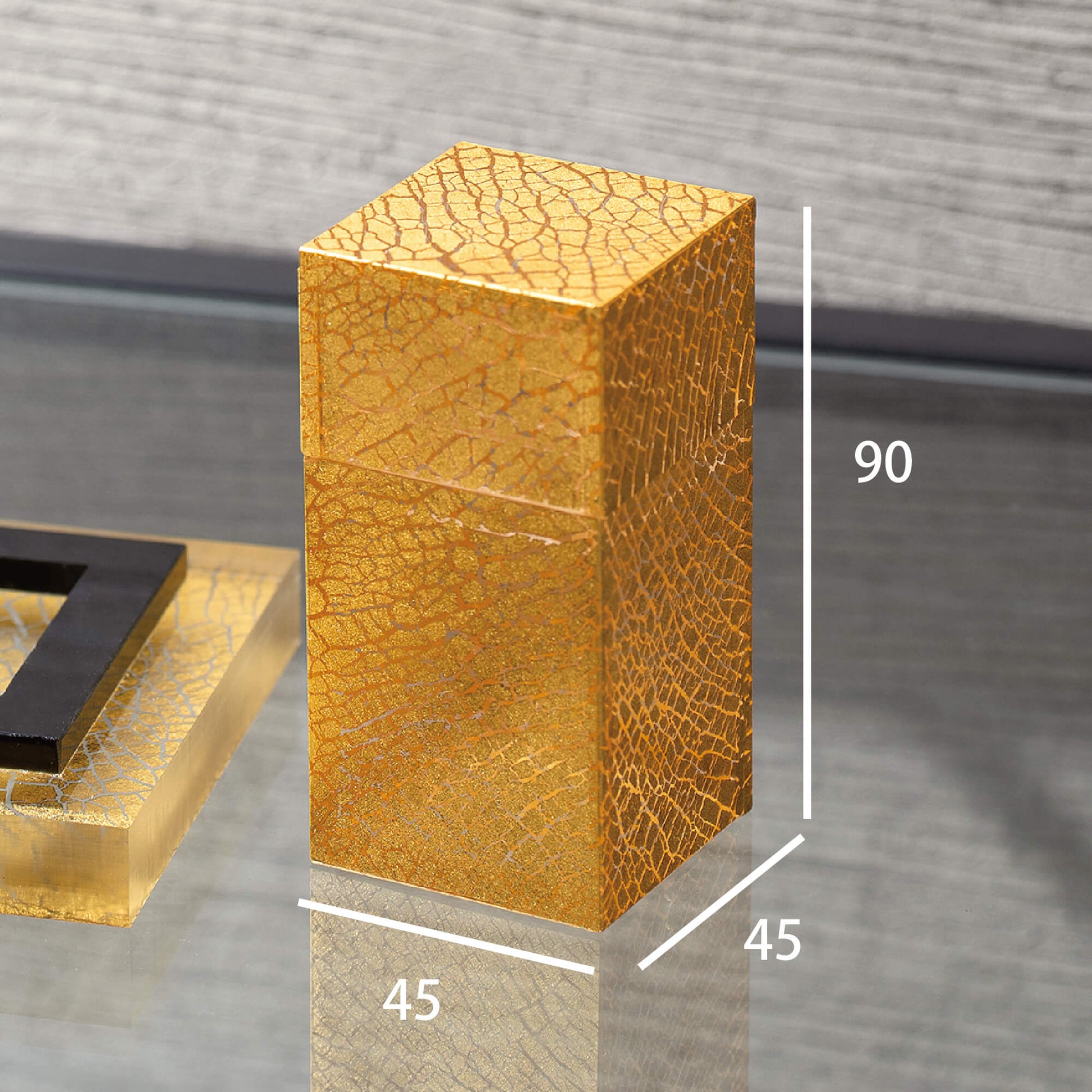 この祈りの塔は、お骨や形見を収めるよう設計されました。日本の伝統技術である金沢箔の金箔を使い、 透明感のあるアクリルと組み合わせる事で、新たな祈りの塔となりました。 ひび割れは、誕生を意図し、輪廻転生を願ったものです。
