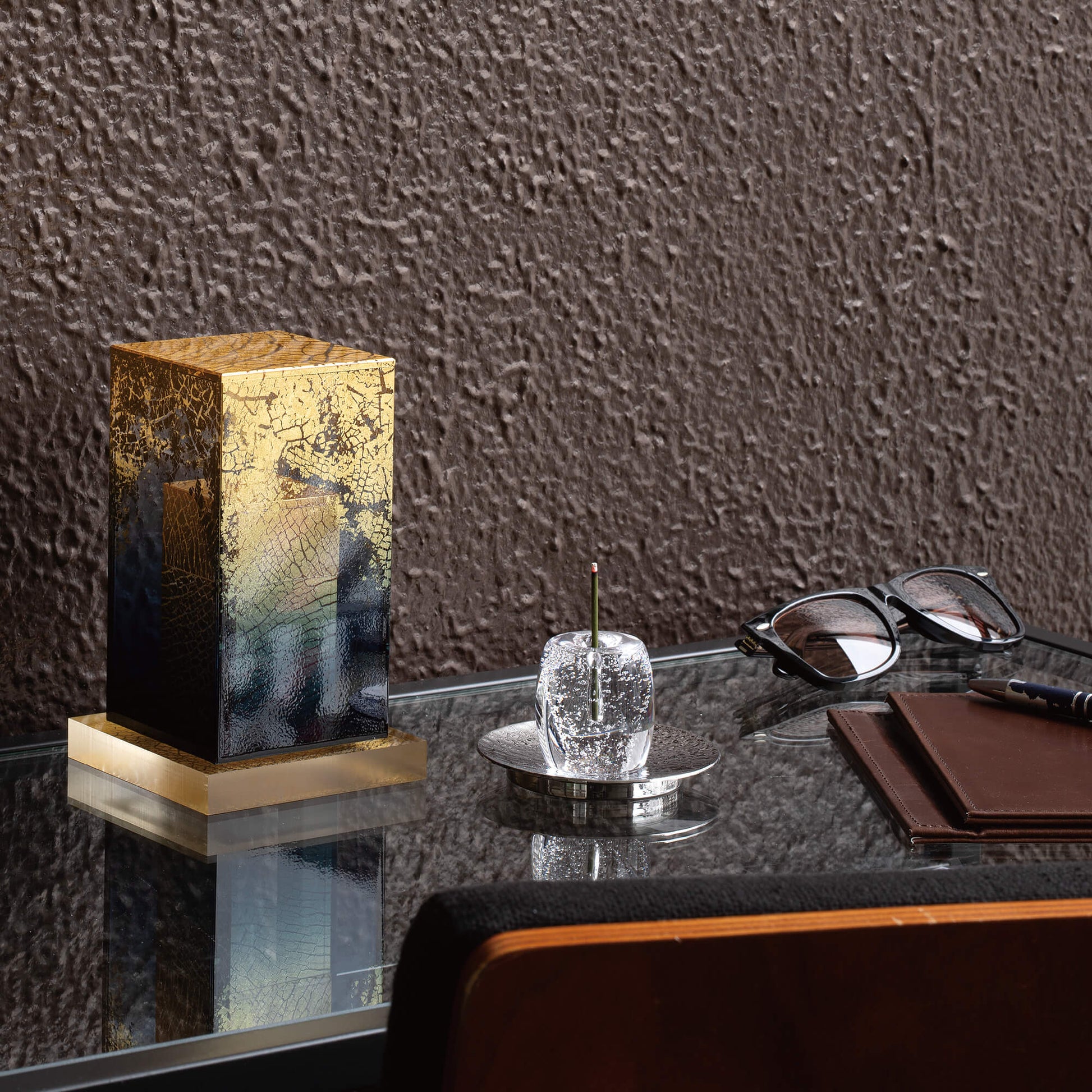 塔の内部には、小さな遺灰容器が納められており、大切な人の存在を静かに抱くことができます。 外側の透明アクリルには同じひび割れ模様が施され、透明性と包容力をもって中の塔を守ります。 それはまるで、心の奥にある大切な想いを、見守り続けるかのようです。 台付きで、小さな神殿のようにしました。