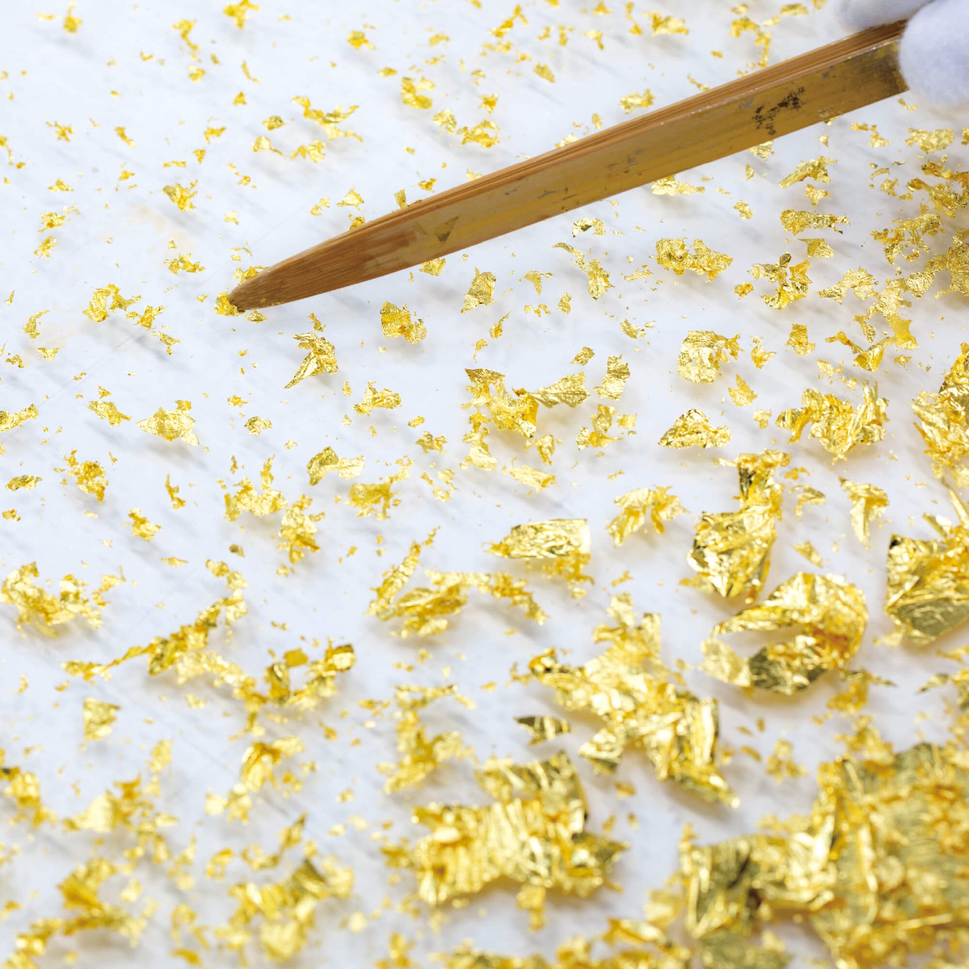 金沢金箔は、石川県金沢市で生産される伝統的な金箔で、日本国内の金箔生産の約99%を占めています。400年以上の歴史と高度な職人技によって、わずか1万分の1ミリ以下という極薄に仕上げられ、美しい光沢と品質の高さで知られています。寺社仏閣の装飾はもちろん、工芸品や化粧品、食品などにも幅広く活用されています。