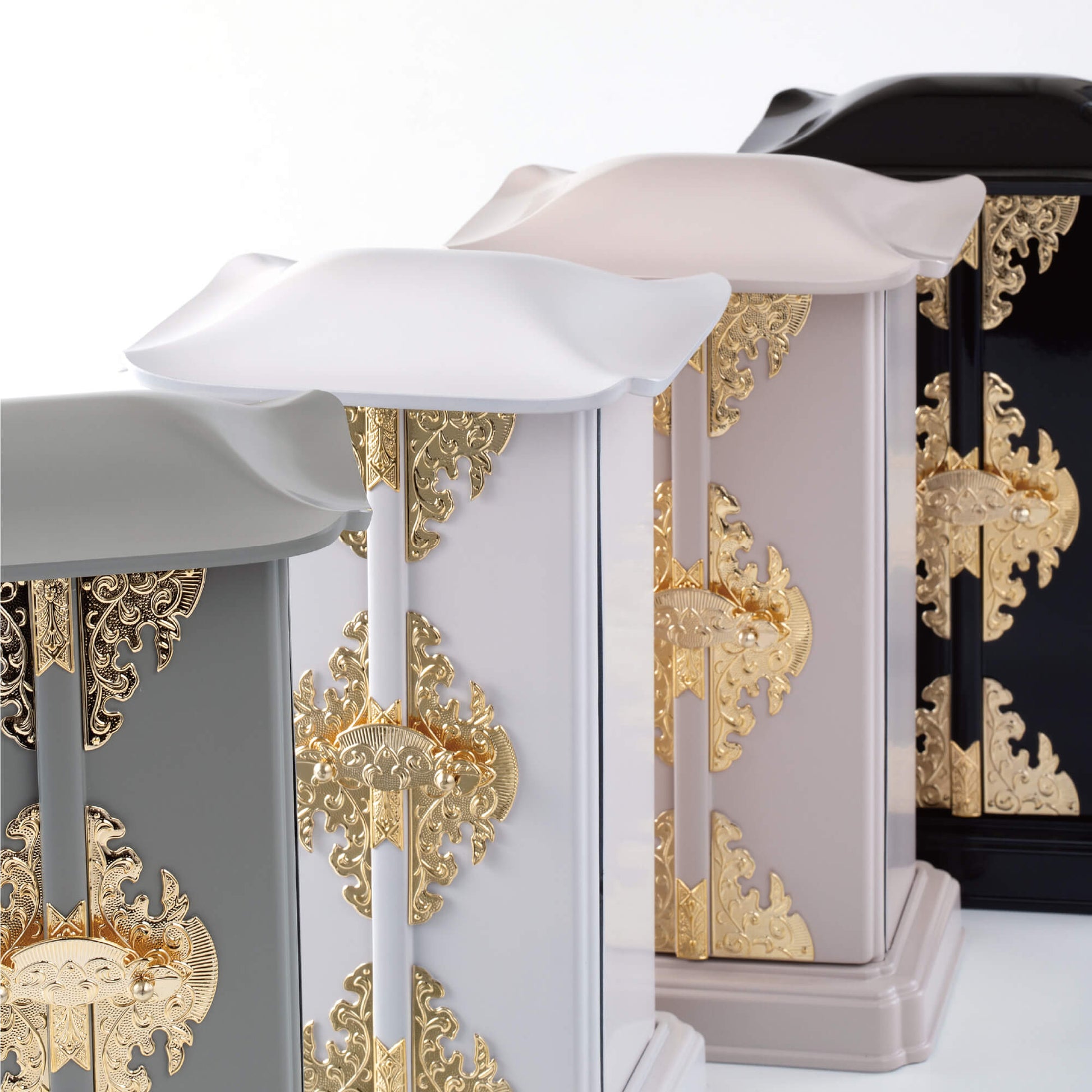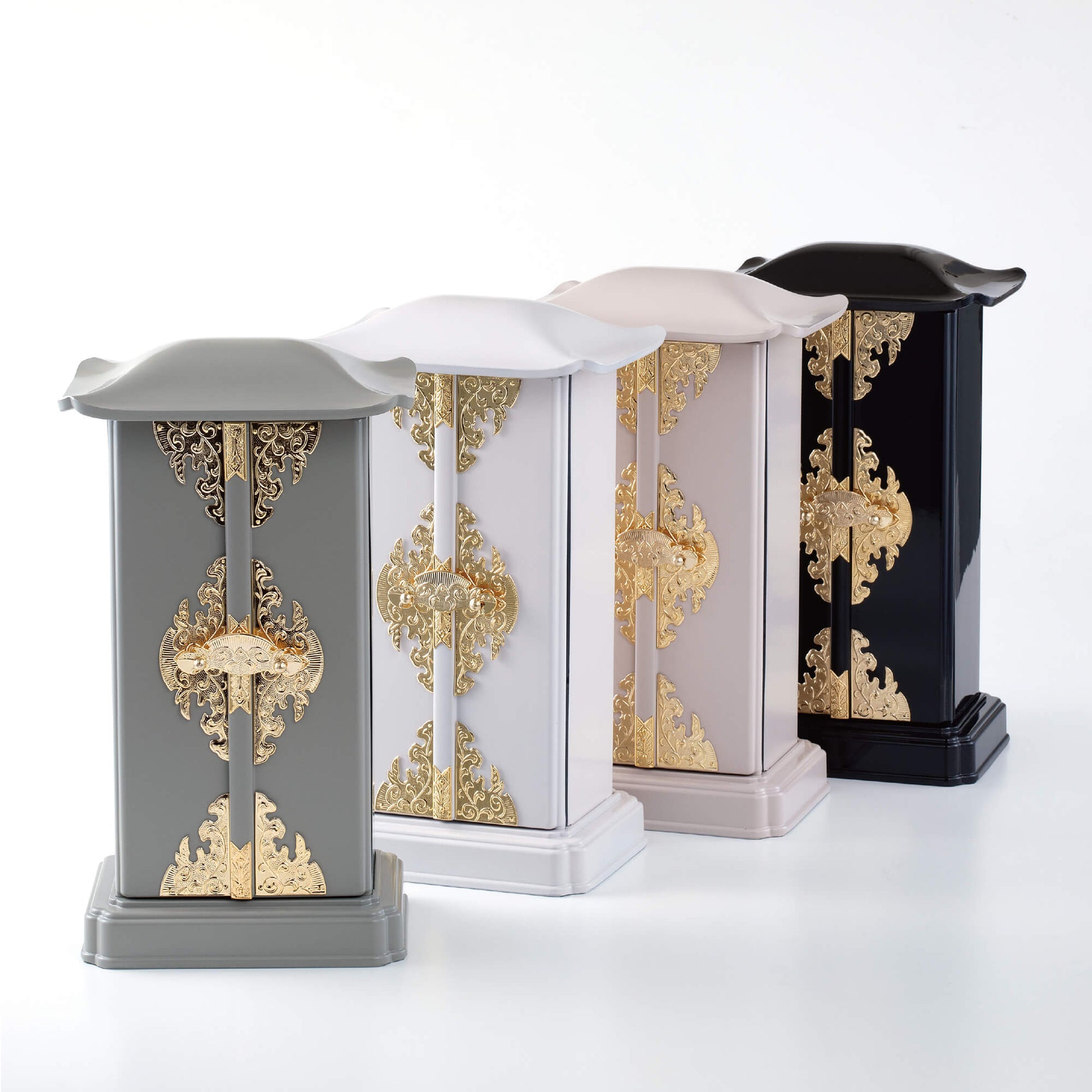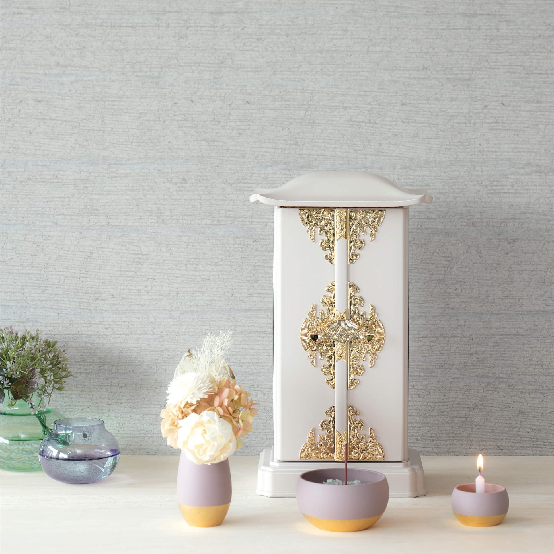 Questo compatto altare buddista è un tradizionale "zushi" (armadio sacrario) utilizzato per custodire immagini sacre, rifinito con colori e design moderni. È un altare moderno che si integra naturalmente con il tuo arredamento.