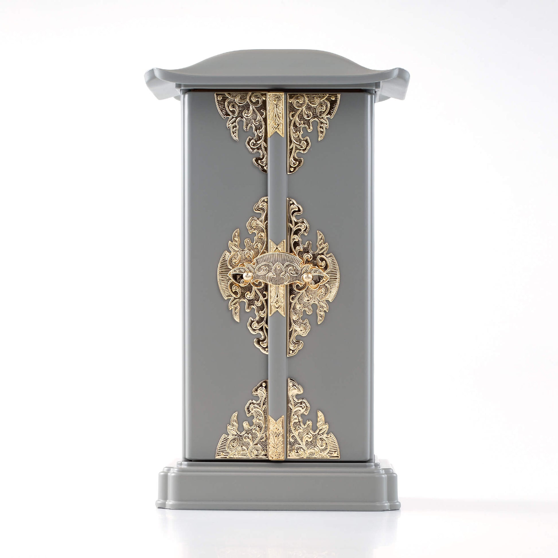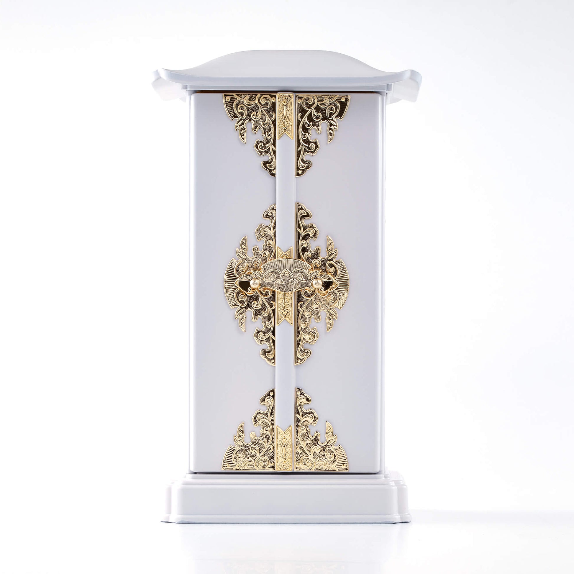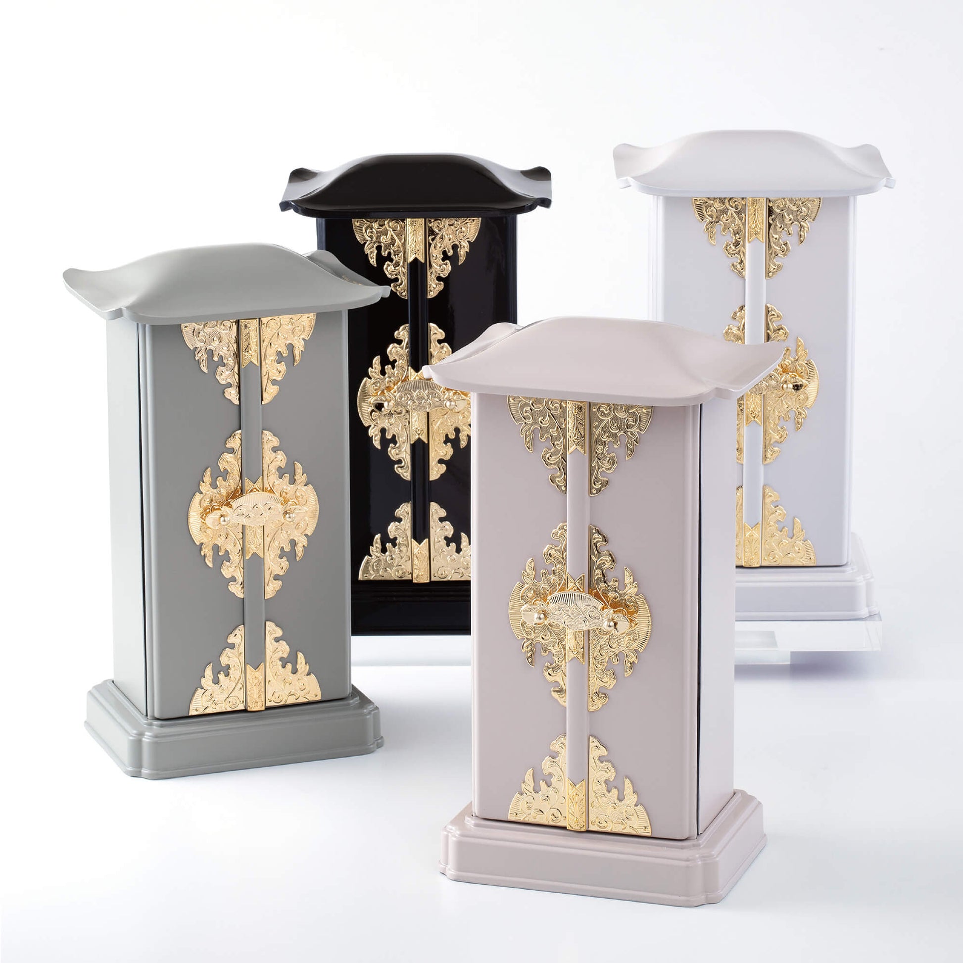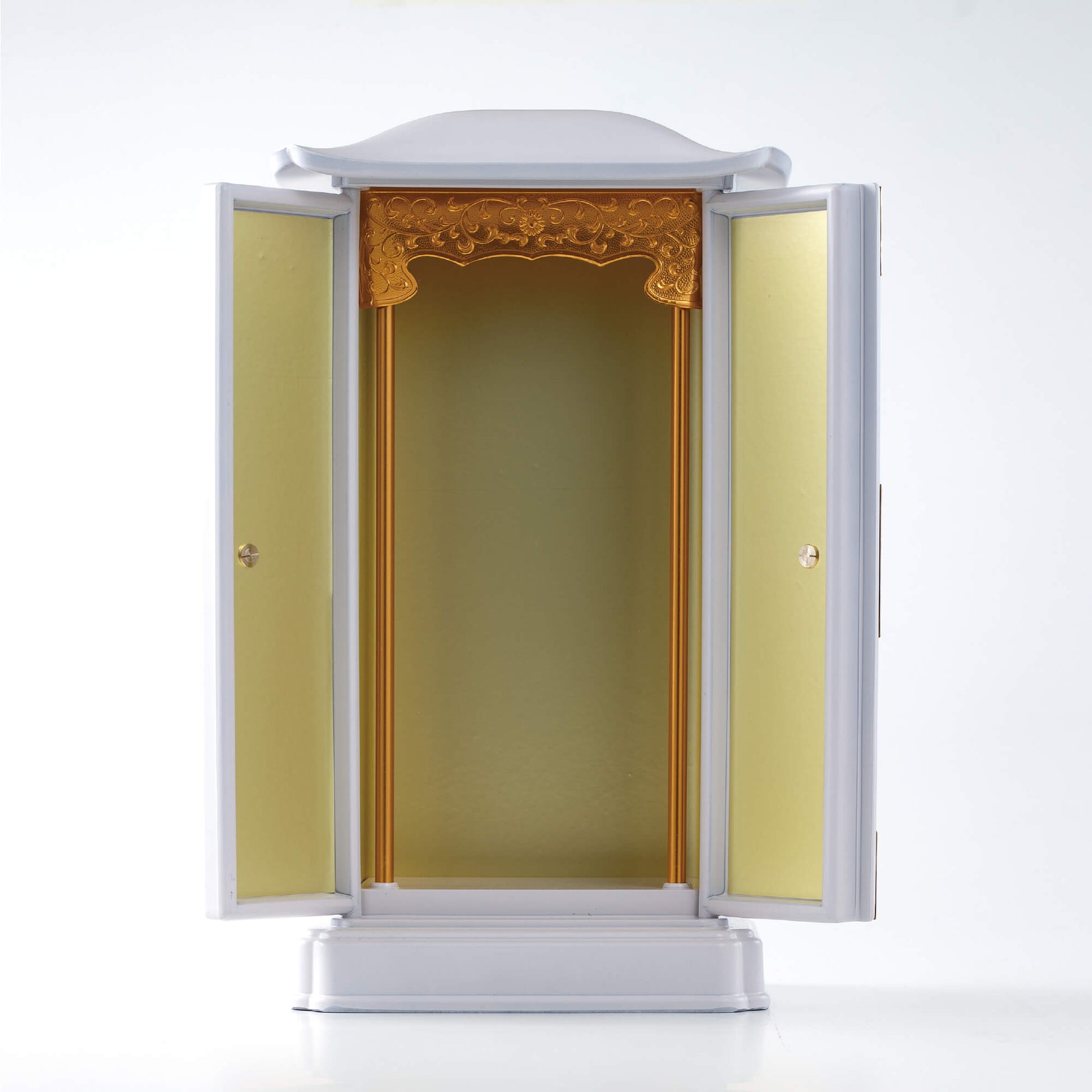 Questo compatto altare buddista è un tradizionale "zushi" (armadio sacrario) utilizzato per custodire immagini sacre, rifinito con colori e design moderni. È un altare moderno che si integra naturalmente con il tuo arredamento.