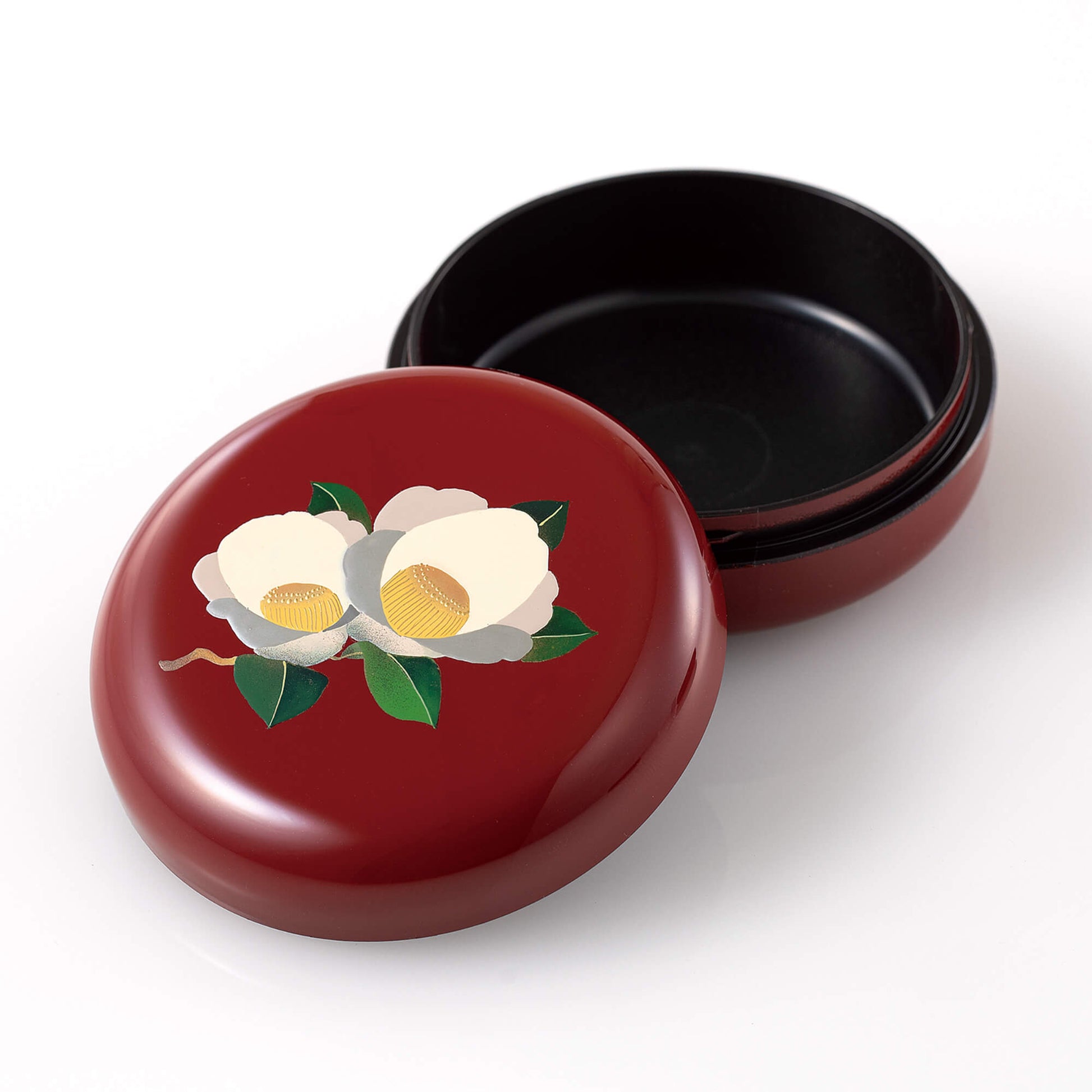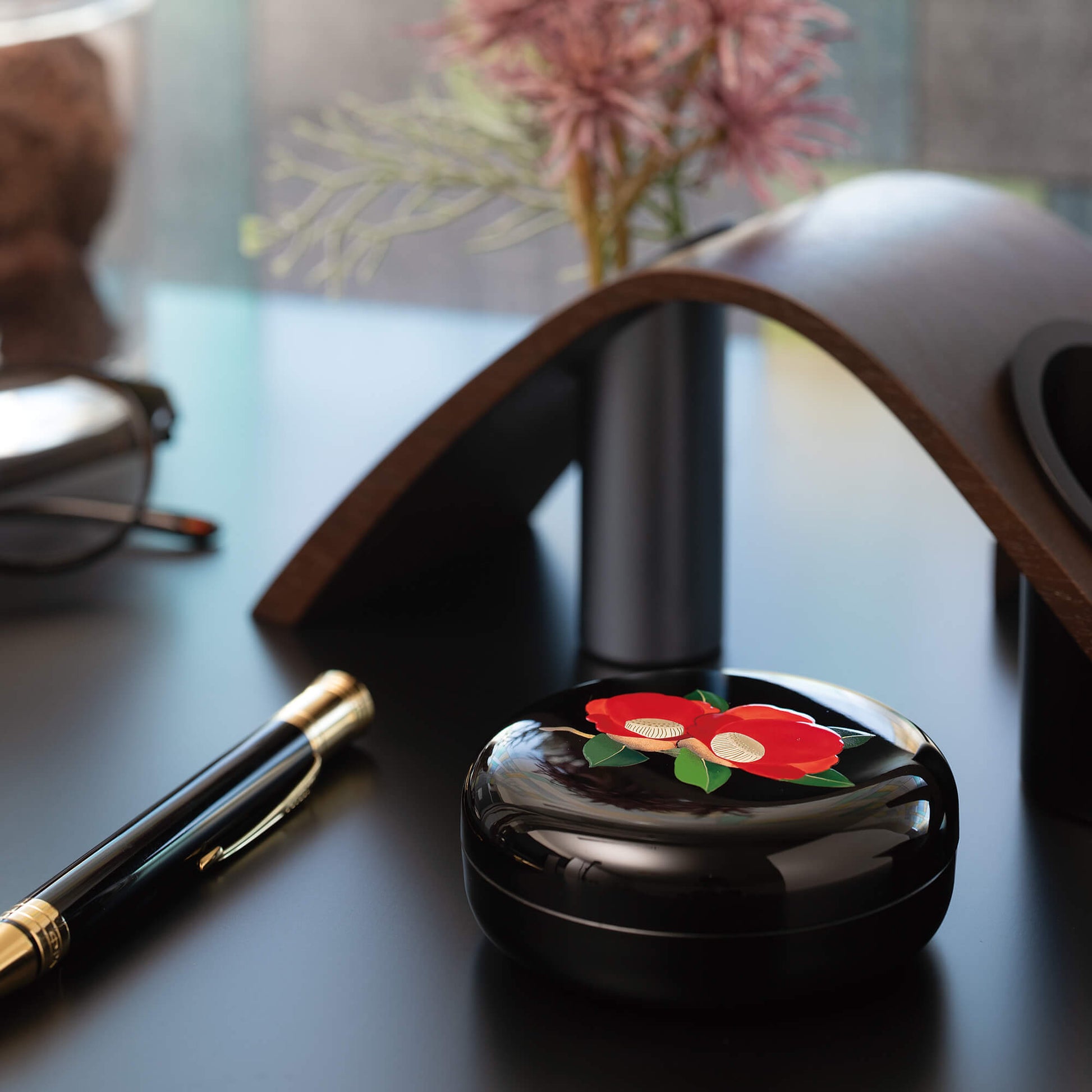 I fiori bianchi di camelia sono dipinti con audacia su uno sfondo vermiglio. La splendida colorazione, opera di un artista maki-e, rende questo dipinto un capolavoro acquistabile solo qui.