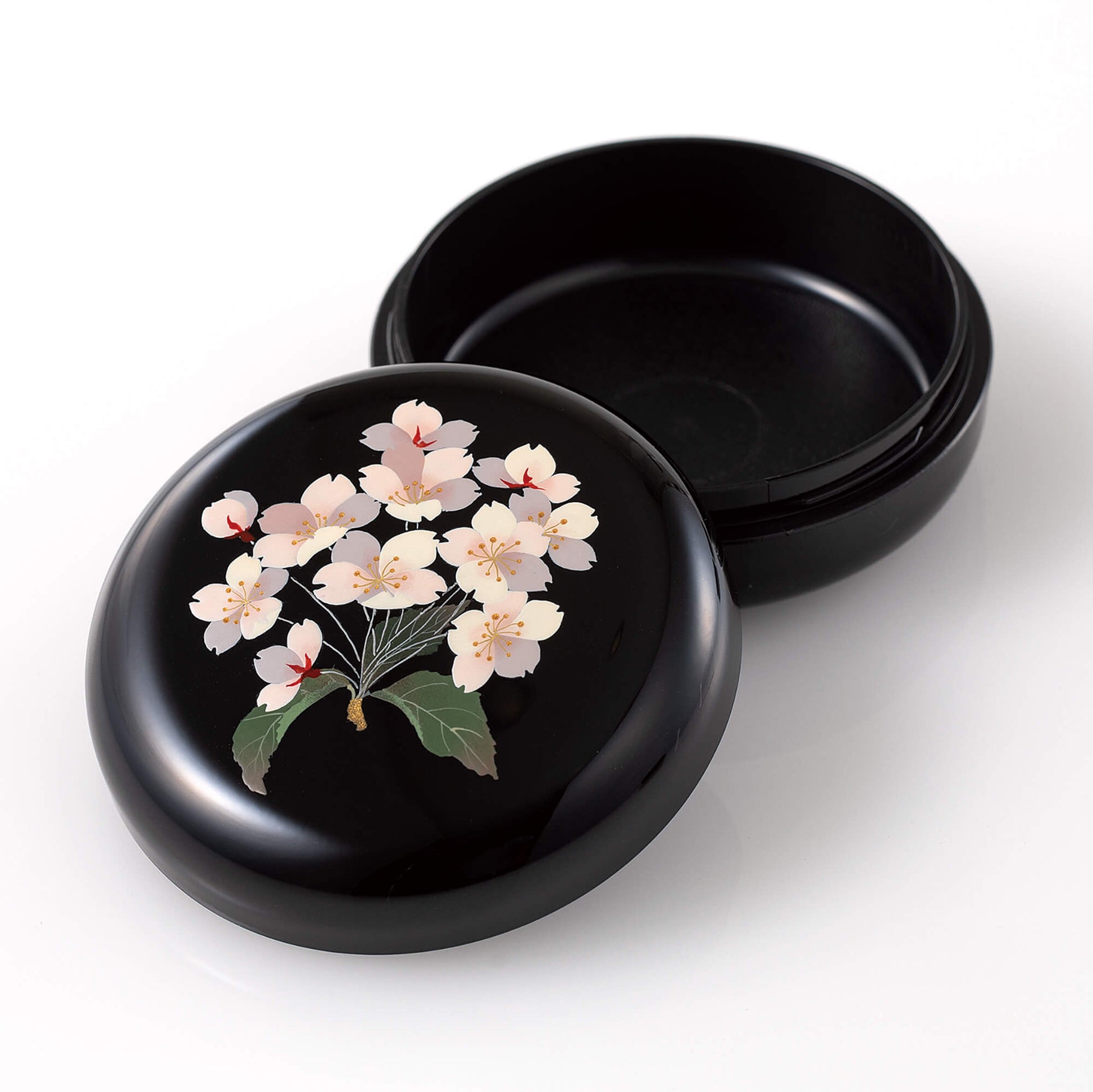 I fiori di ciliegio rosa sono decorati con maki-e su uno sfondo leggermente rossastro-marrone. Ogni petalo è dipinto con cura.