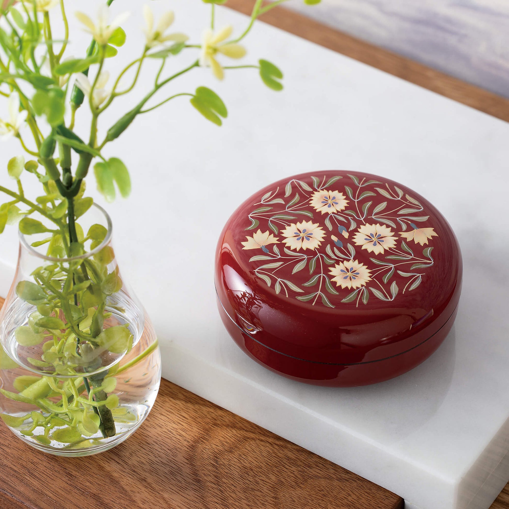 La base vermiglio è impreziosita da una laccatura a forma di garofano bianco sporco. Il significato del fiore di garofano bianco è "talento". Questo elegante pezzo è pieno di sentimenti per una persona amata talentuosa.