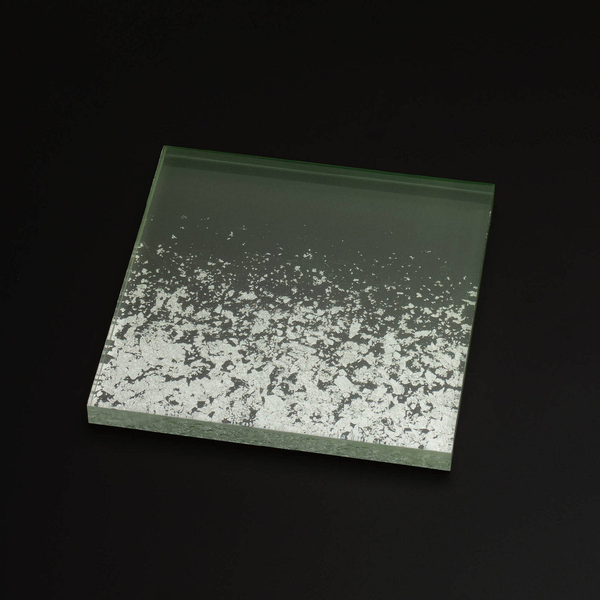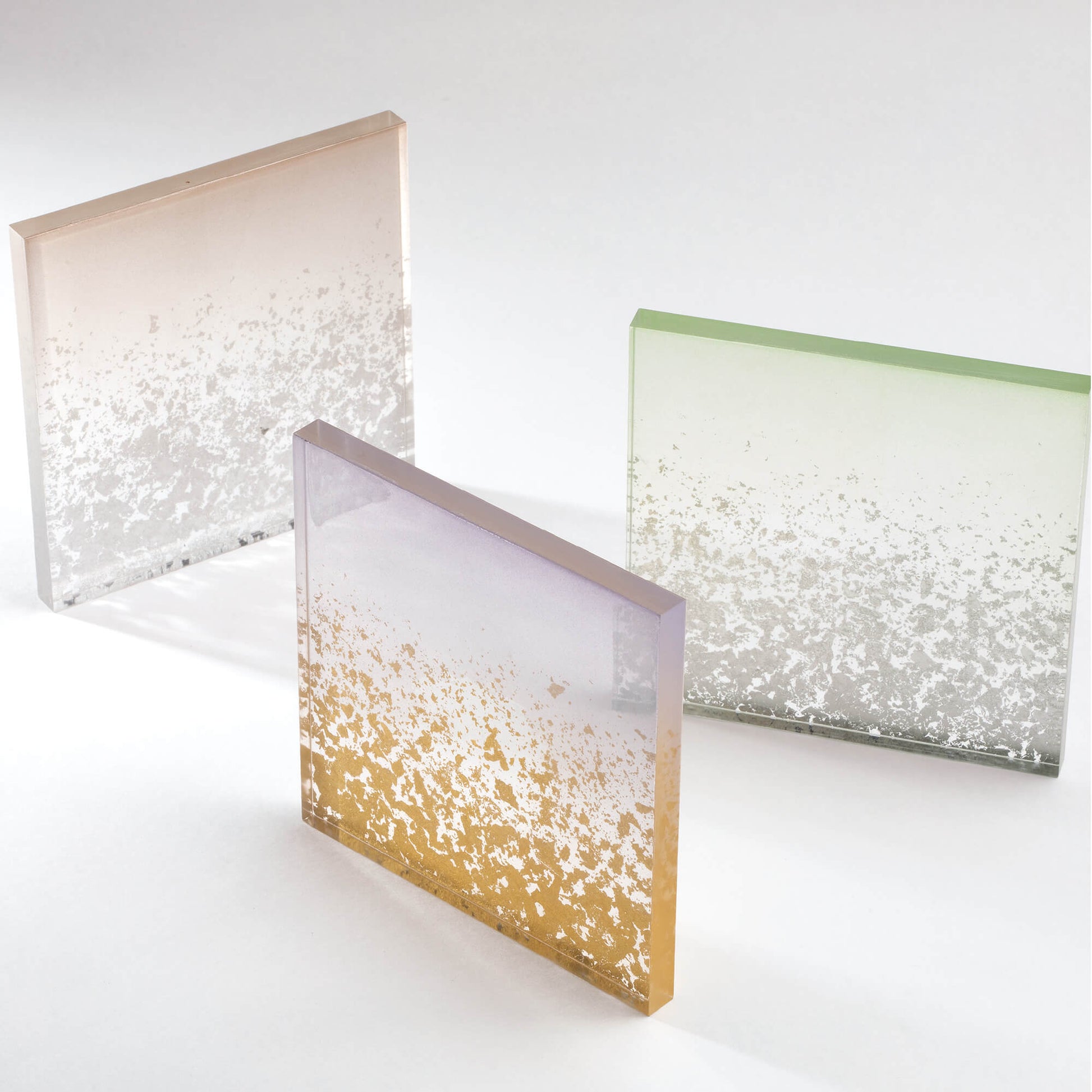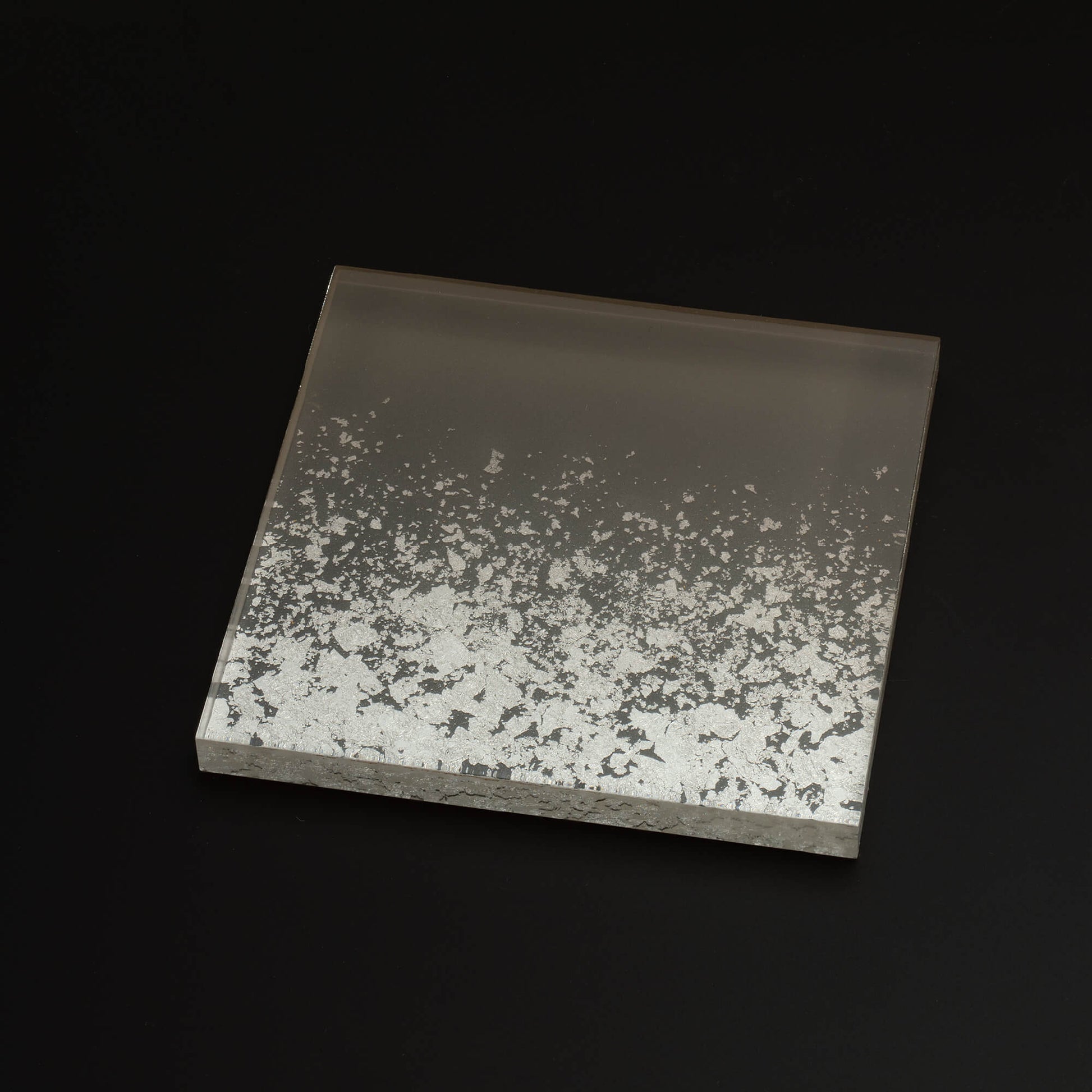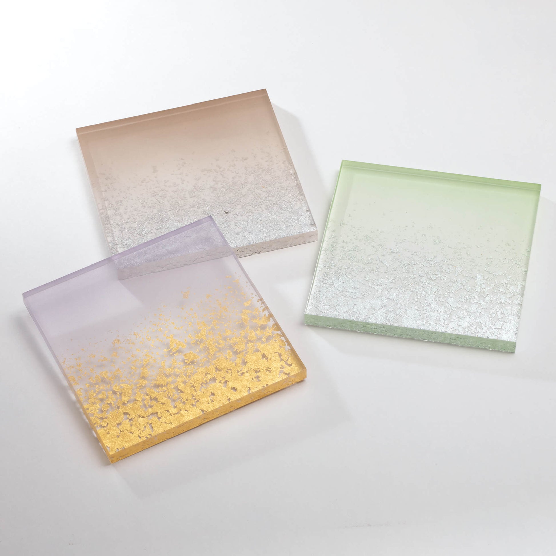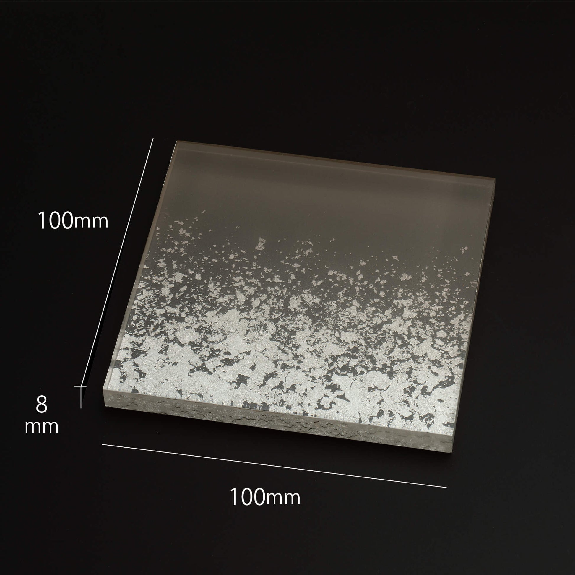 Questo piccolo contenitore quadrato da 100 mm combina l'aspetto futuristico dell'acrilico trasparente con le tracce del tempo lasciate dalla lamina screpolata. Le crepe d'oro, argento e rame che fluttuano nella trasparenza rappresentano "la traiettoria del cuore, che continua dal passato al presente e al futuro".