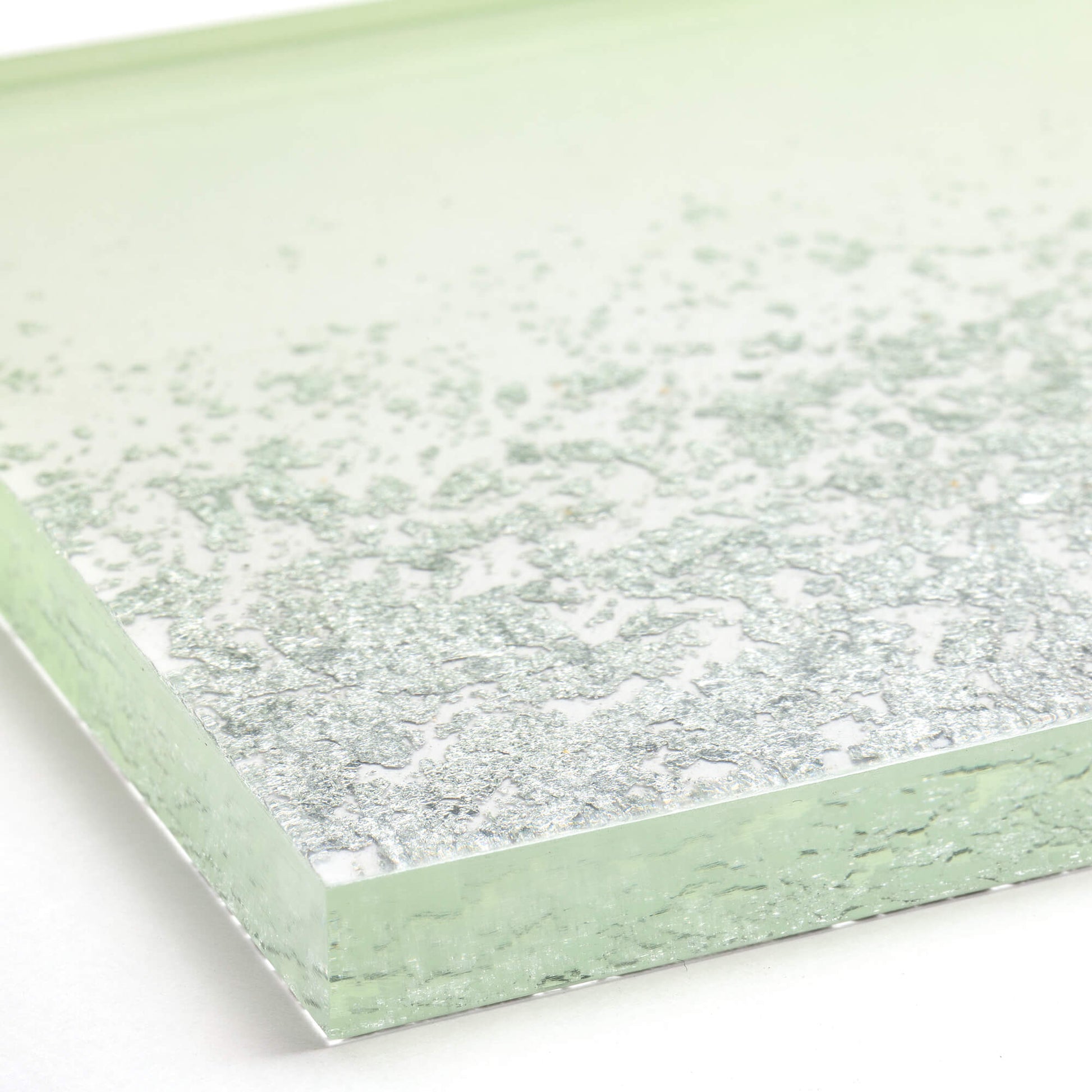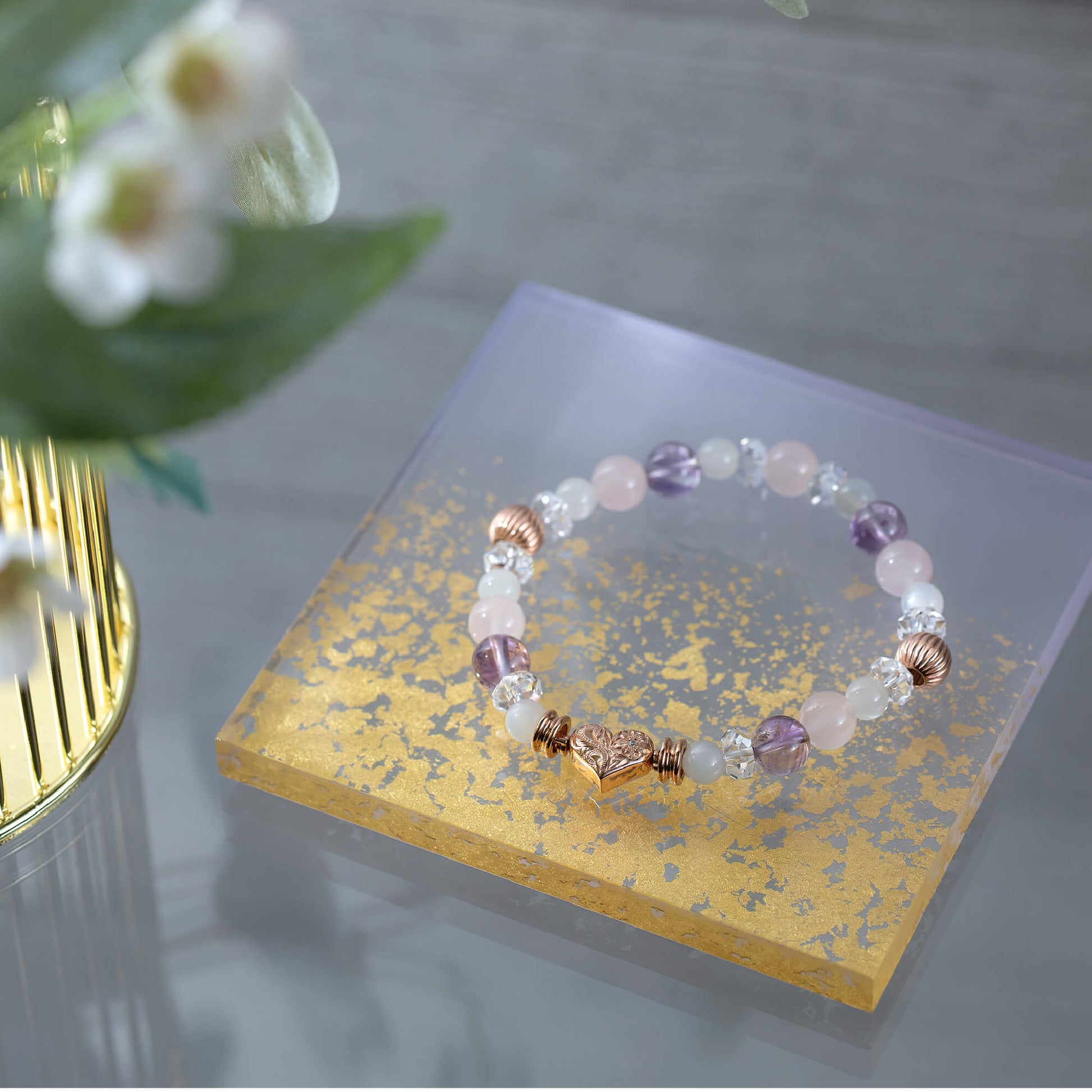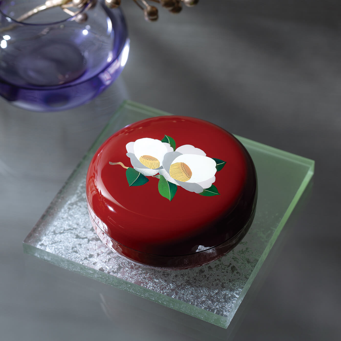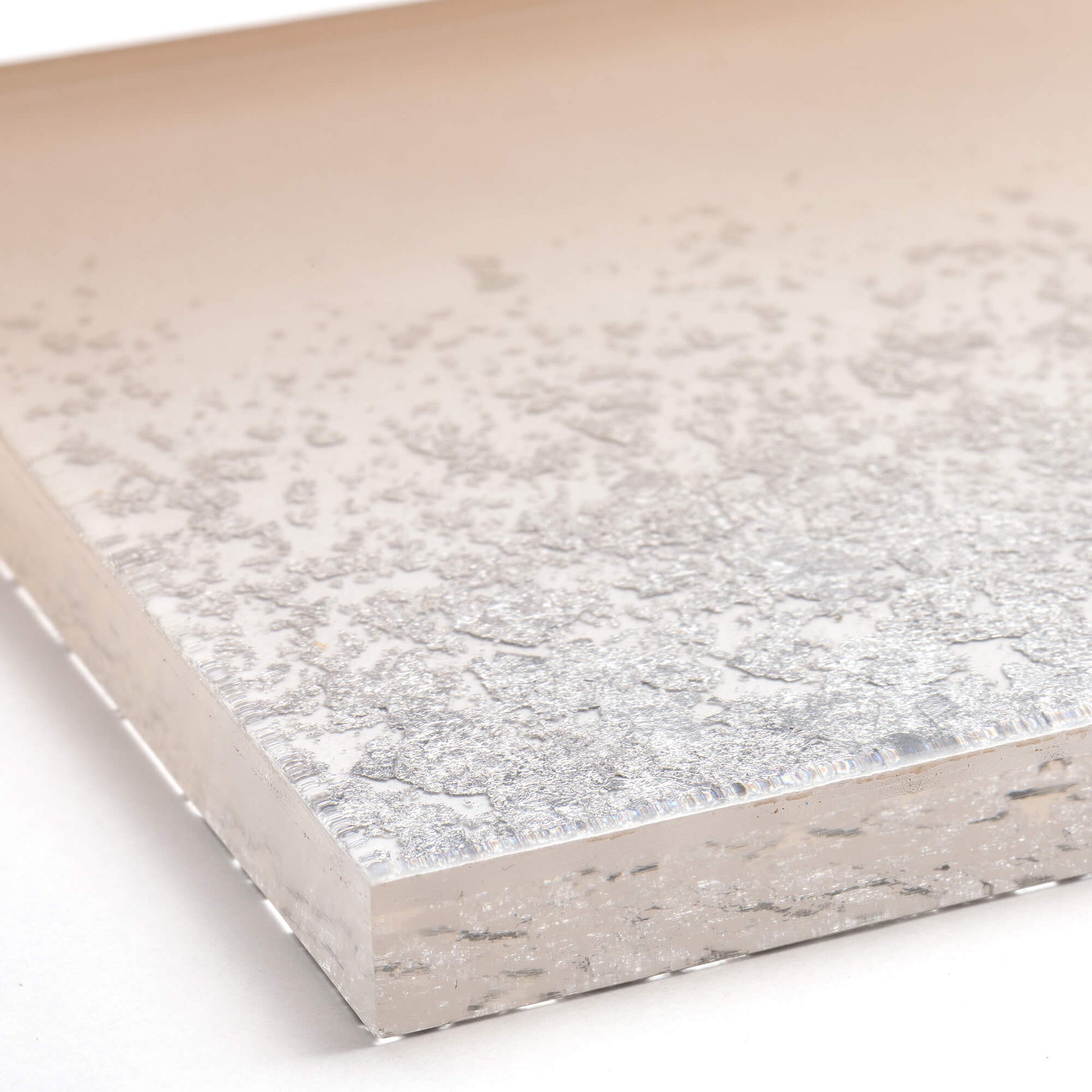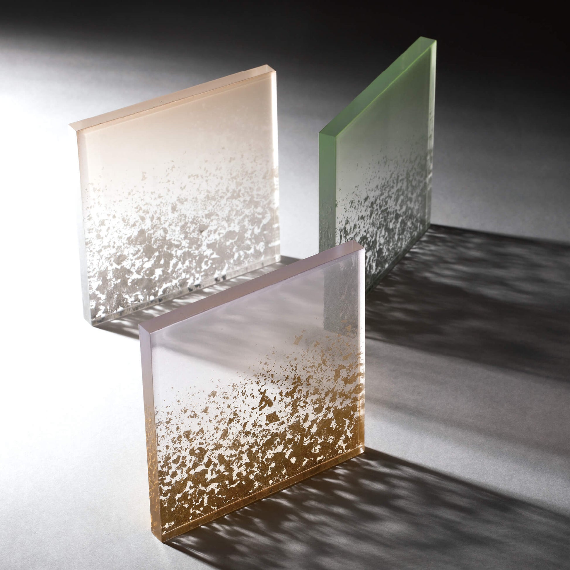 Questo piccolo contenitore quadrato da 100 mm combina l'aspetto futuristico dell'acrilico trasparente con le tracce del tempo lasciate dalla lamina screpolata. Le crepe d'oro, argento e rame che fluttuano nella trasparenza rappresentano "la traiettoria del cuore, che continua dal passato al presente e al futuro".