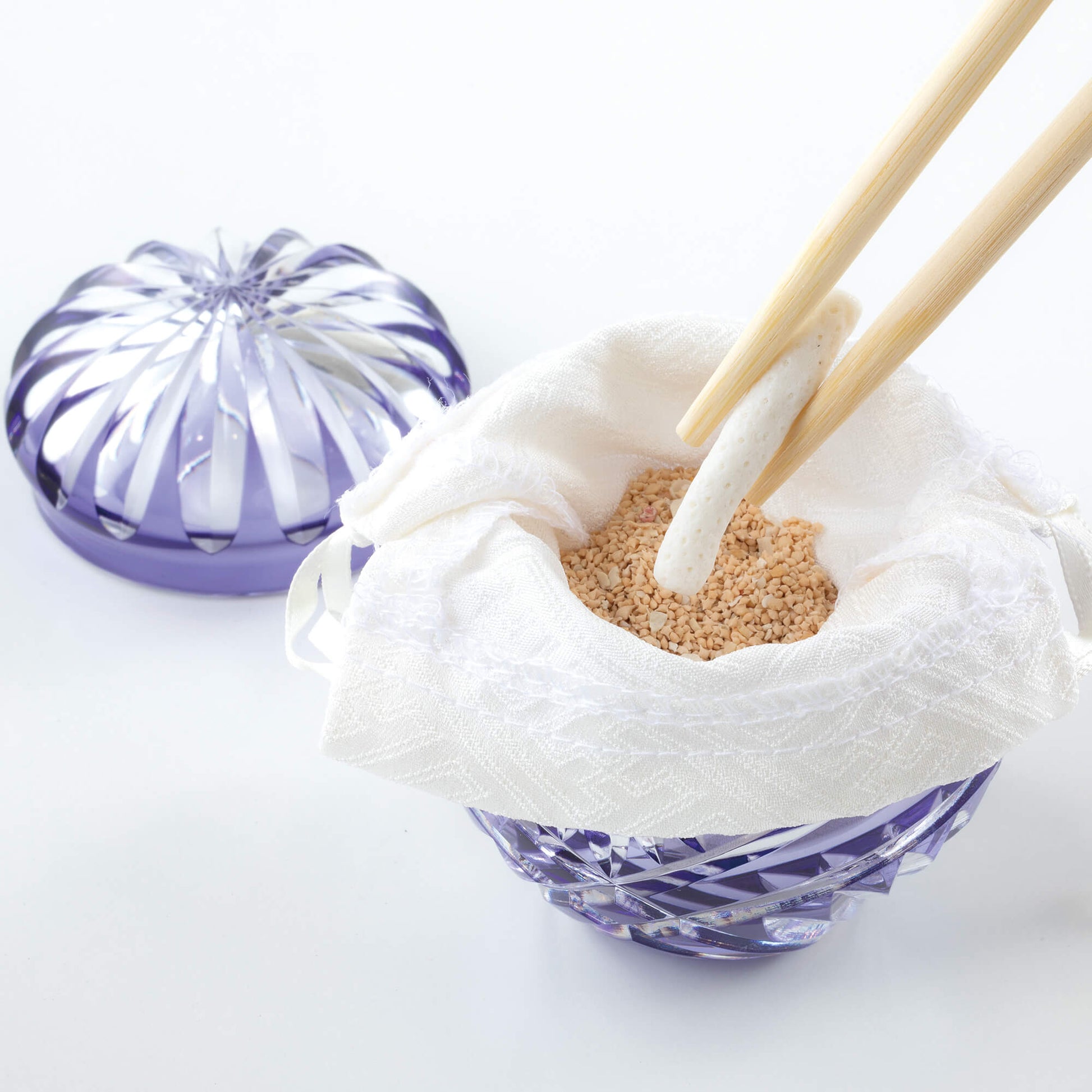日本の丹後ちりめんを使用した手作りのお骨用巾着が付属。お骨を安心してお納めください。