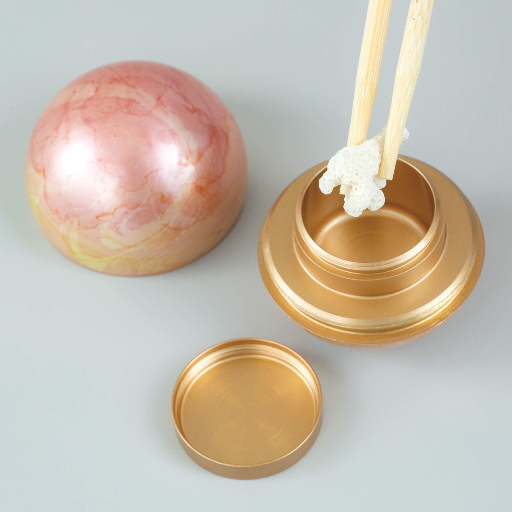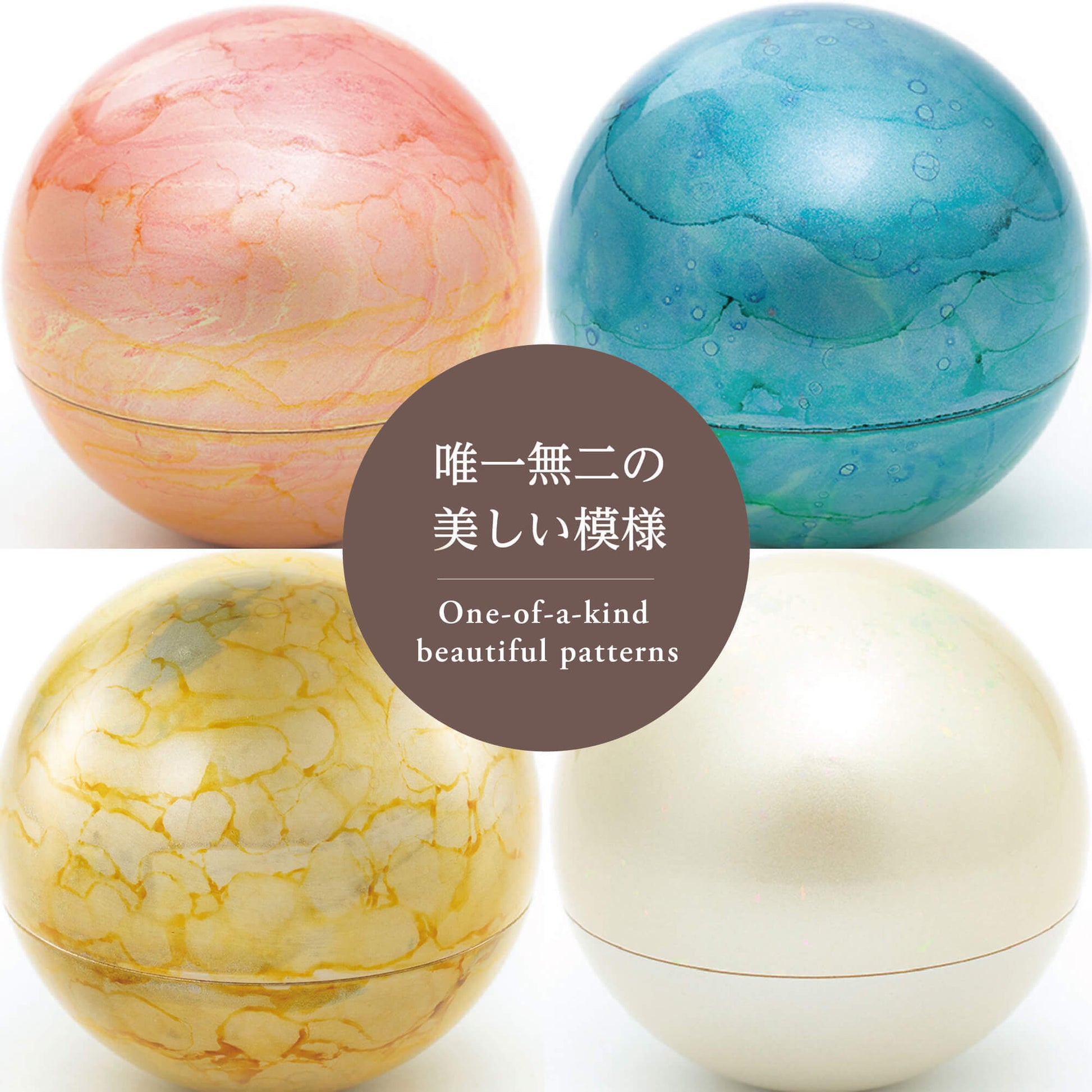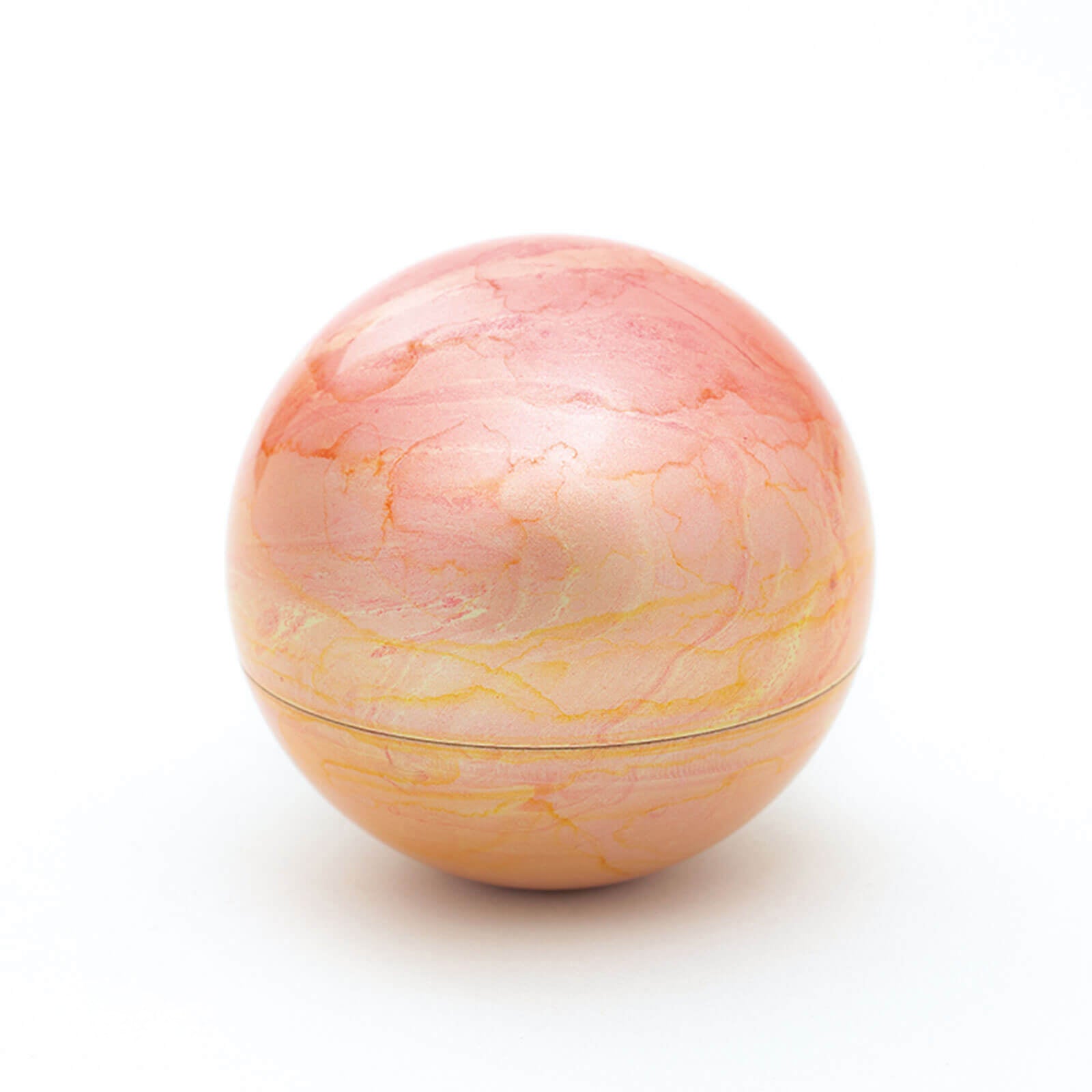 ミニ骨壷 こころぼしは、まん丸なデザインのお骨入れで、星をイメージしています。山口久乗謹製による、祈り百貨店オリジナルのデザインを製作いただきました。 4色をそろえたこころぼしは、それぞれ「春・夏・秋・冬」と銘打ちました。春(ピンク)、夏(ブルー)、秋(イエロー)の3色は、“墨流し染め”という着物の伝統技法を用いて、美しいマーブル模様に仕上げました。 冬(ホワイト)は、光を反射する雲母という石を細かく砕いてまぶし、冬の陽に当たってきらきらと舞う粉雪を表現しています。 「こころぼし」は、日本の銅器の9割以上を製造する鋳造の町・富山県高岡市で製造しています。高岡銅器の着色職人の技が光る逸品。 蓋が二重になっているので、ふとしたはずみで蓋が開きません。安心してお使いいただけます。