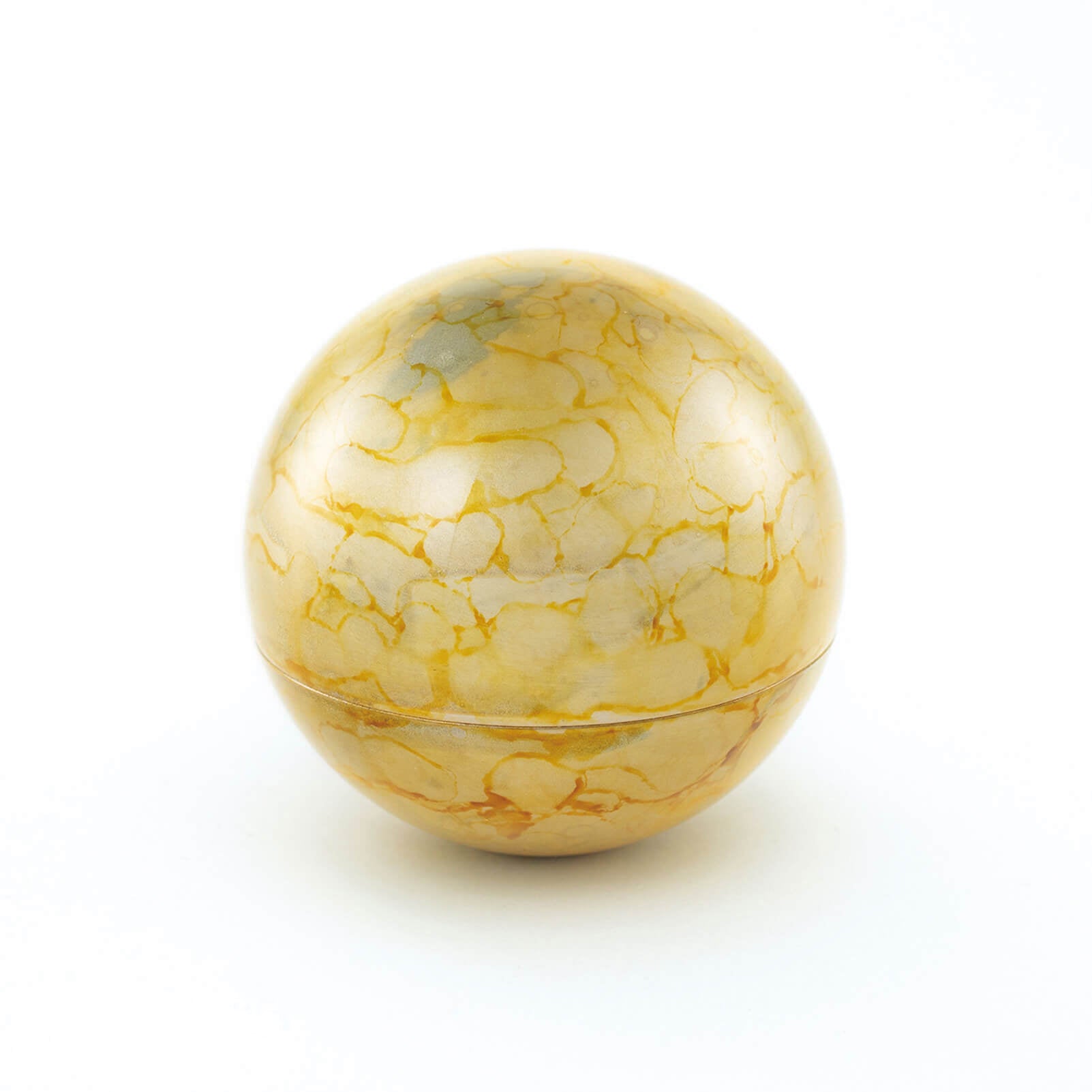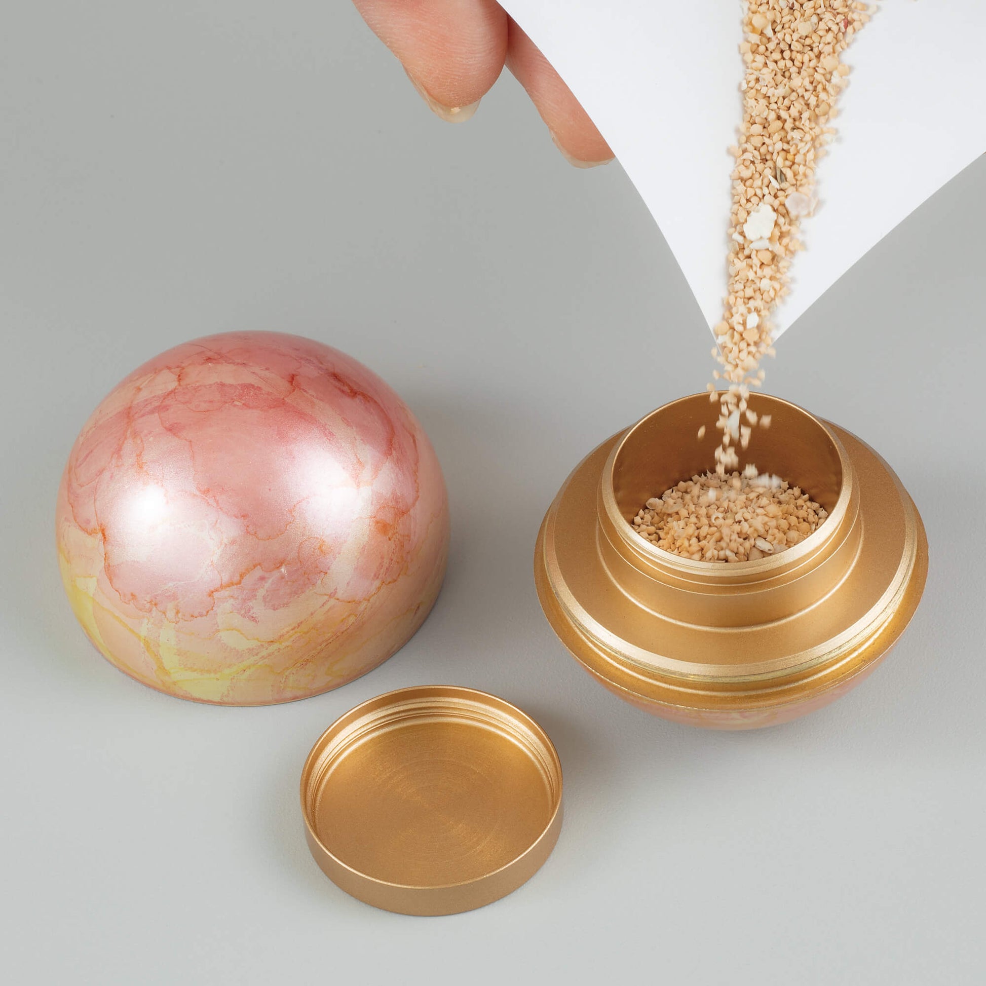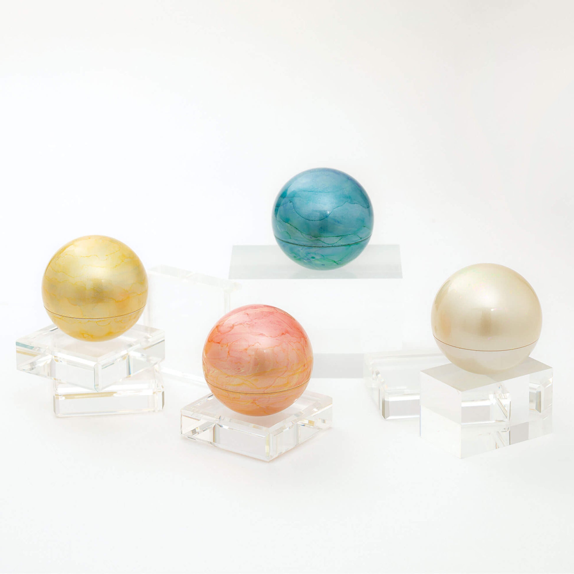 ミニ骨壷 こころぼしは、まん丸なデザインのお骨入れで、星をイメージしています。山口久乗謹製による、祈り百貨店オリジナルのデザインを製作いただきました。 4色をそろえたこころぼしは、それぞれ「春・夏・秋・冬」と銘打ちました。春(ピンク)、夏(ブルー)、秋(イエロー)の3色は、“墨流し染め”という着物の伝統技法を用いて、美しいマーブル模様に仕上げました。 冬(ホワイト)は、光を反射する雲母という石を細かく砕いてまぶし、冬の陽に当たってきらきらと舞う粉雪を表現しています。 「こころぼし」は、日本の銅器の9割以上を製造する鋳造の町・富山県高岡市で製造しています。高岡銅器の着色職人の技が光る逸品。 蓋が二重になっているので、ふとしたはずみで蓋が開きません。安心してお使いいただけます。
