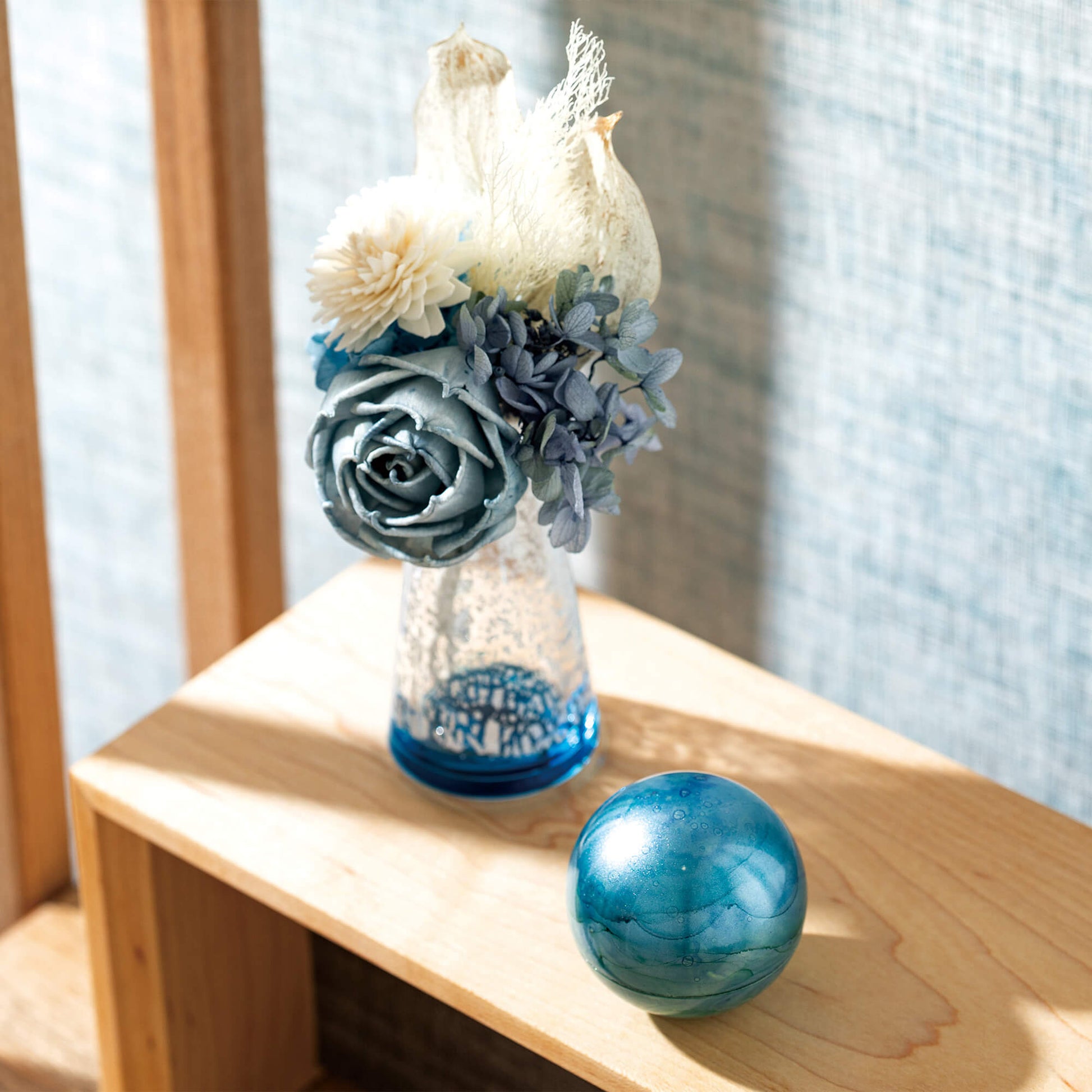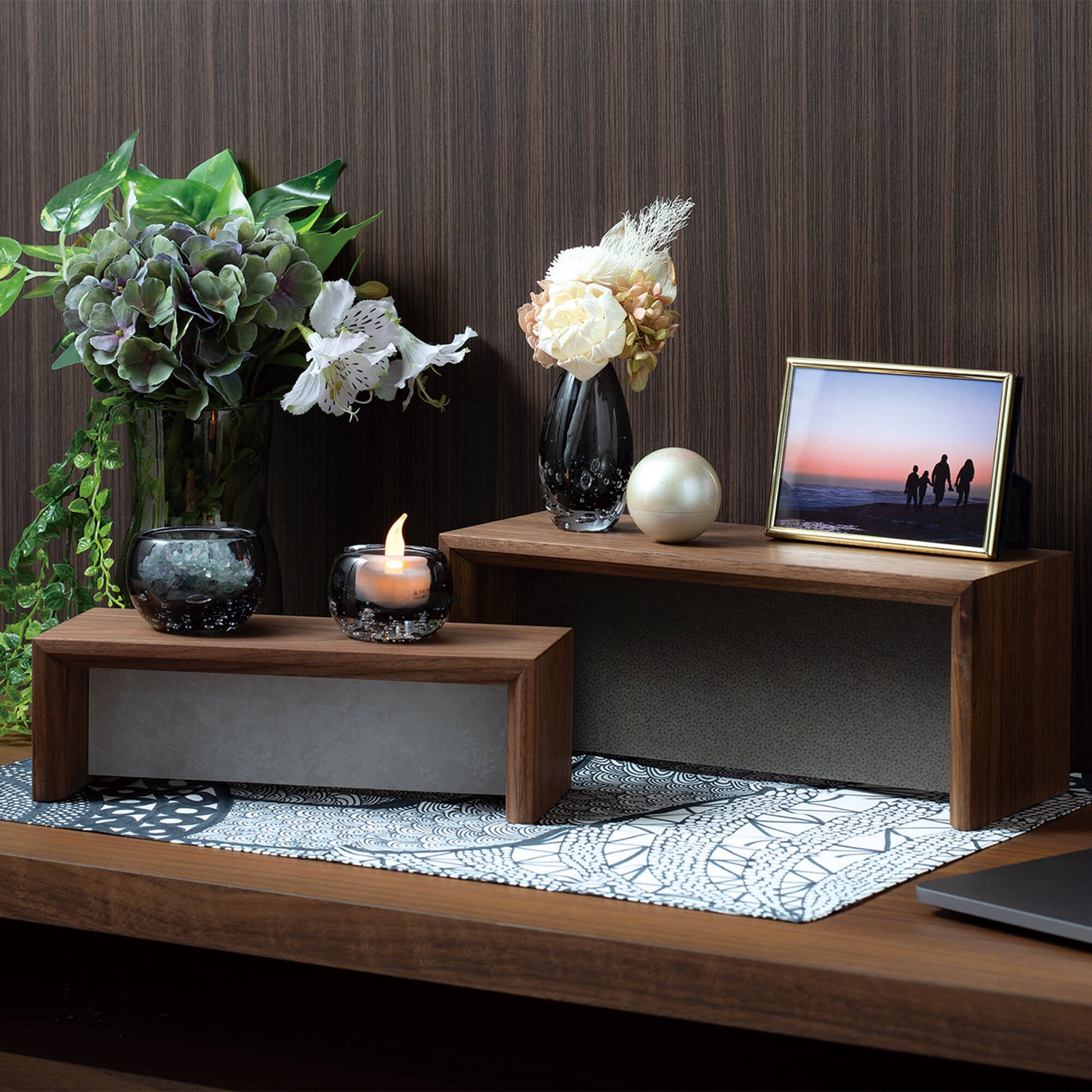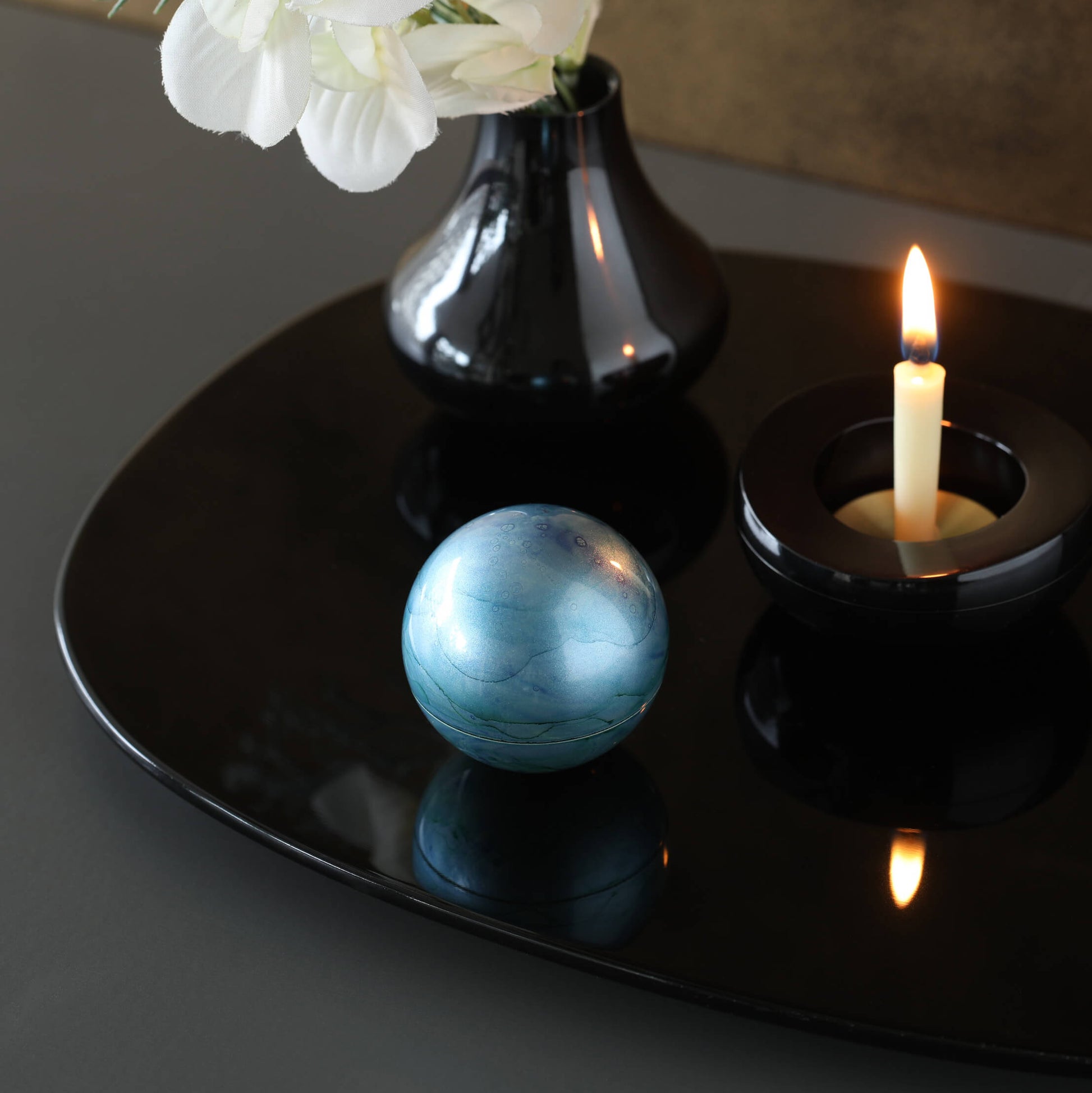 ↑ステージと仏具をブラックで統一することで、ブルーのミニ骨壷が一層引き立つコーディネートです。