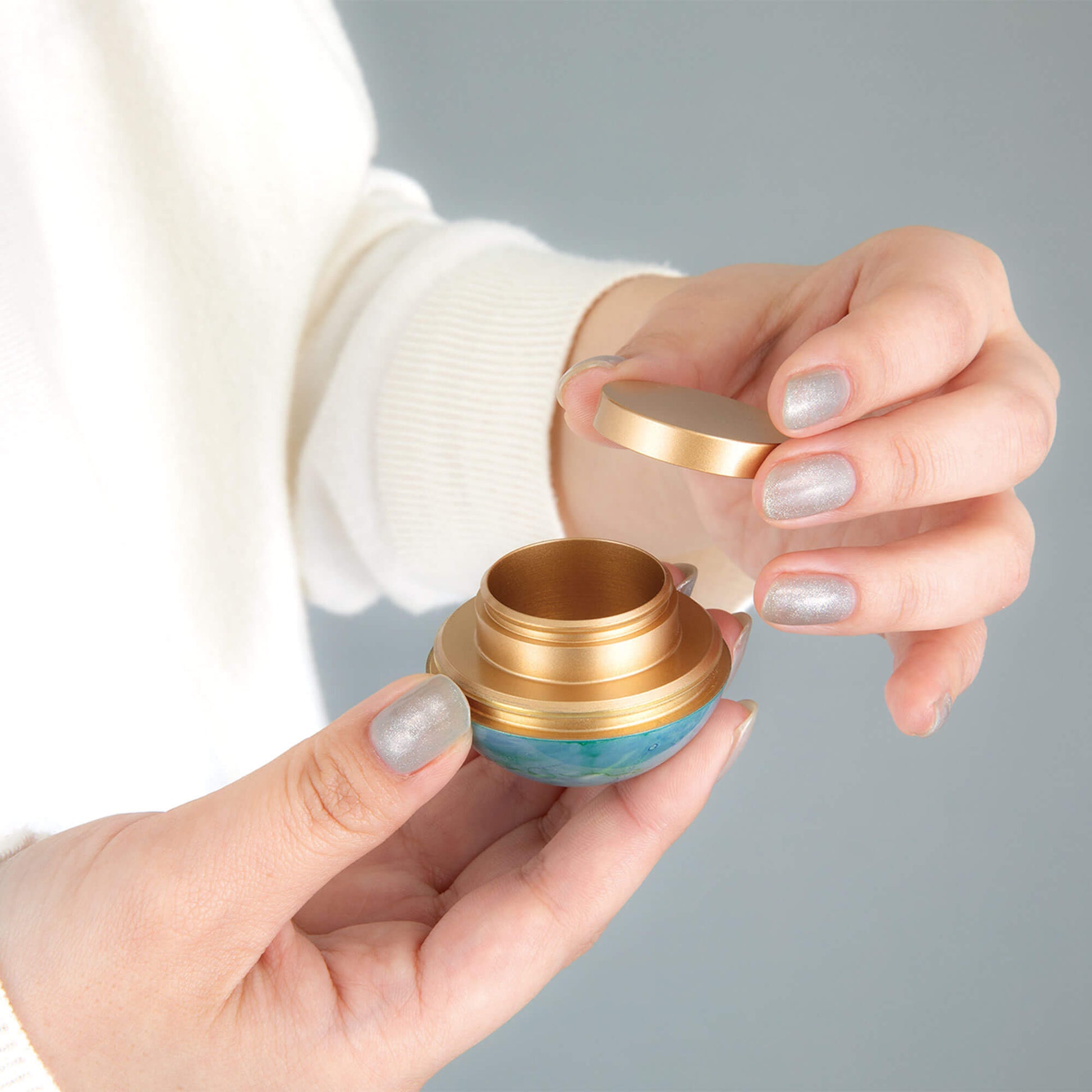 ↑このアイテムは手のひらにすっぽりとおさまるサイズで、不安な時には優しく握ることで落ち着きを感じることができます。真鍮製であり、蓋が二重になっているため、うっかり落としても蓋が開いて中身がこぼれる心配がありません。安心してお使いいただけます。