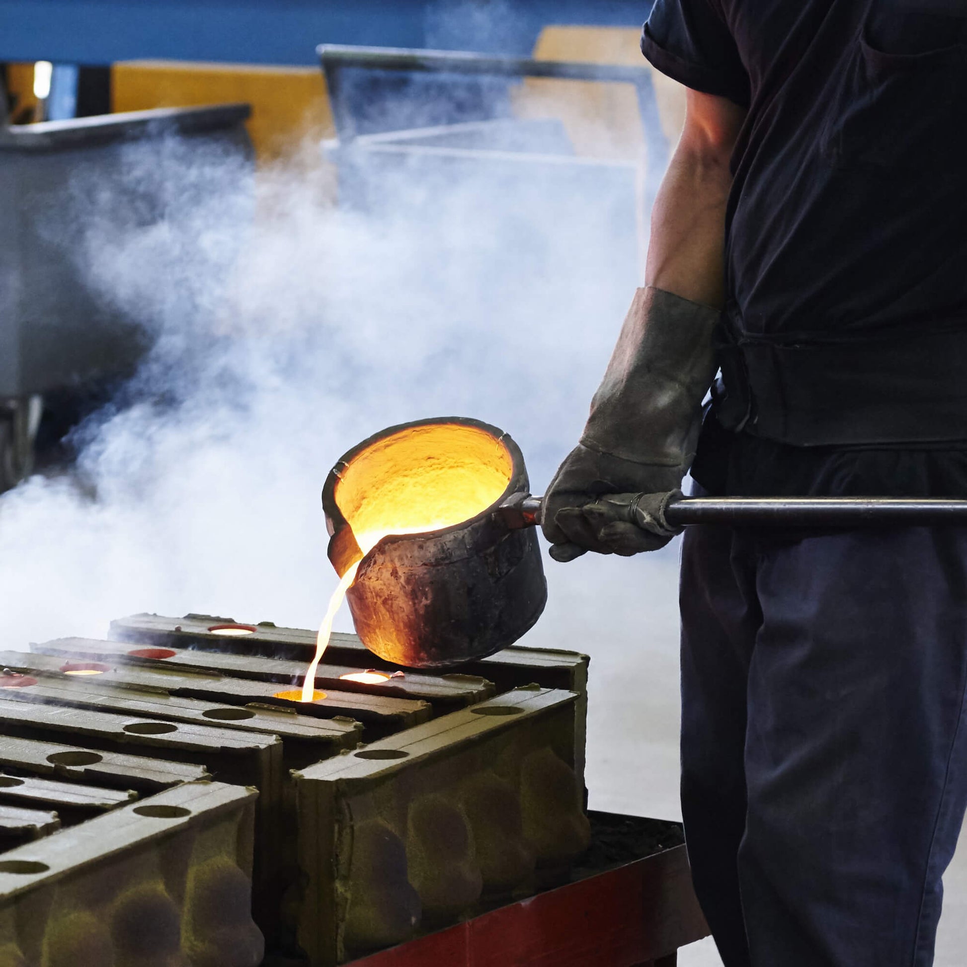 ↑溶かした金属を型に流し込む作業