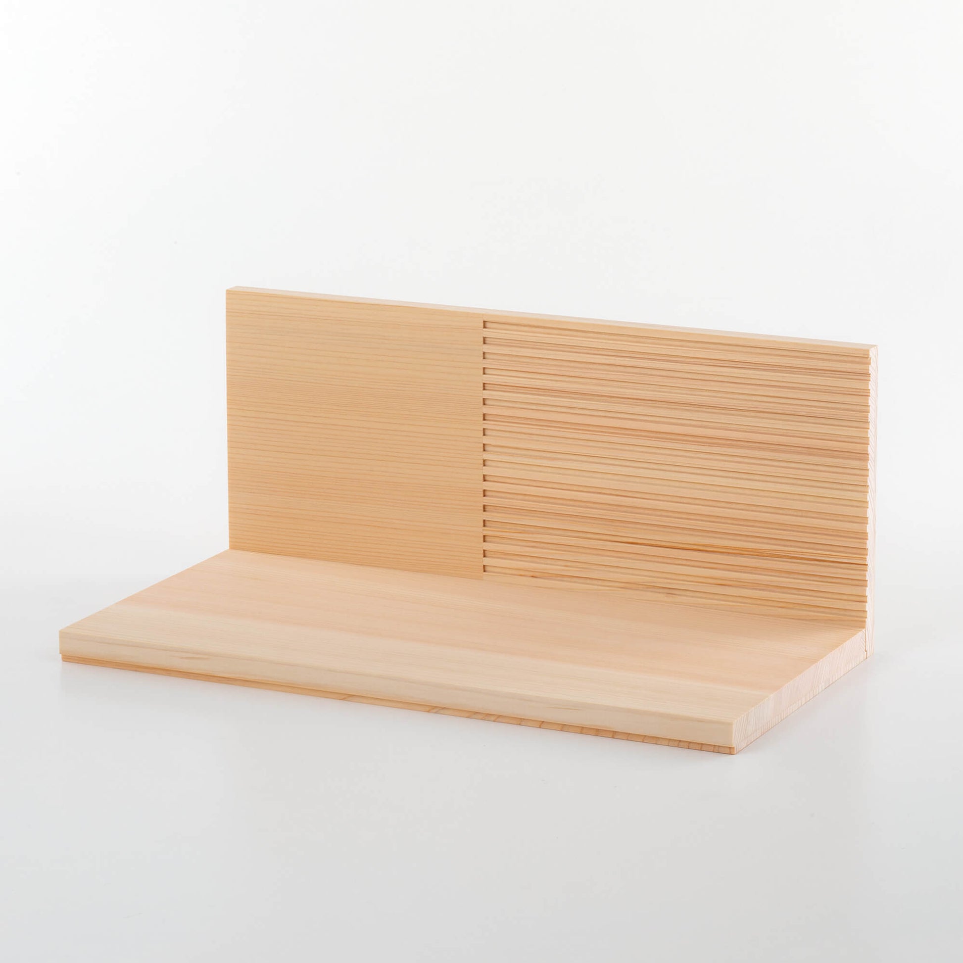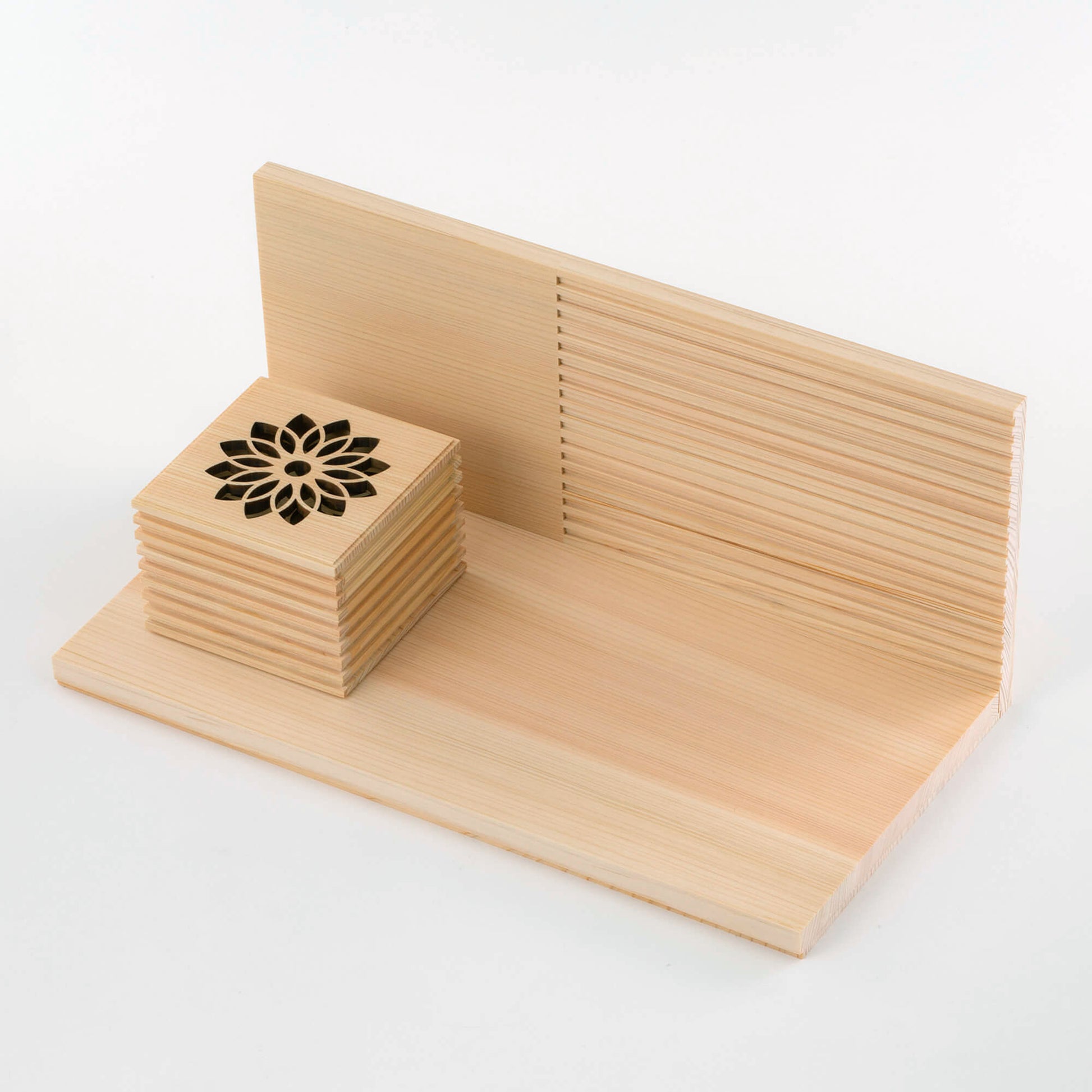 【手元供養ステージ】こゆりシリーズ「ライン」は、神社仏閣等広く使われているヒノキを採用いたしました。箱を開けるとほんのりとヒノキの香りに包まれます。シンプルなデザインを目指しながらも、日本人の持つ伝統や文化が感じられるような、ステージ=舞台をイメージしました。ヒノキの生命の証である、年輪の横の目を綺麗に生かしステージへの想いを込めました。舞台ですので、色々な組み合わせでお使い下さい。