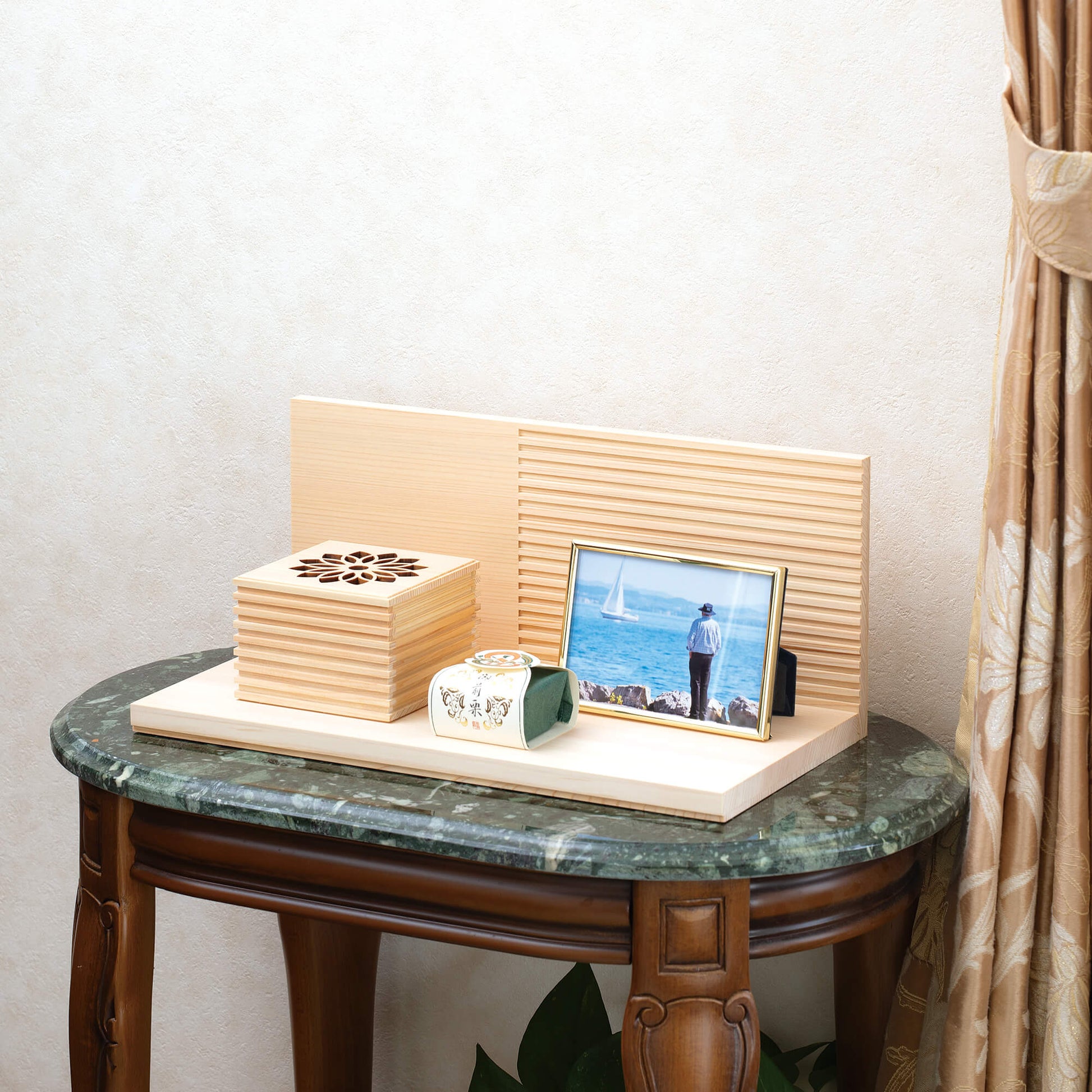 ↑大切な形見やお骨を納められる、同シリーズのすかし箱との組み合わせ。
