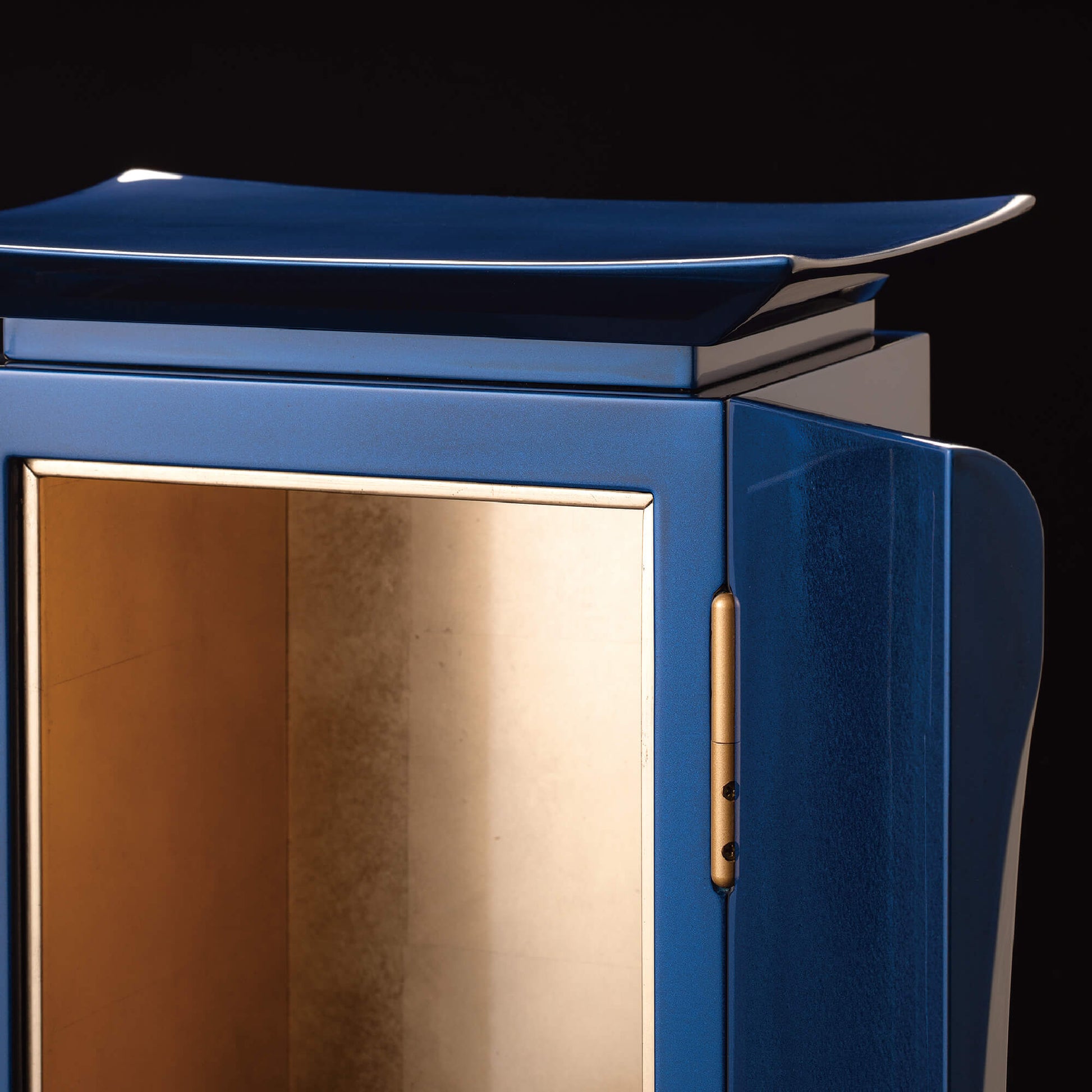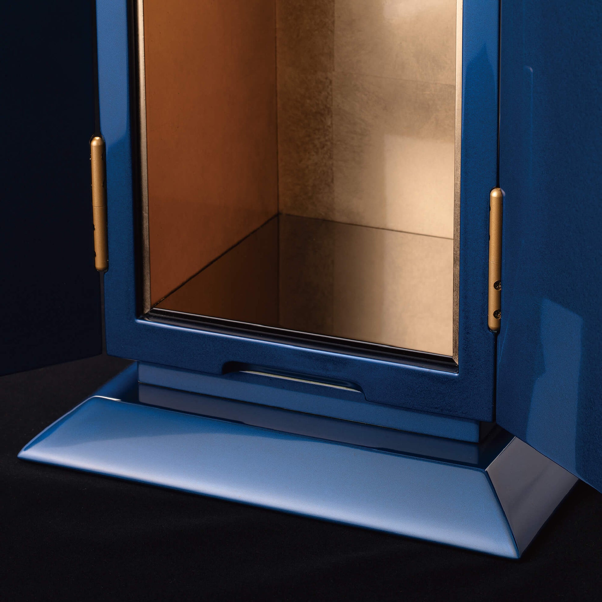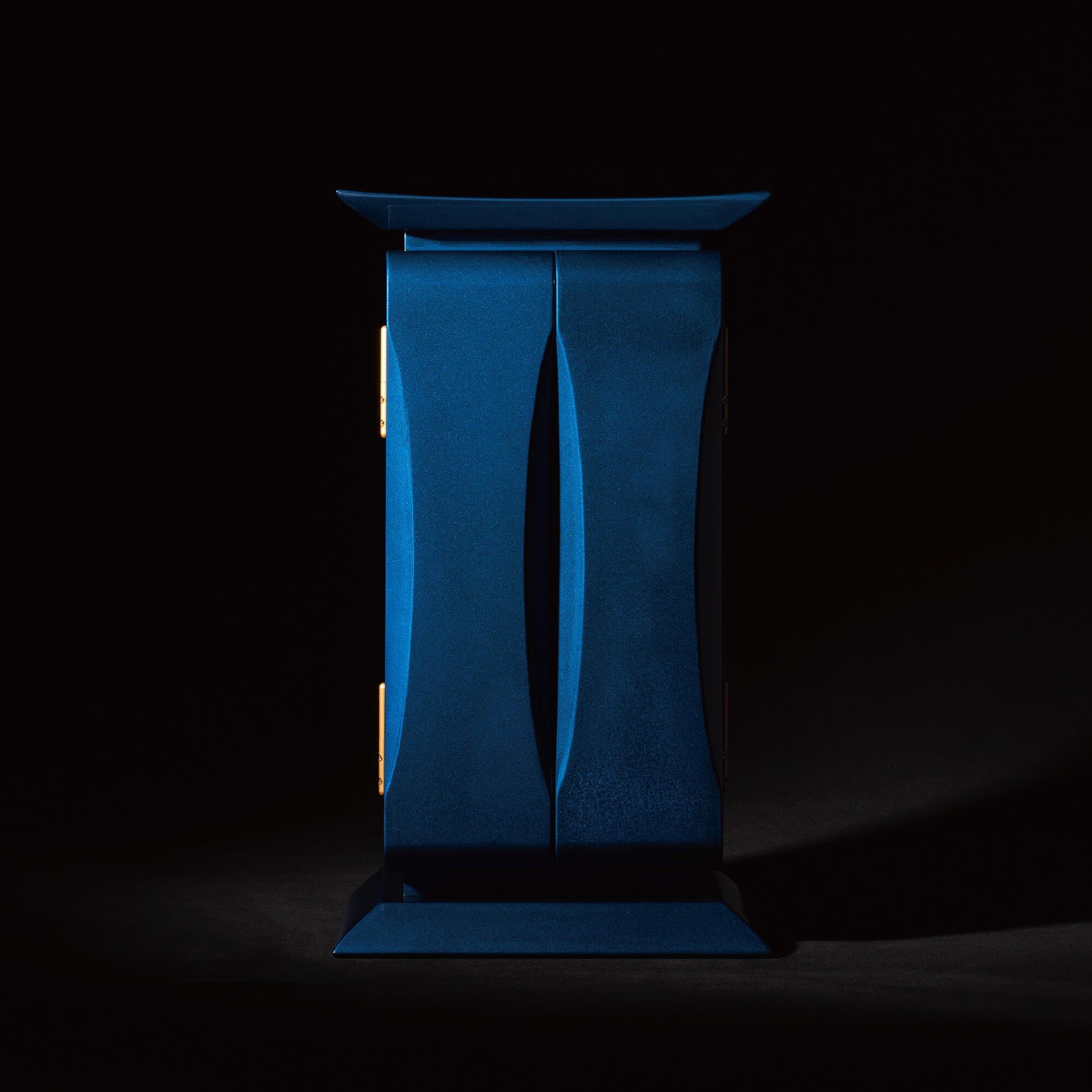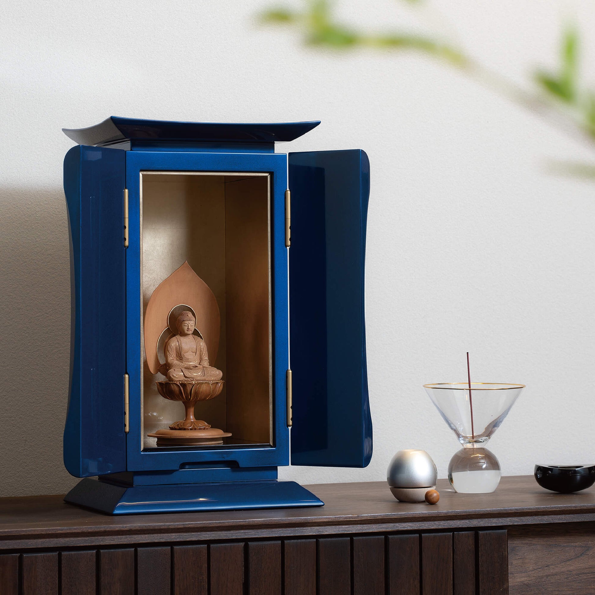 濃青は、仏教において智慧を象徴し、大いなる空「虚空(こくう)」を意味します。仏の慈悲がどこまでも広がるように、青漆の厨子は空へと続く道を表し、心を解き放ち、高みへと導いてくれます。