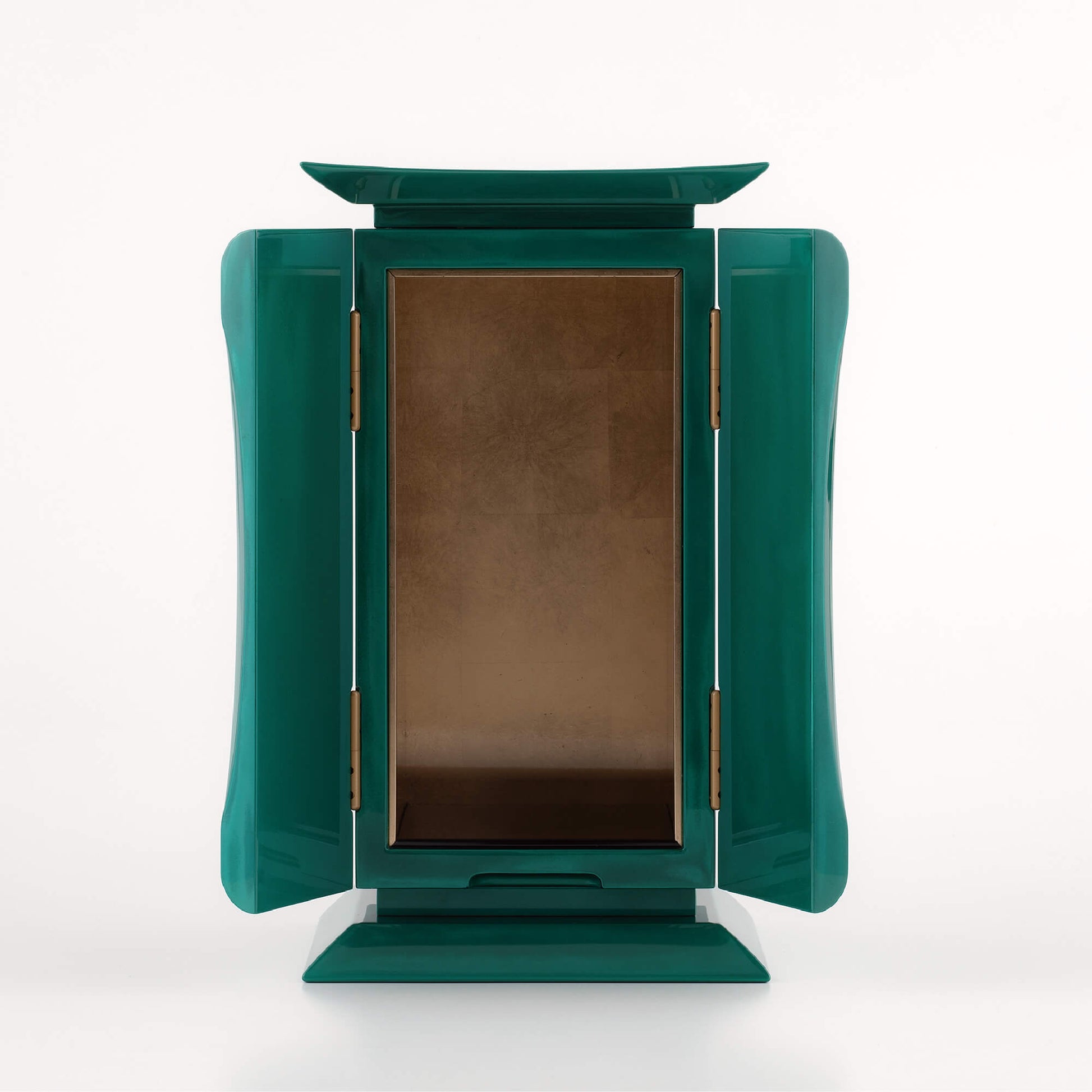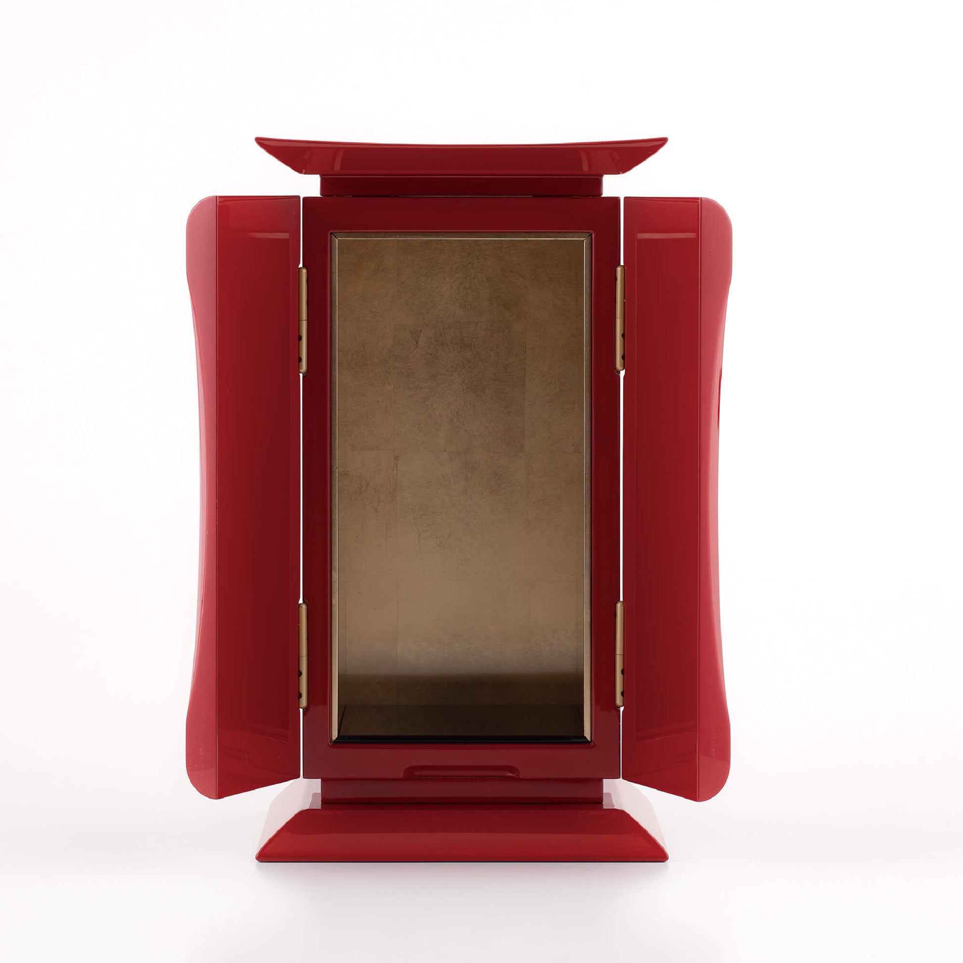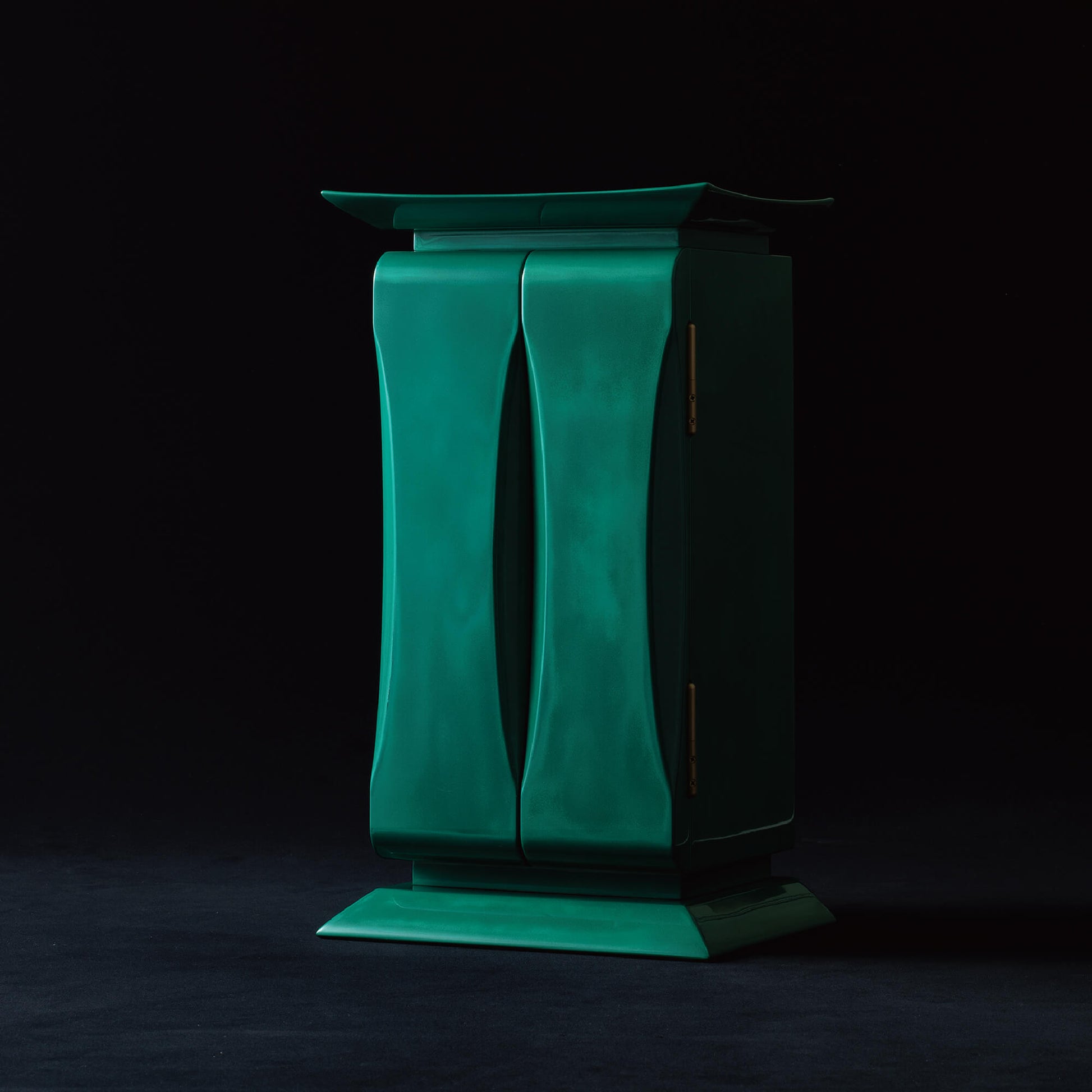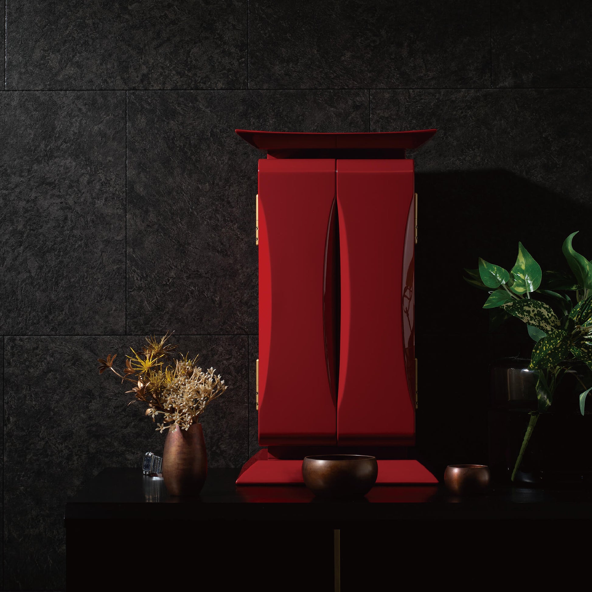 鹿児島県南九州市に伝わる伝統工芸、川辺仏壇の技術によって生まれました。 鎌倉時代から続く仏壇の産地で、木地や彫刻、金具、蒔絵、漆塗りなど、それぞれの工程を専門の職人が分業で担い、一つひとつ丁寧に作り上げます。 刷毛で何度も塗り重ねる本漆は、深い艶と奥行きを生み出し、静かな存在感を宿します。 小さな厨子の中に、川辺の職人たちが受け継いできた技と心が息づいています。