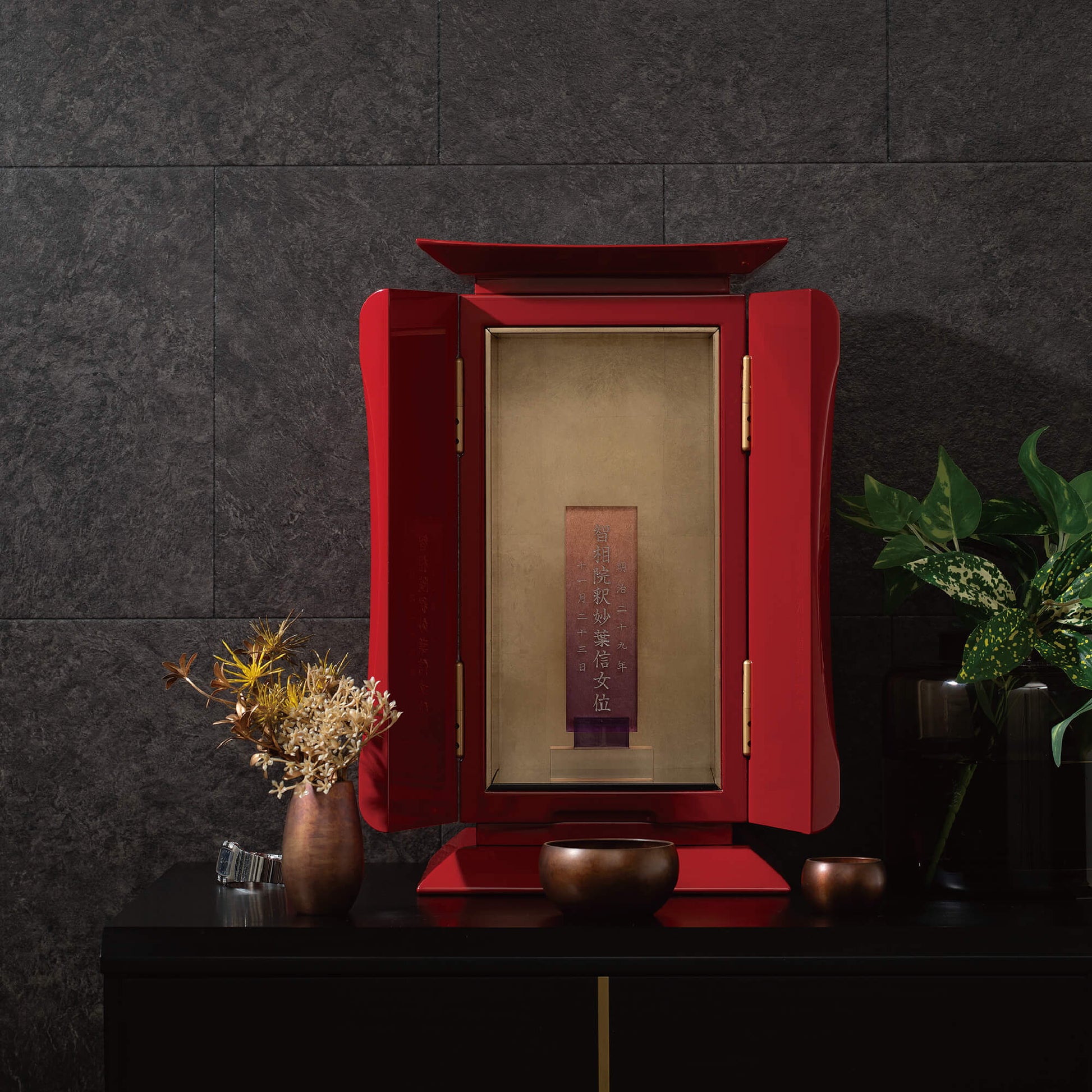 朱漆の色は仏教において智慧や悟りを象徴し、鳥居を模した形状は、現世と霊性の世界をつなぐ門としての役割を果たします。