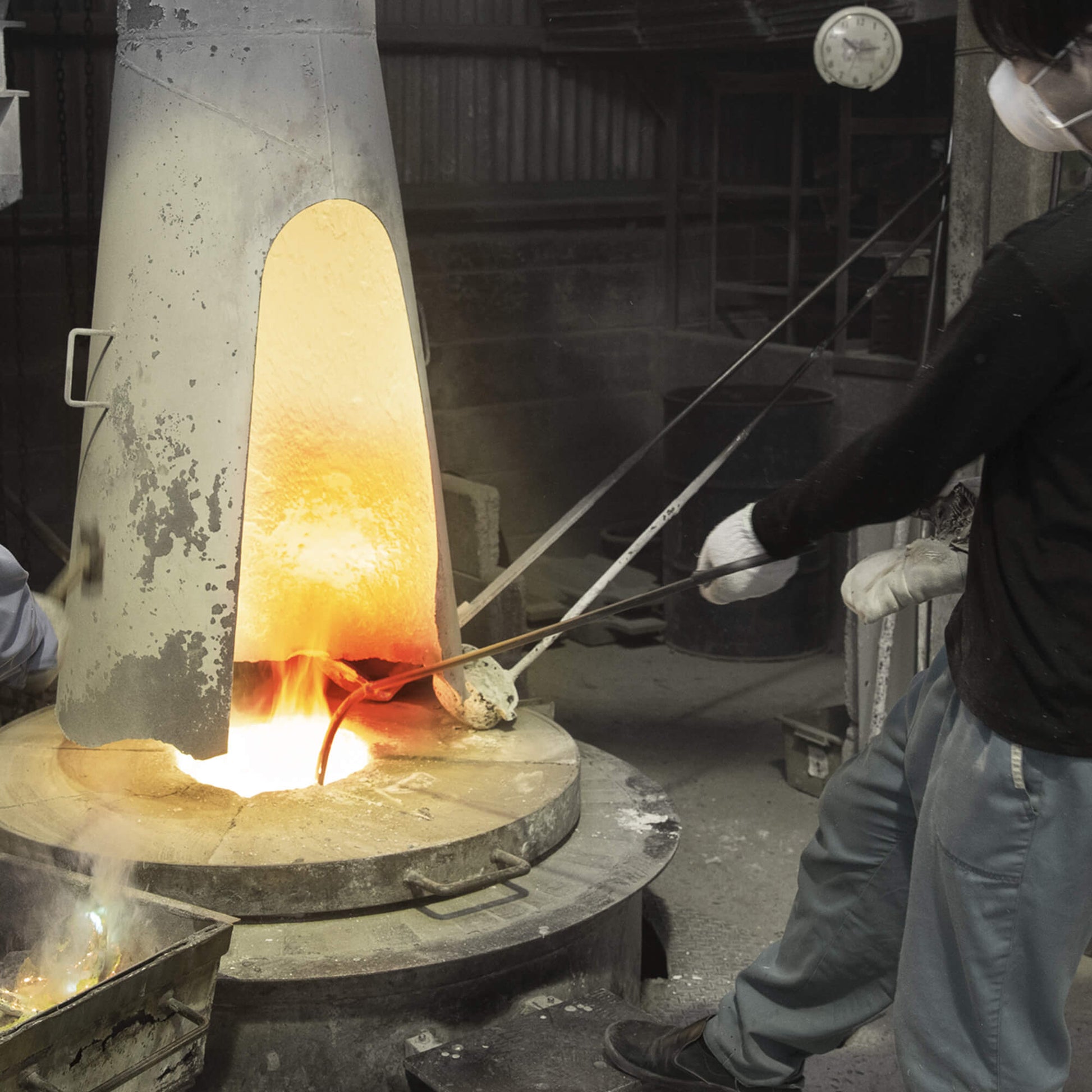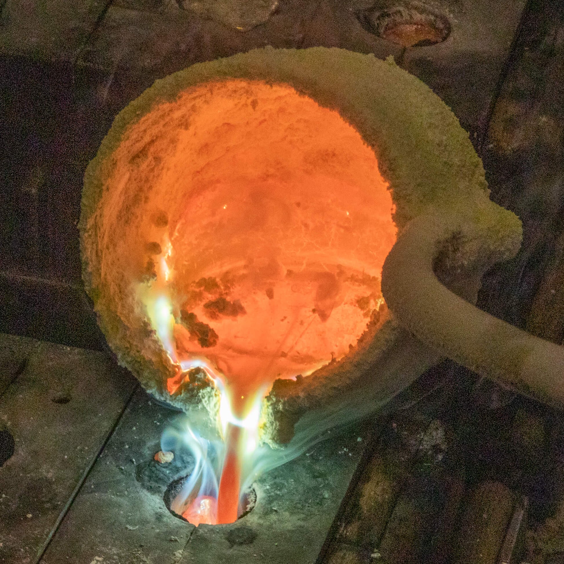 真鍮をガス炉の中で約2時間溶解。全ての作業が危険が伴うため、慎重に行う必要があります。