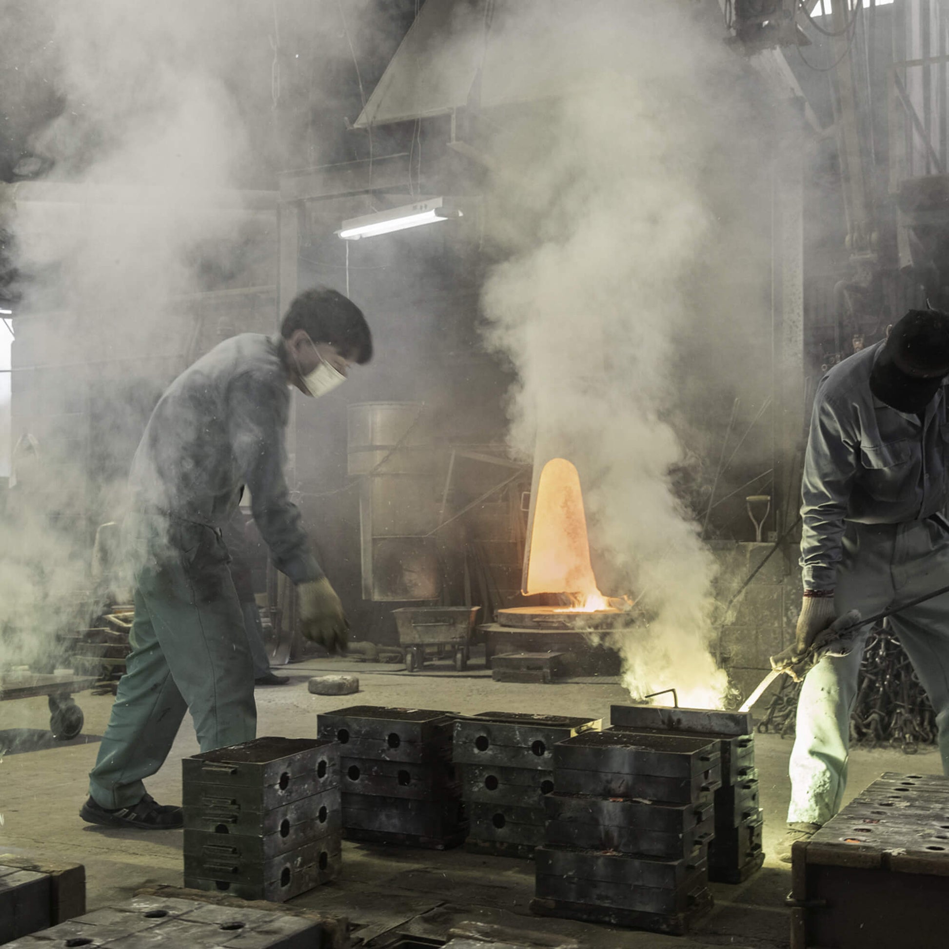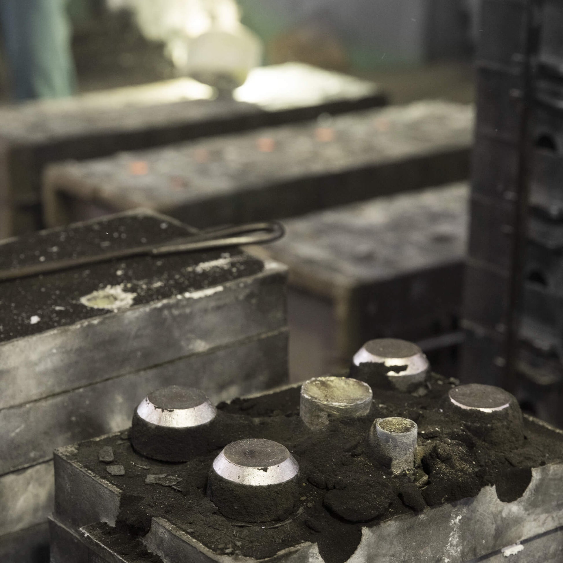 砂型に1つずつ手作業で流し込んでいきます。上昇する煙は、湯気や水蒸気ではなく、銅より沸点が低い亜鉛が燃えて発生したものです。