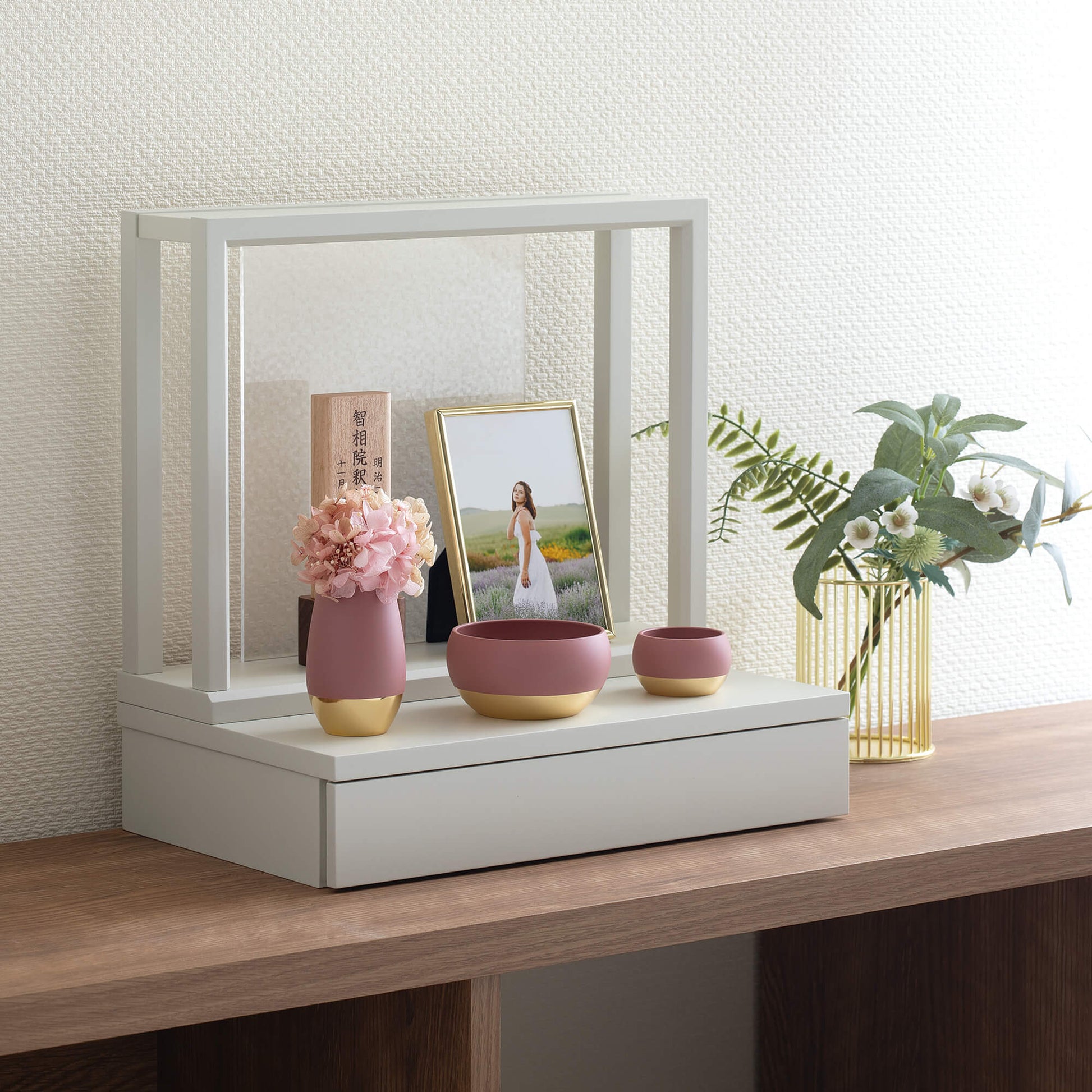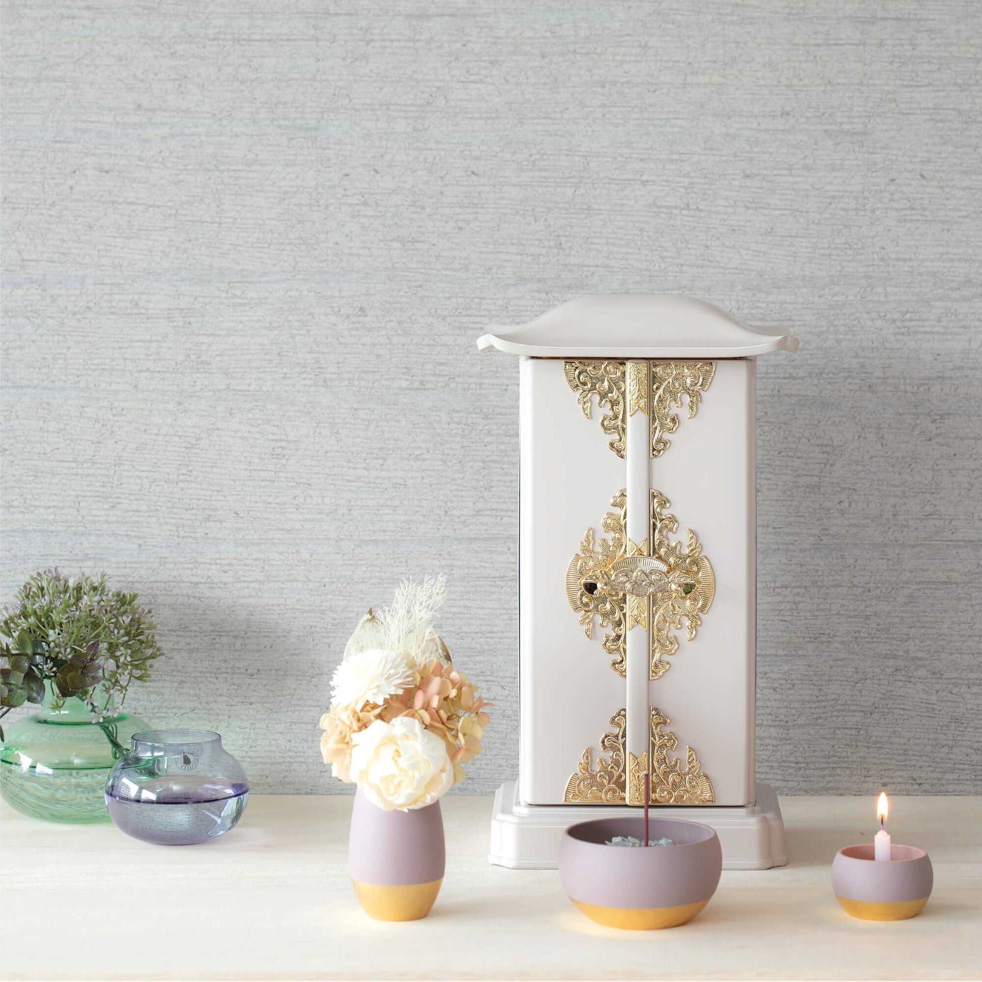 ↑マットグレー色。ゴールドとの組合せはエレガントで上品。そっと優しい祈りの場になります。