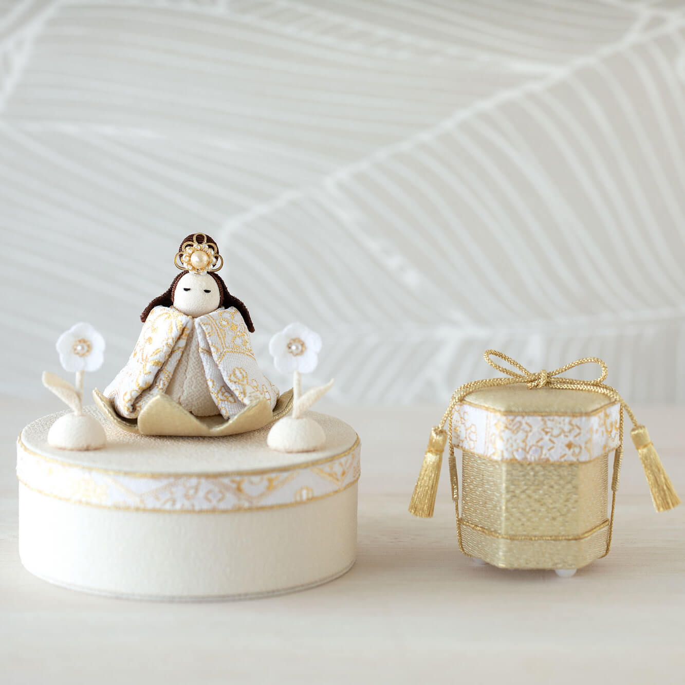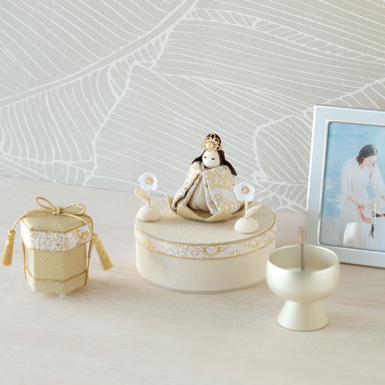 観音様の両脇には可愛らしい常花とミニ骨壷のセットになっています。ミニ骨壷の中には、ちりめんお巾着とその中にお骨や形見を入れるカプセルがありますので、安心してお使いいただけます。