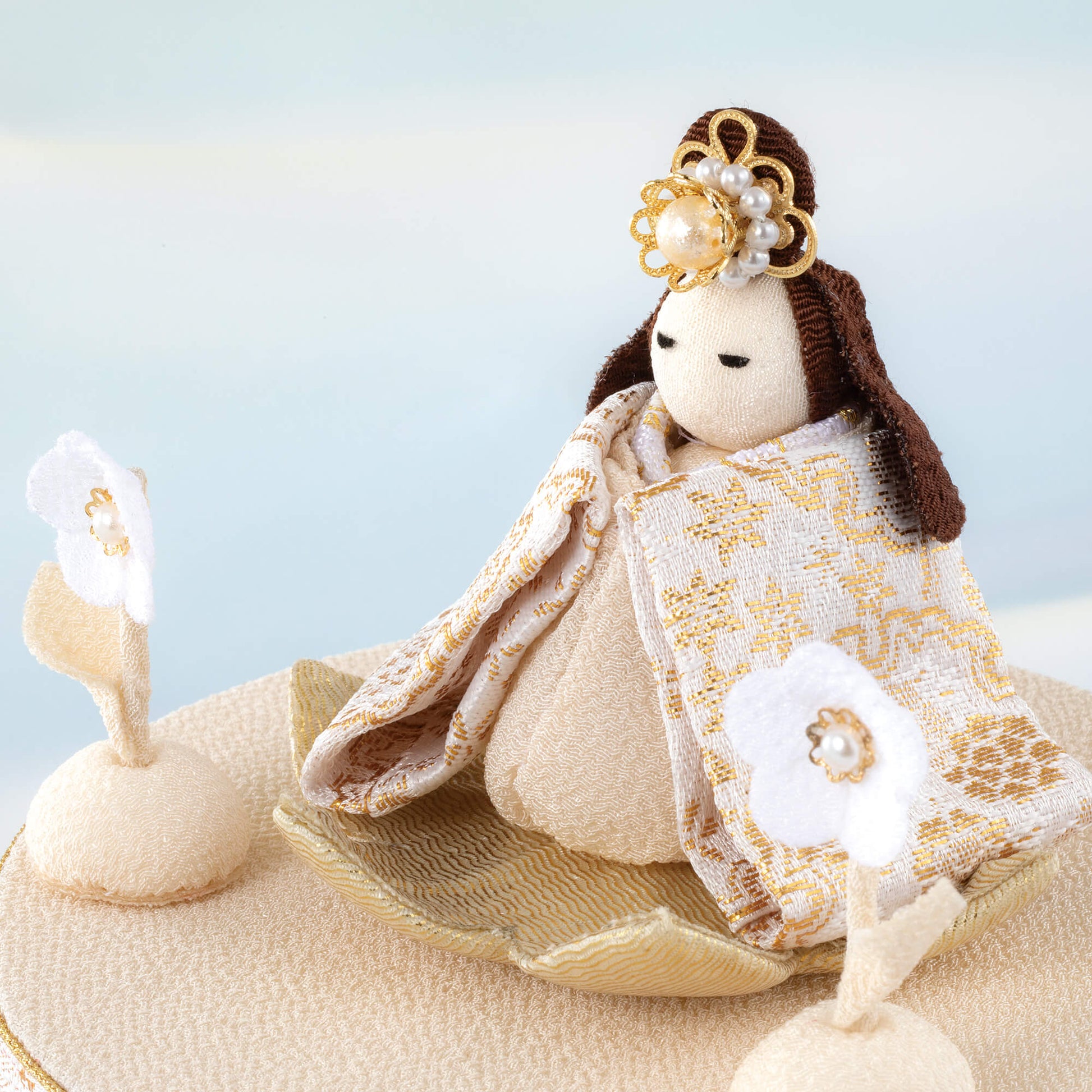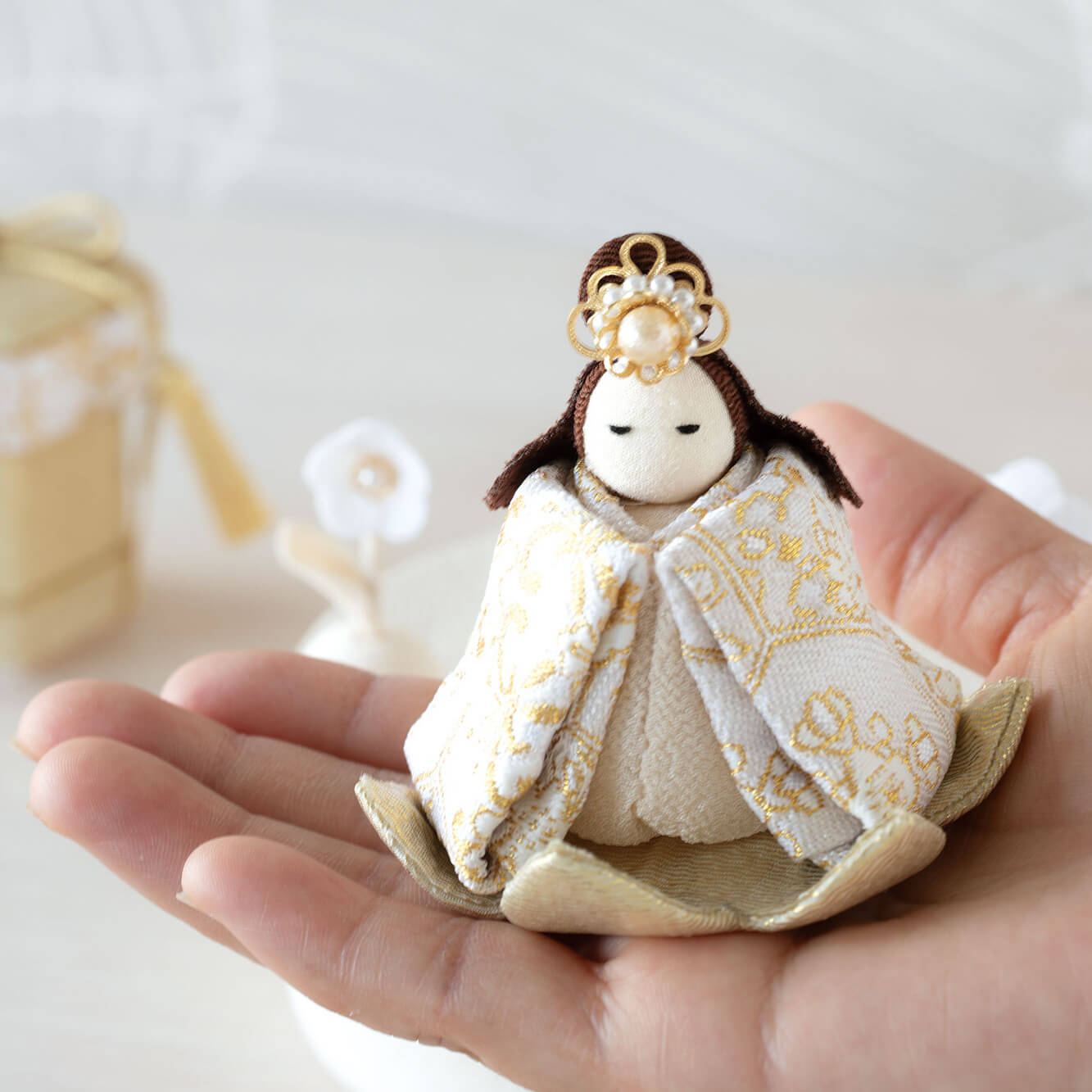 夢み屋:ちりめん生地の柔らかさを生かして、可愛らしい観音様を作りました。観音様は、人生の災いや恐怖から救いの手を差し伸べてくださるお方なので、目を瞑った優しい表情のお顔にしています。