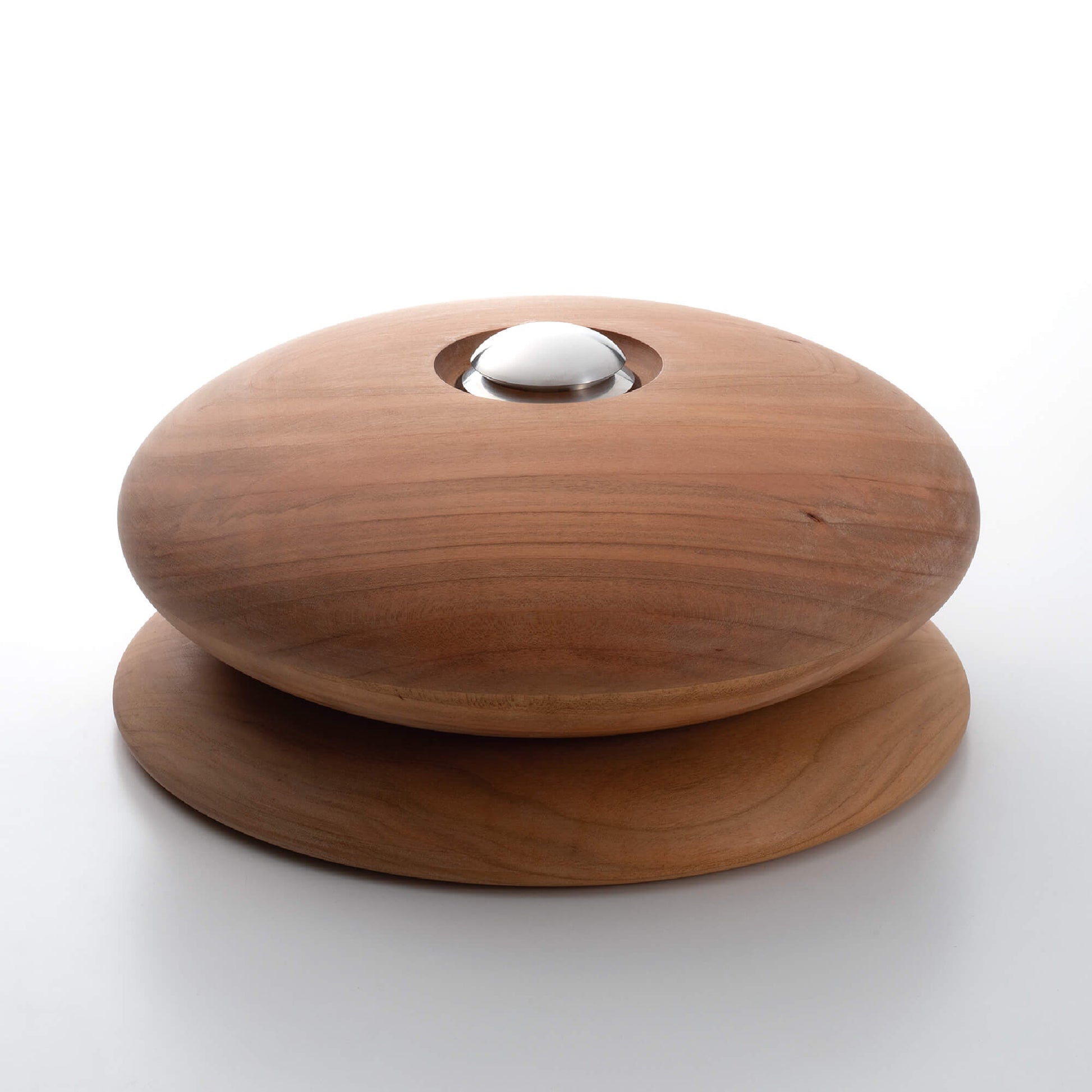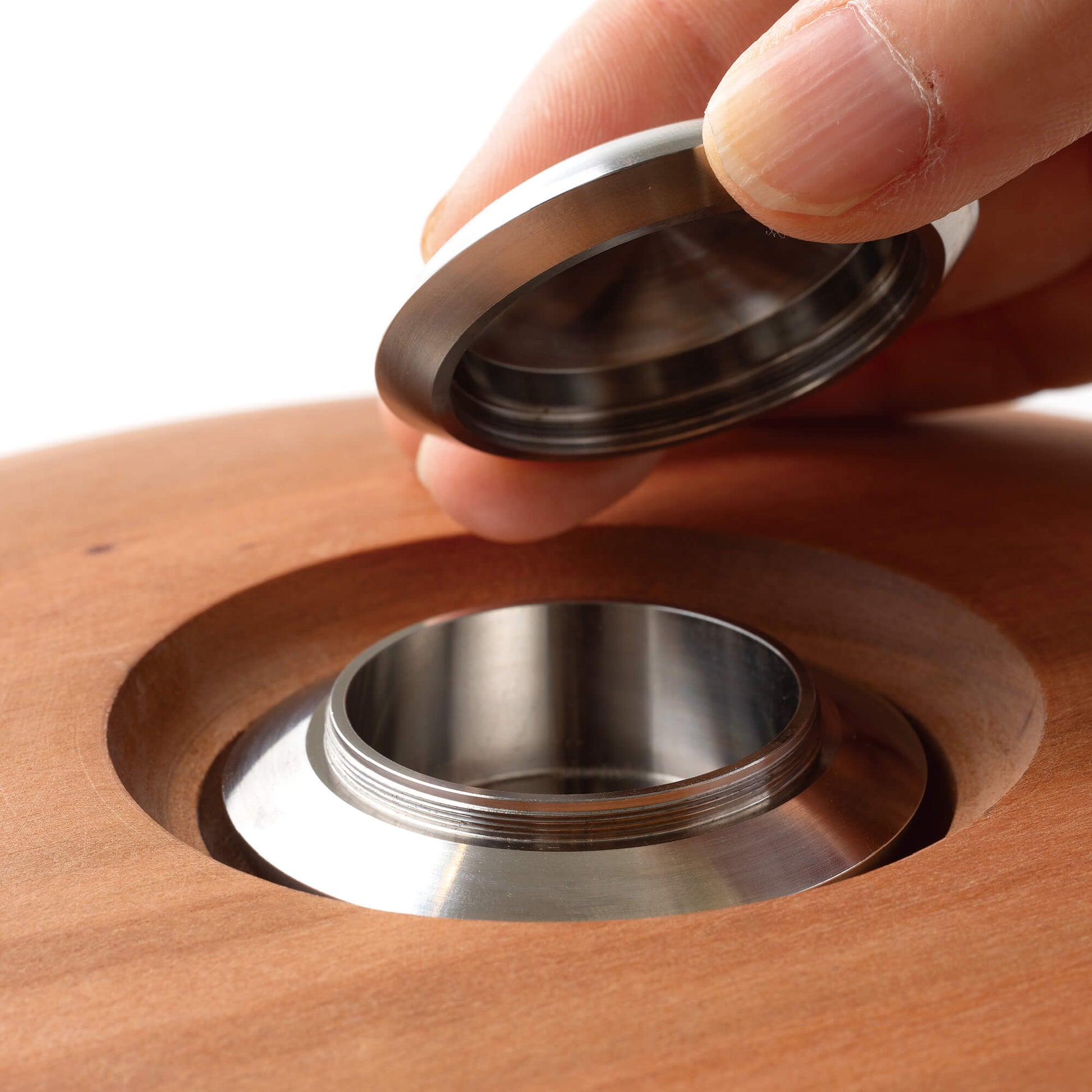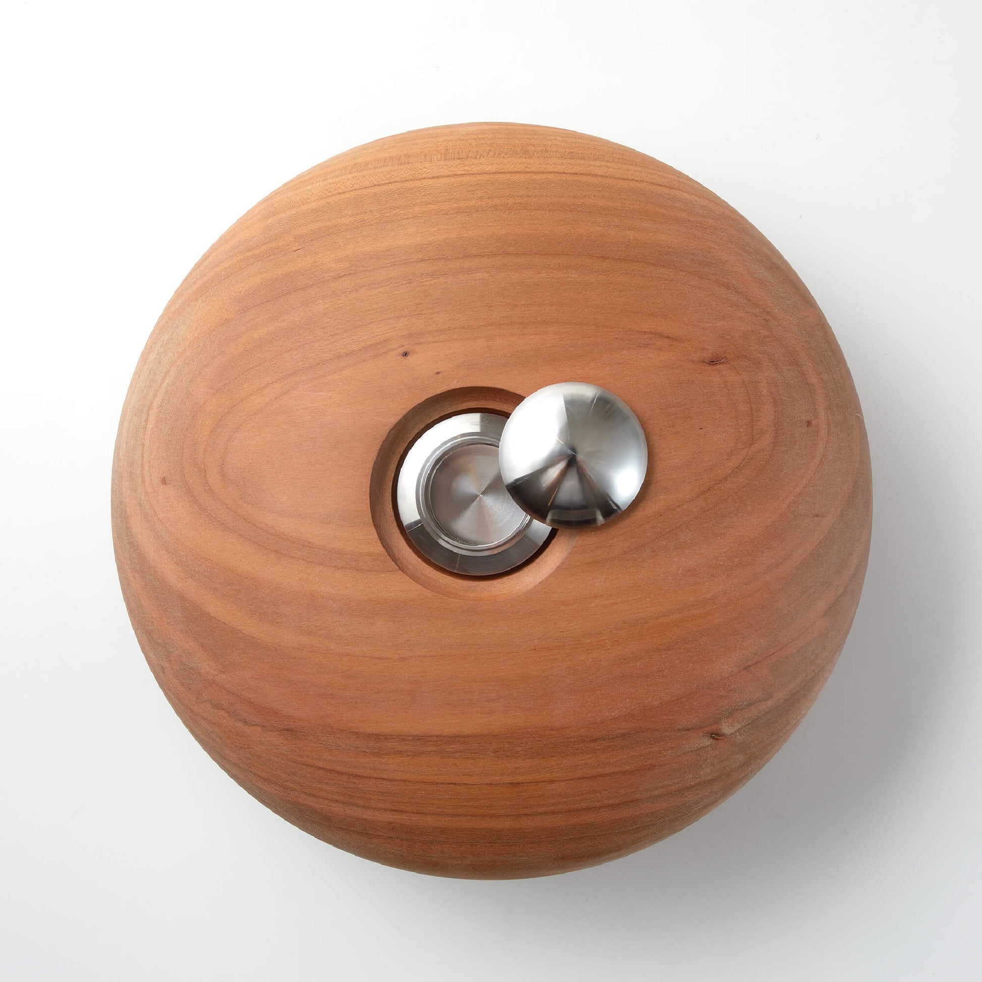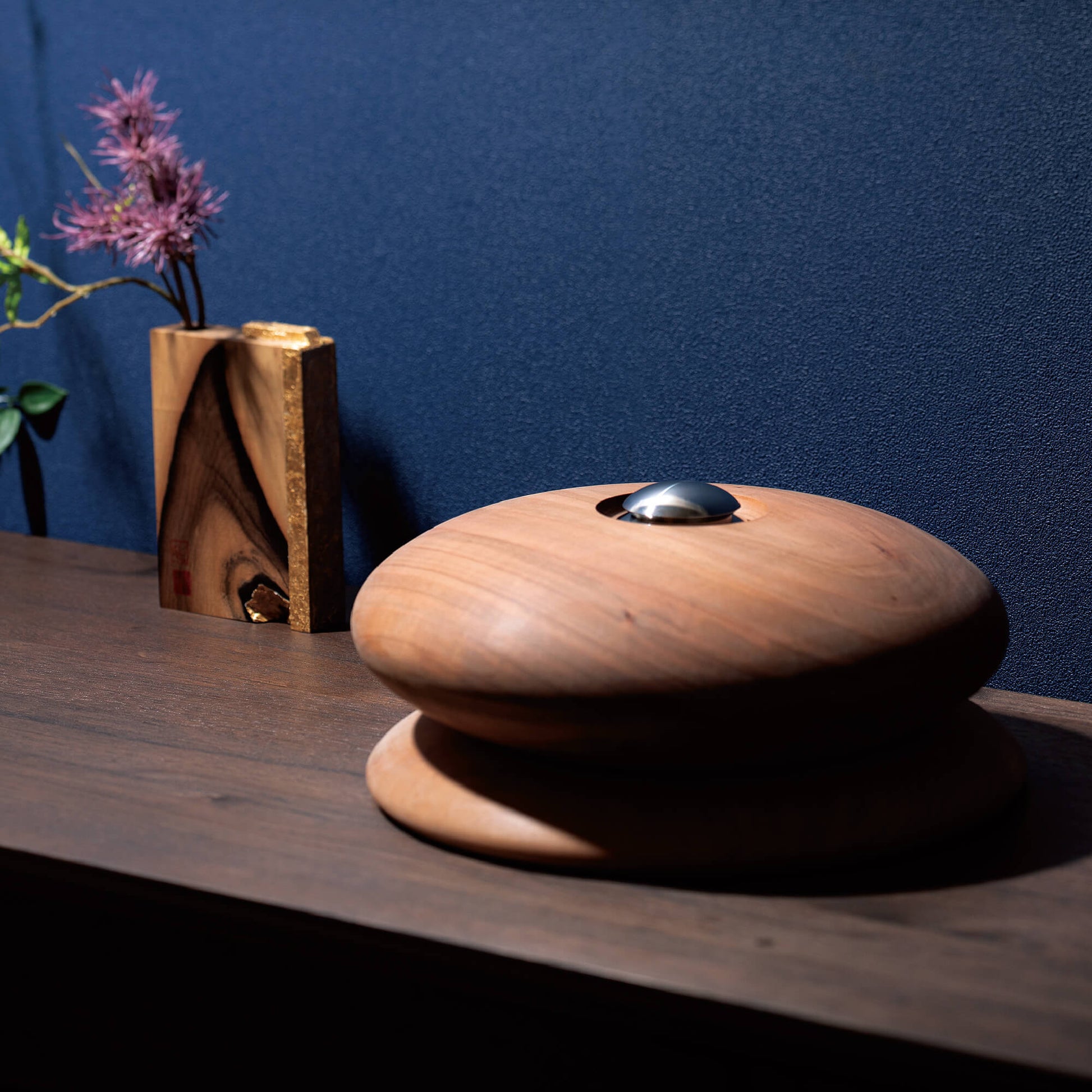 上部にはステンレス製の無垢材によるメモリアルケースを備え、蓋を外すことで大切な人の遺灰やアクセサリーなどの形見を納めることが可能です。地球の鉱物から生まれたステンレスは、共に生きた証を象徴し、木のぬくもりと対比しながら調和を生み出します。