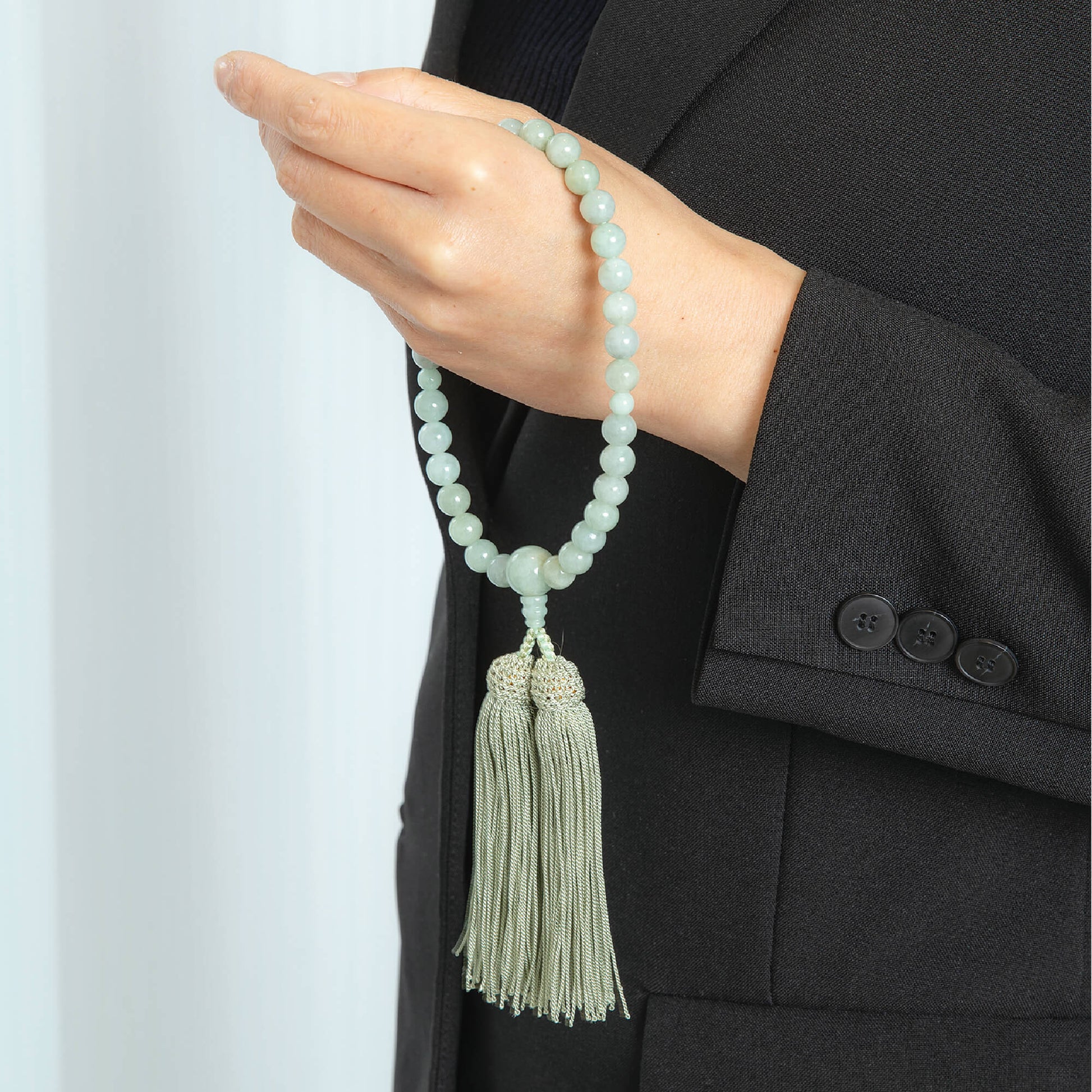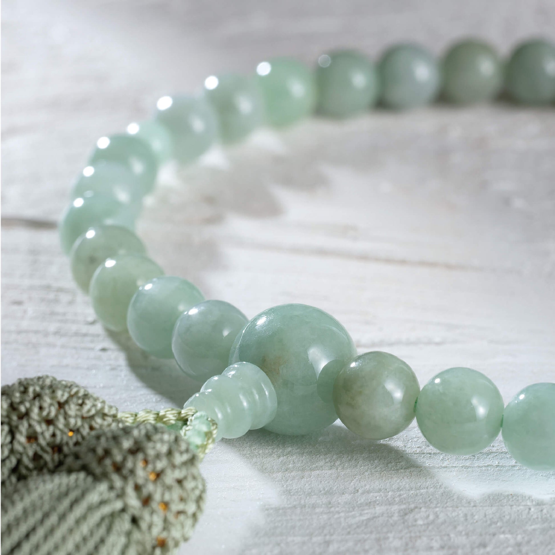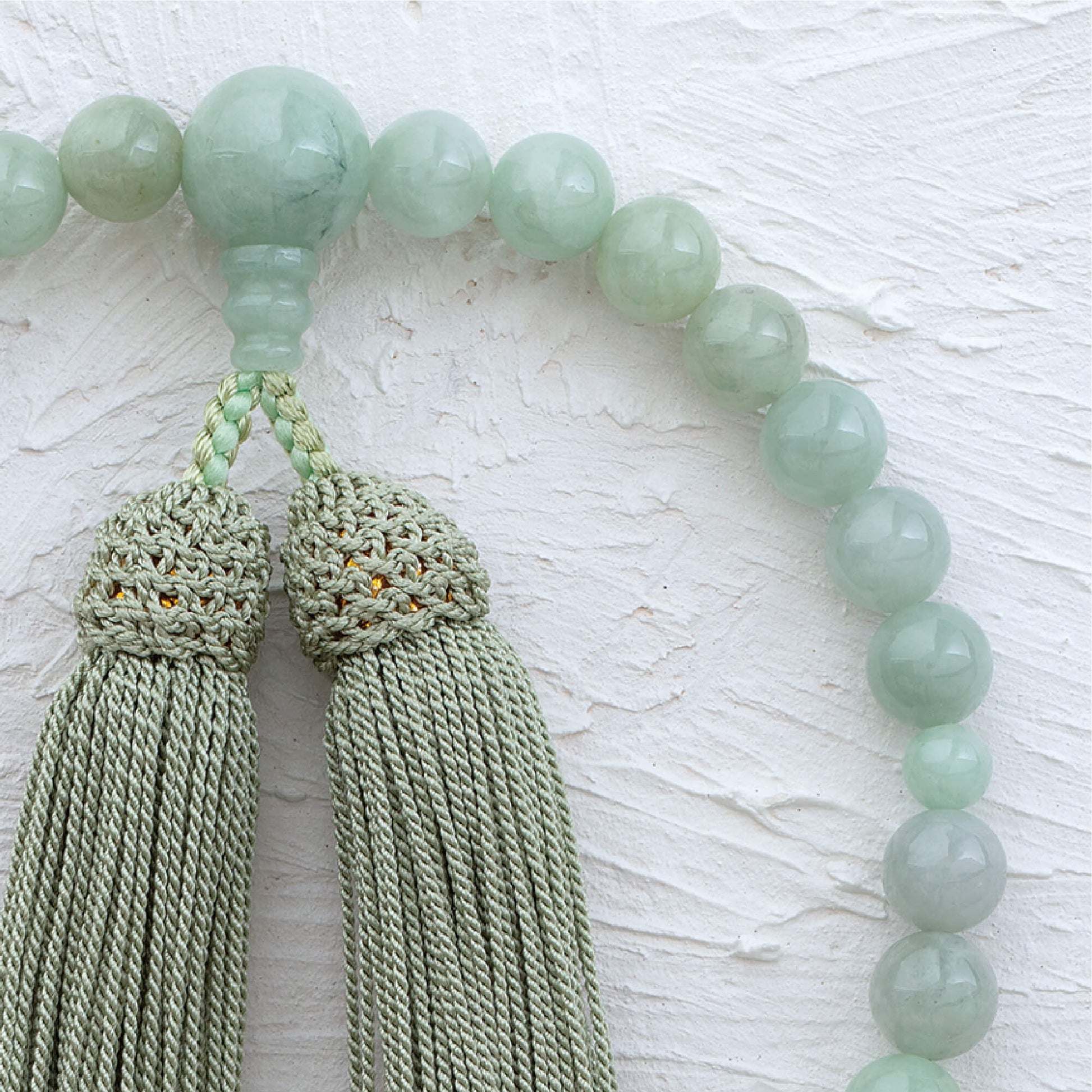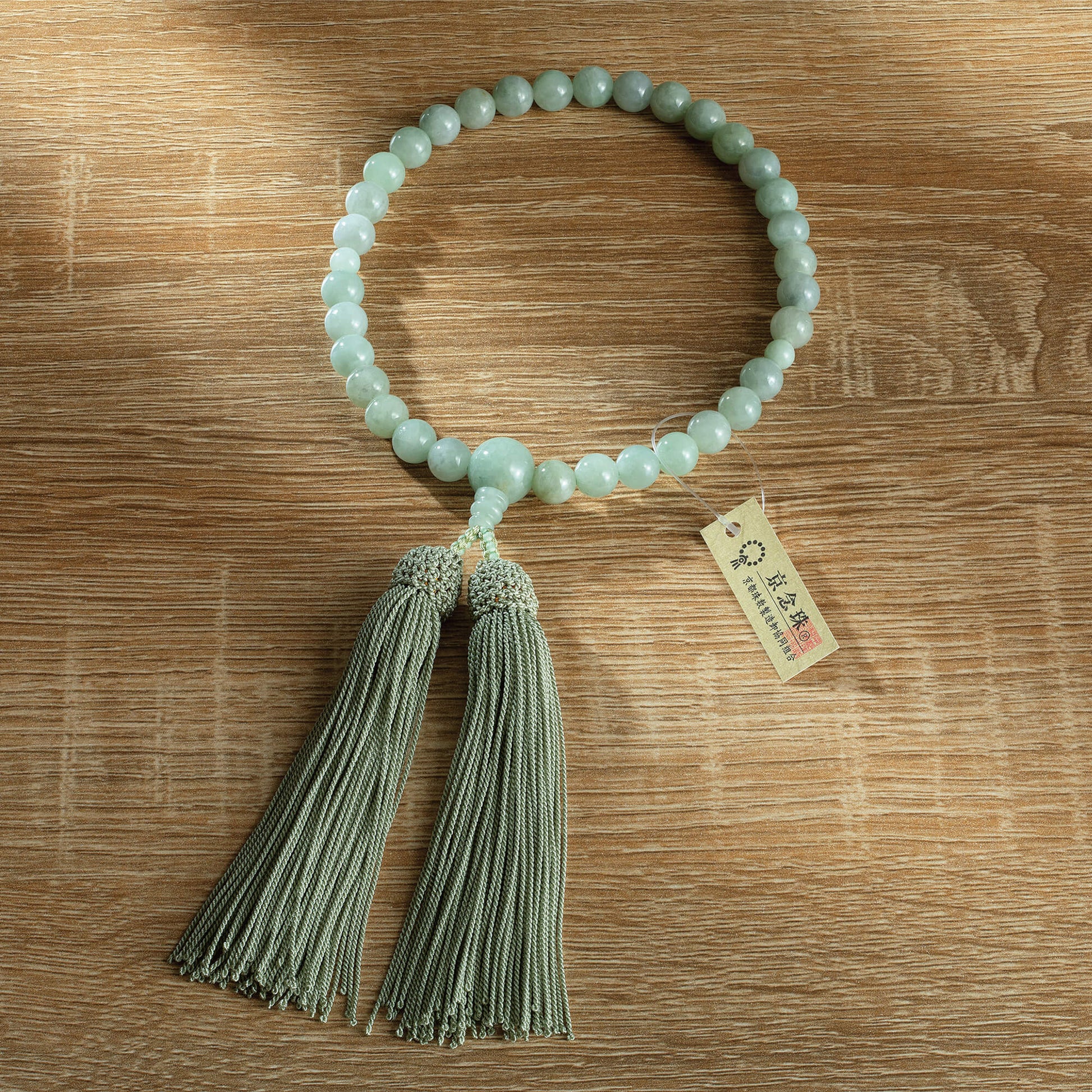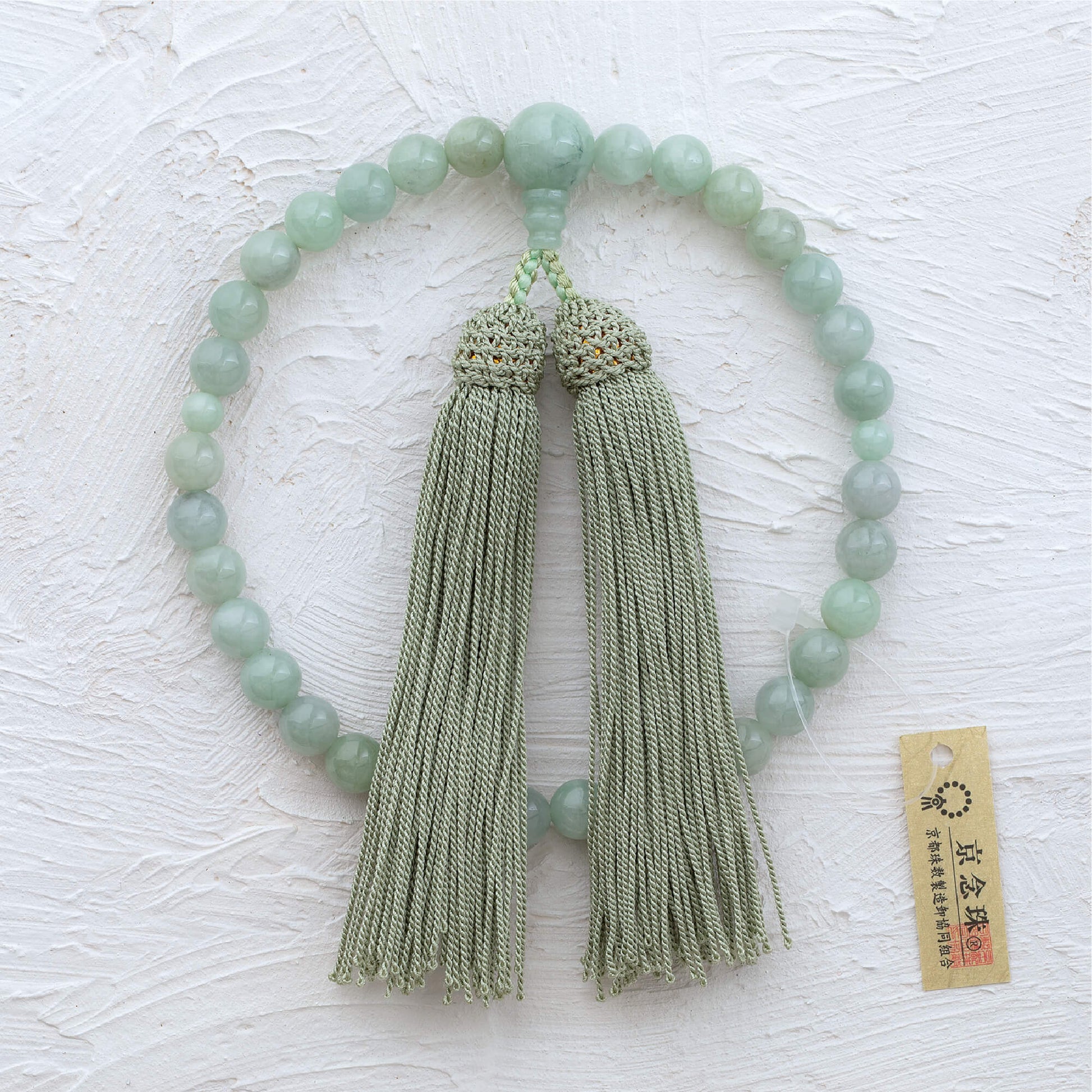 こちらの念珠は、高級翡翠の産地として知られるビルマ産の翡翠を使用した、非常に貴重で美しい念珠です。ビルマ産翡翠は、その透明感のある淡い緑色と、まろやかな色合いが特徴で、見る人を惹きつける魅力を持っています。自然のままの美しさが漂う翡翠は、品のある風合いを保ちながら、手元に優雅さと落ち着きを与えます。
