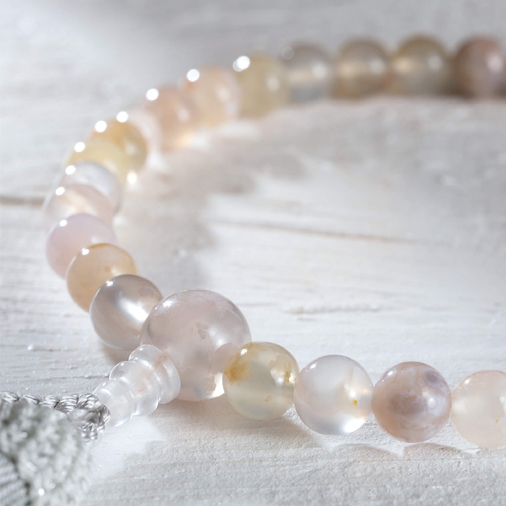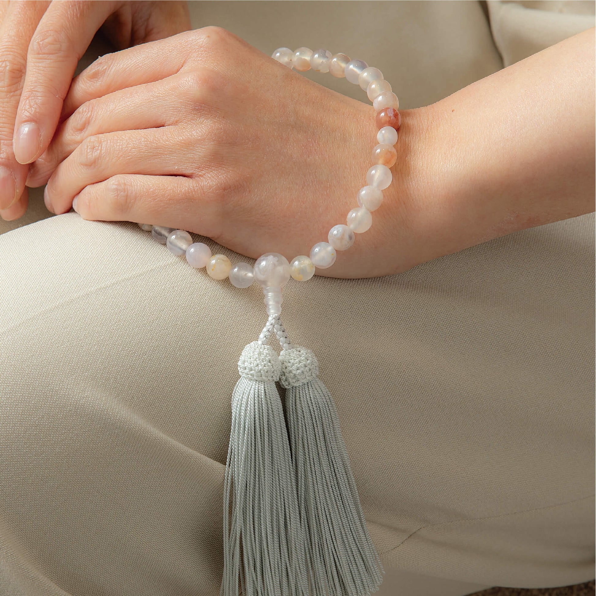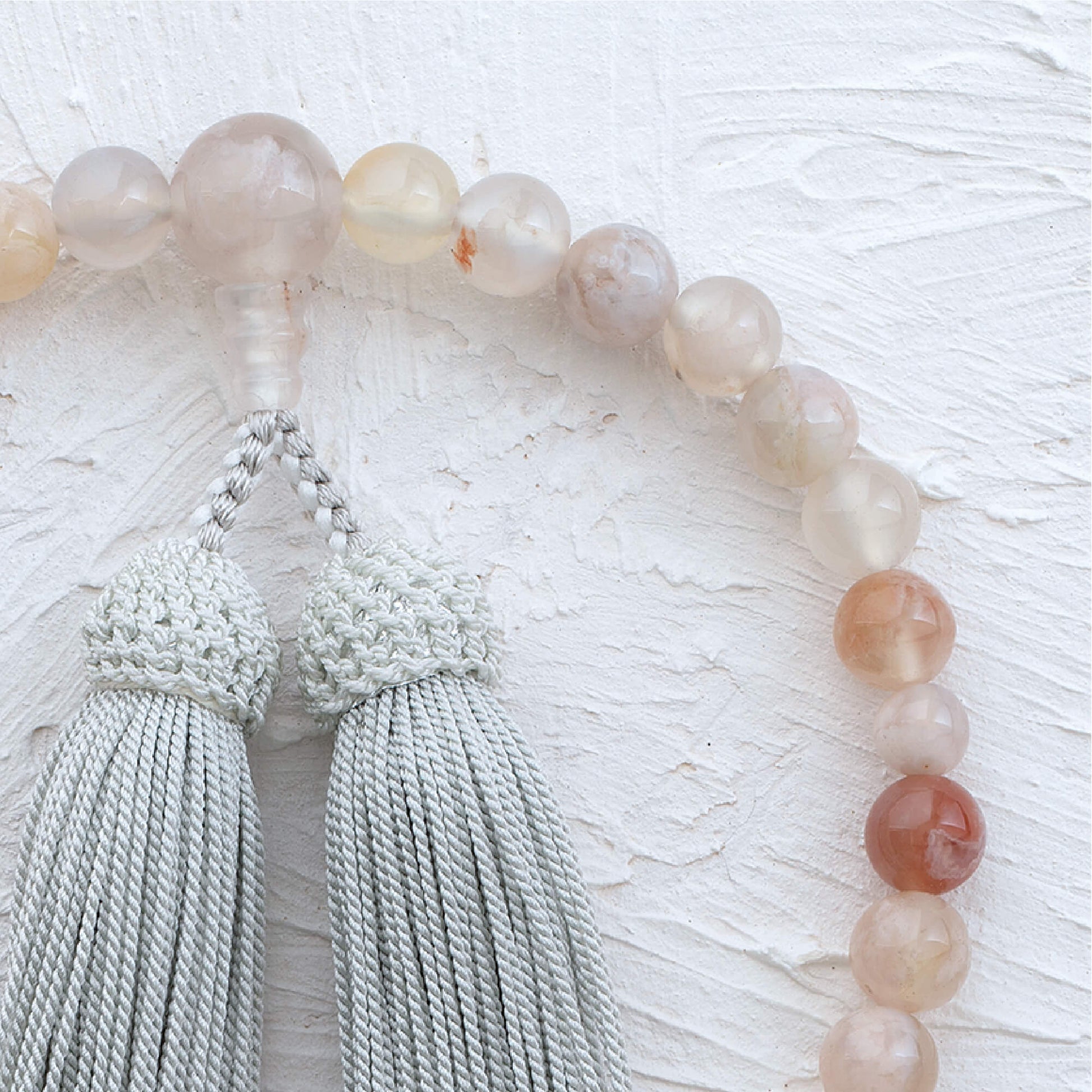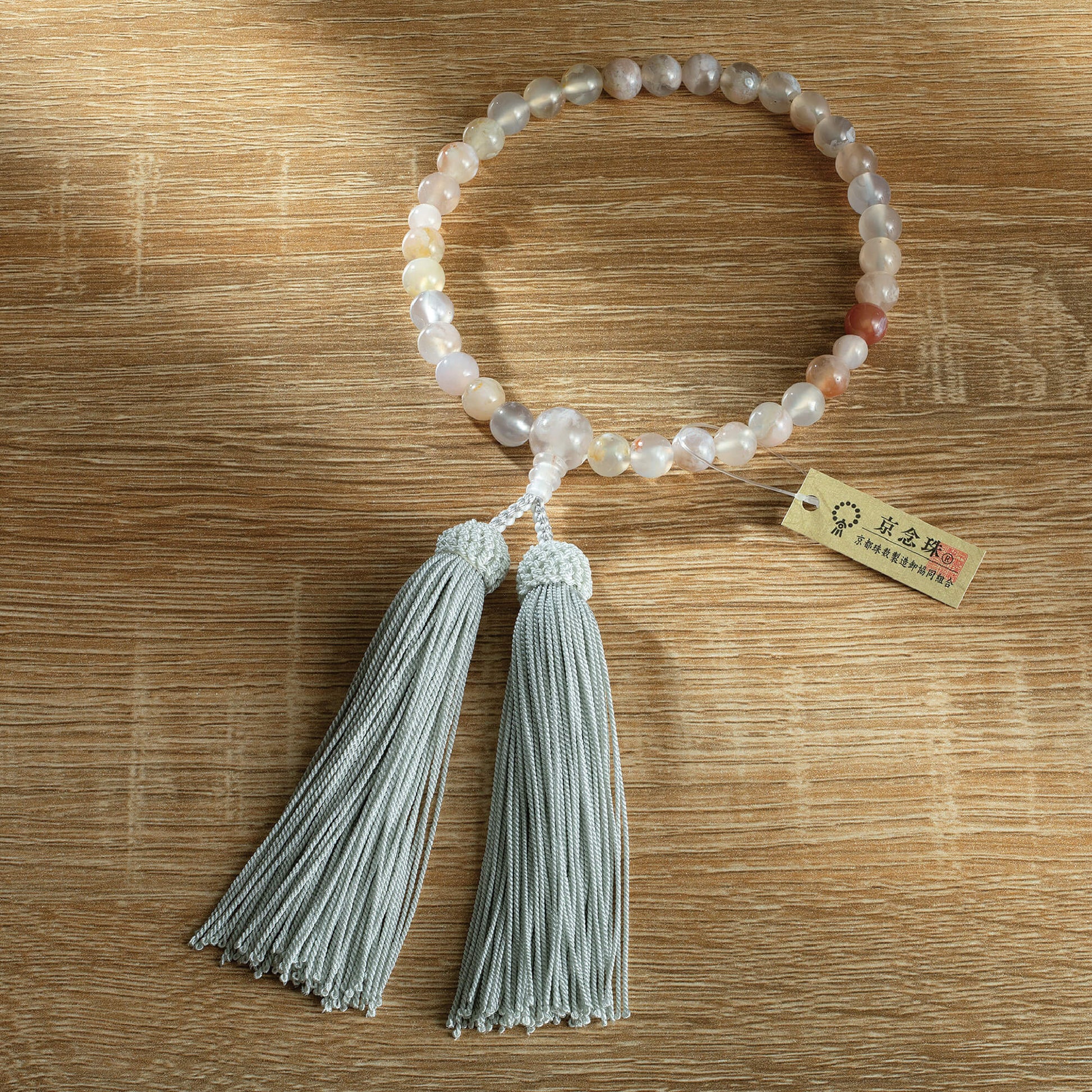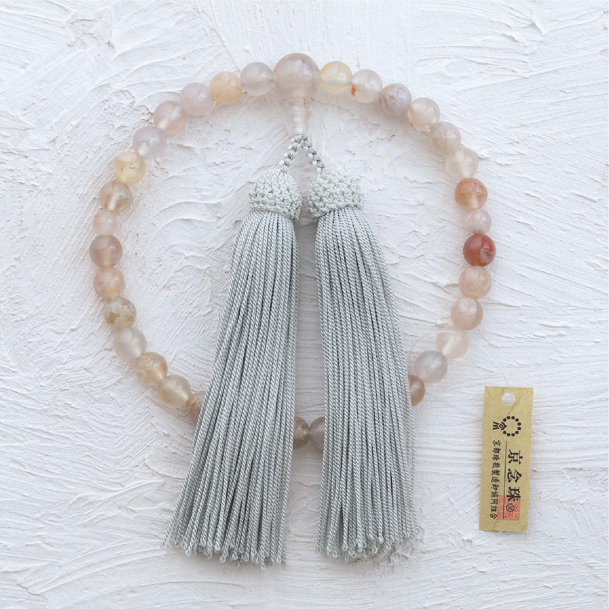 桜の花のように淡いピンク色が美しい桜瑪瑙を使用した一品です。落ち着いた色合いが特徴で、幅広い年齢層のお客様にぴったりなデザインとなっています。房には上質な正絹の頭房を使用しており、しっとりとした触り心地が魅力です。熟練の京念珠製造師が手作業で仕立てた、長く愛される定番の商品です。シンプルでありながら、品のある美しさを感じていただける念珠です。