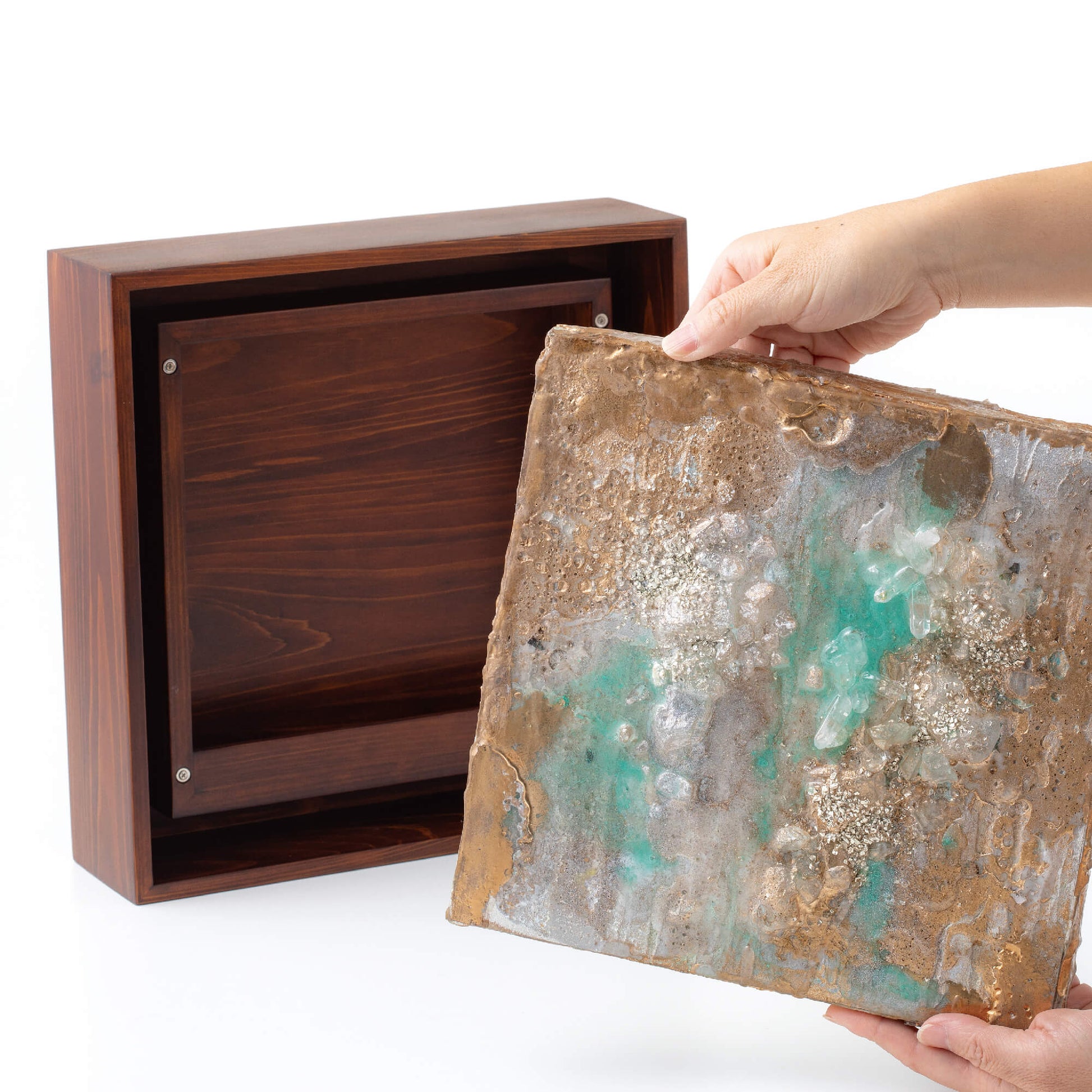 アートの背面に大切なものを納められるケースを一体化し、