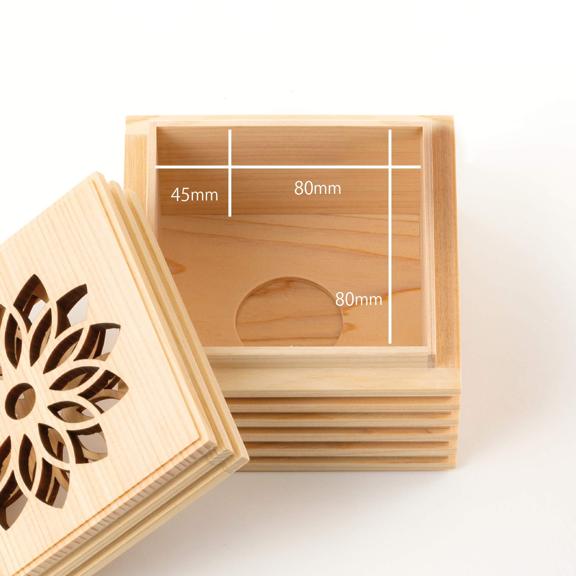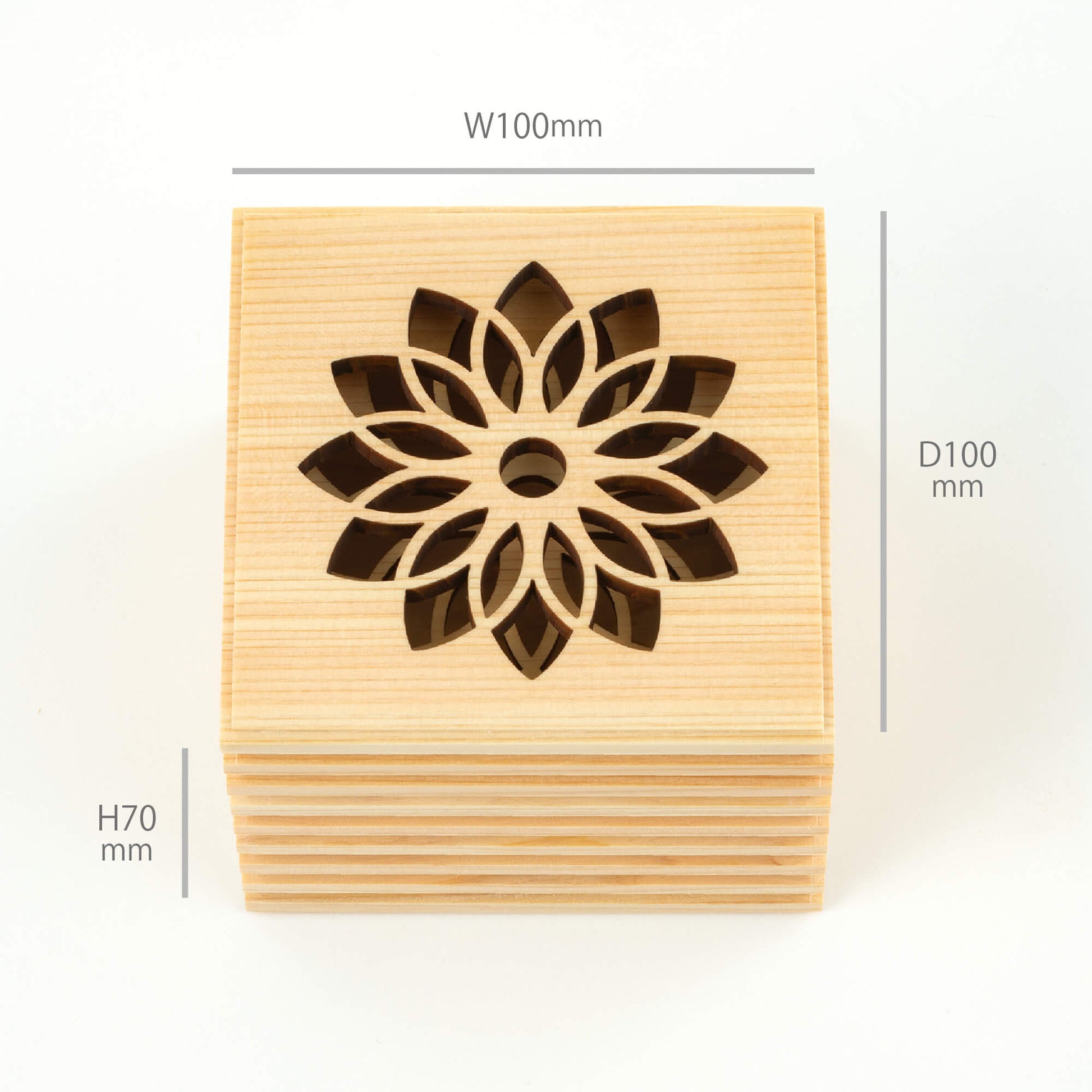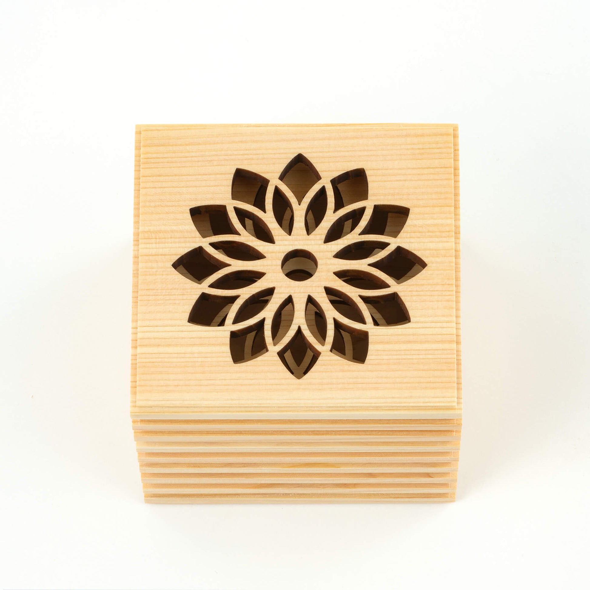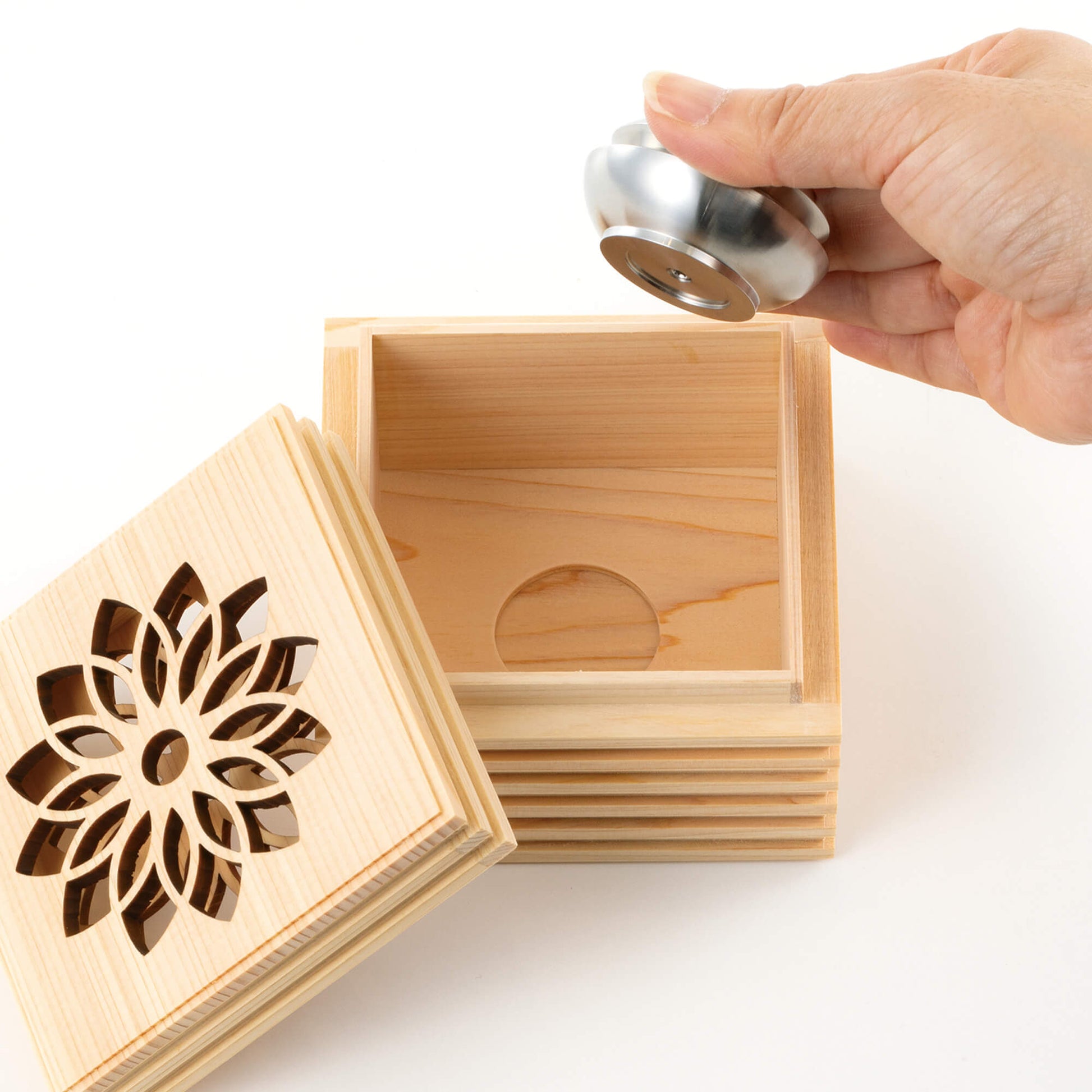 こゆりシリーズ「ライン透かし箱」は、神社仏閣等広く使われているヒノキを採用いたしました。箱を開けるとほんのりとヒノキの香りに包まれます。故人さまの想いも入った「祈りの箱」は、花の透かし模様を入れました。天に向かって、透かし模様を入れる事で、天と繋がる想いを込めました。側面のラインは、あの世とこの世を結ぶ階段をイメージしつつ、ラインを入れる事で、表面積を増やし調湿効果と陰影によるデザイン性を重視しました。ミニ骨壷としてもお使いいただけます。