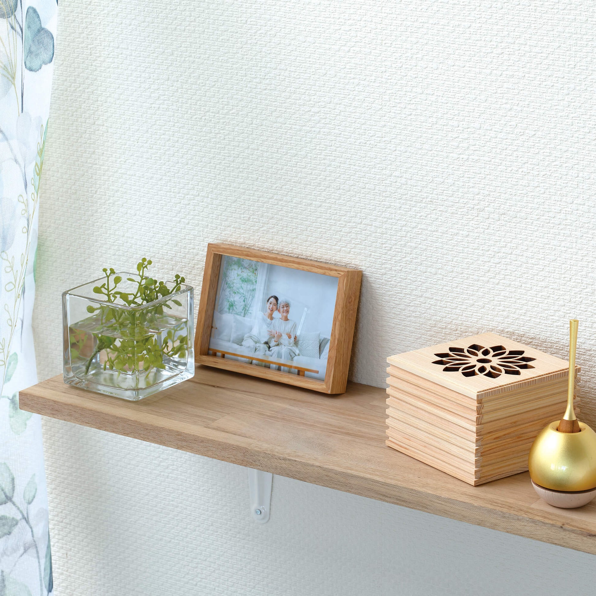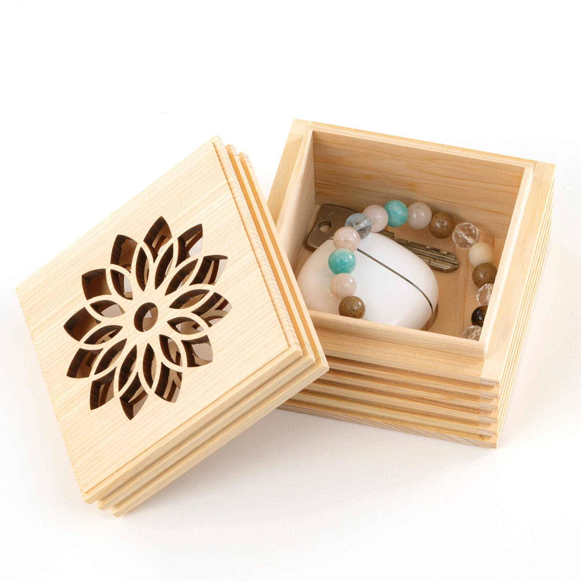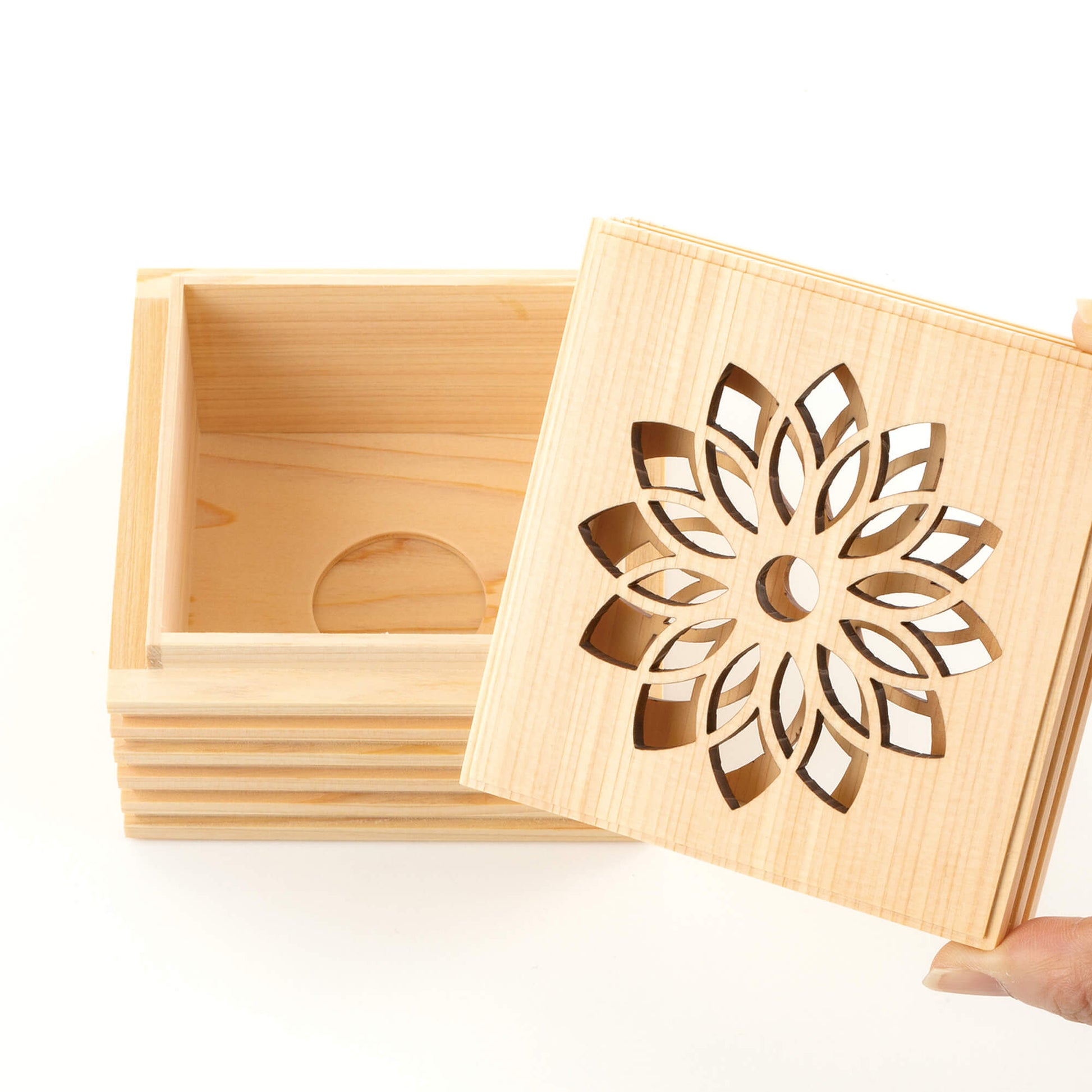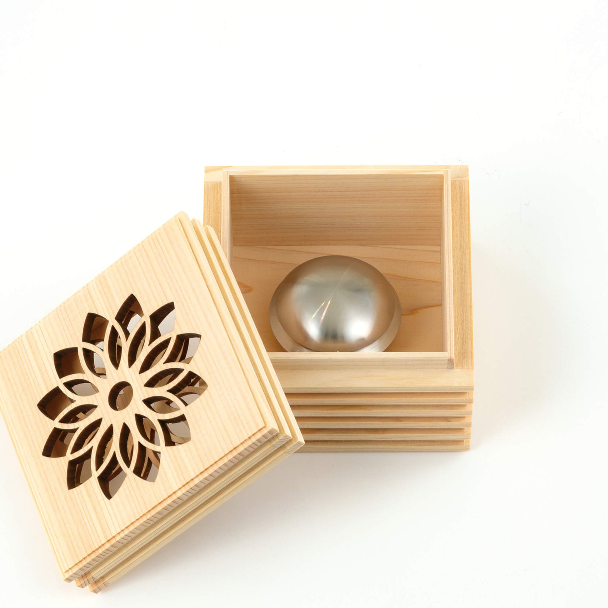 こゆりシリーズ「ライン透かし箱」は、神社仏閣等広く使われているヒノキを採用いたしました。箱を開けるとほんのりとヒノキの香りに包まれます。故人さまの想いも入った「祈りの箱」は、花の透かし模様を入れました。天に向かって、透かし模様を入れる事で、天と繋がる想いを込めました。側面のラインは、あの世とこの世を結ぶ階段をイメージしつつ、ラインを入れる事で、表面積を増やし調湿効果と陰影によるデザイン性を重視しました。ミニ骨壷としてもお使いいただけます。