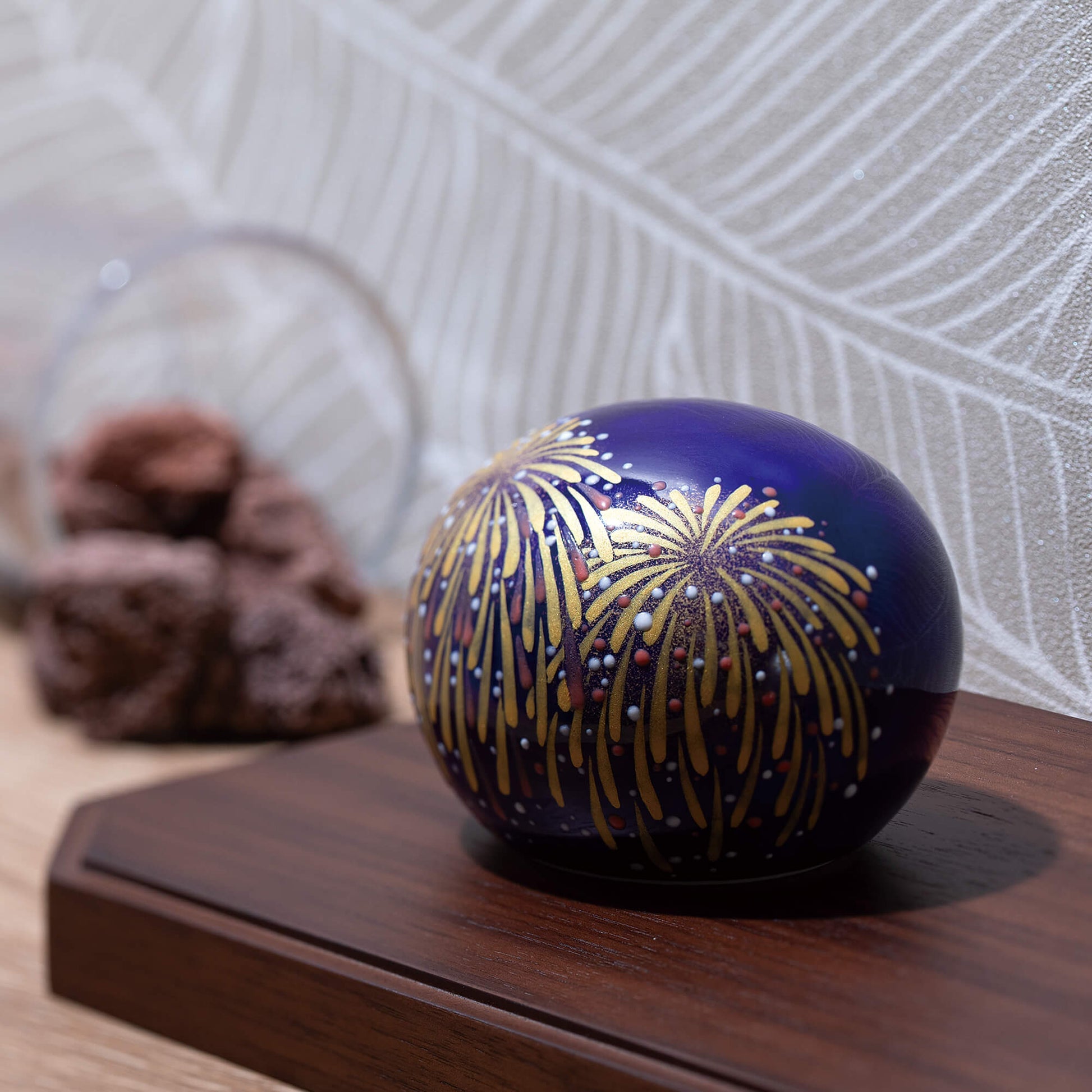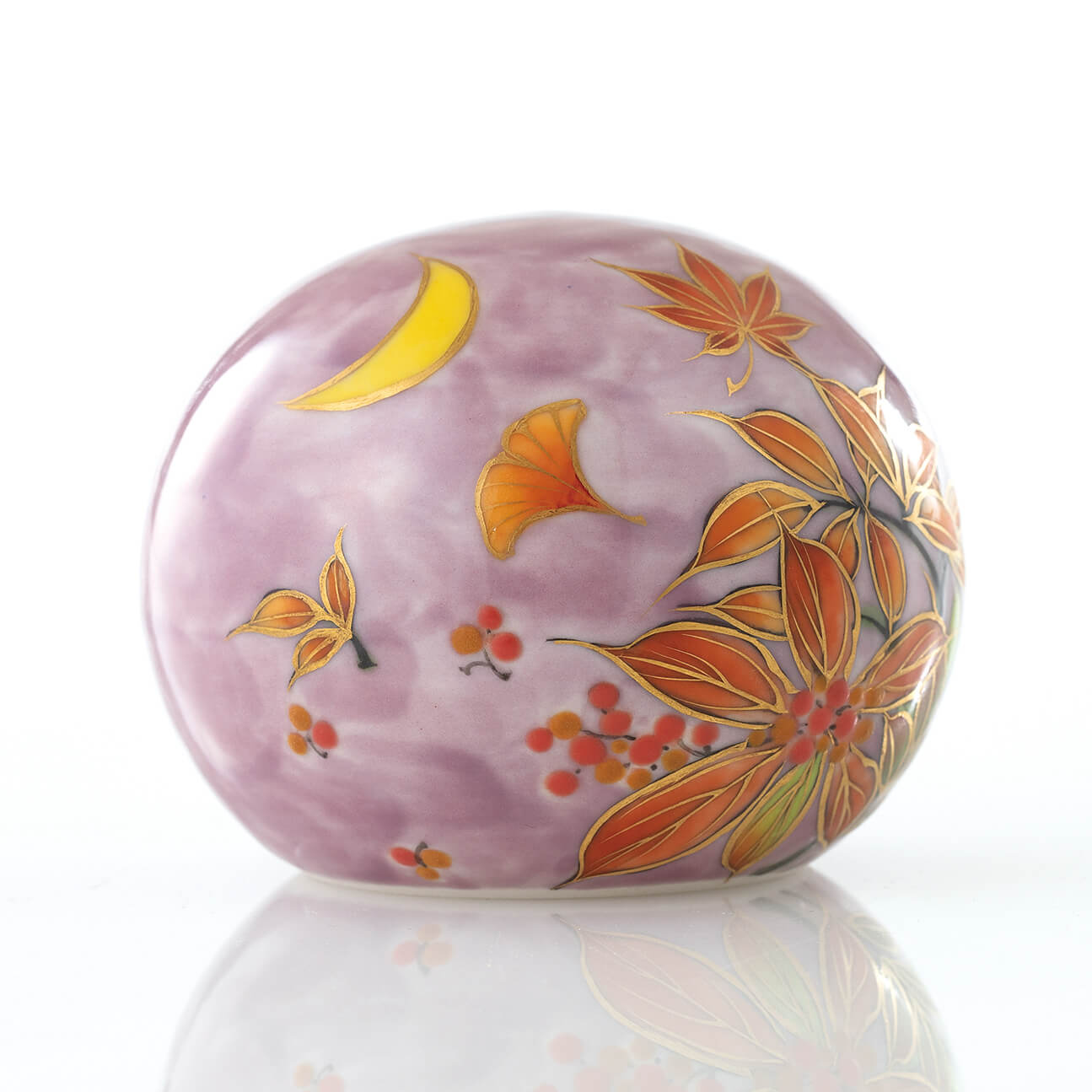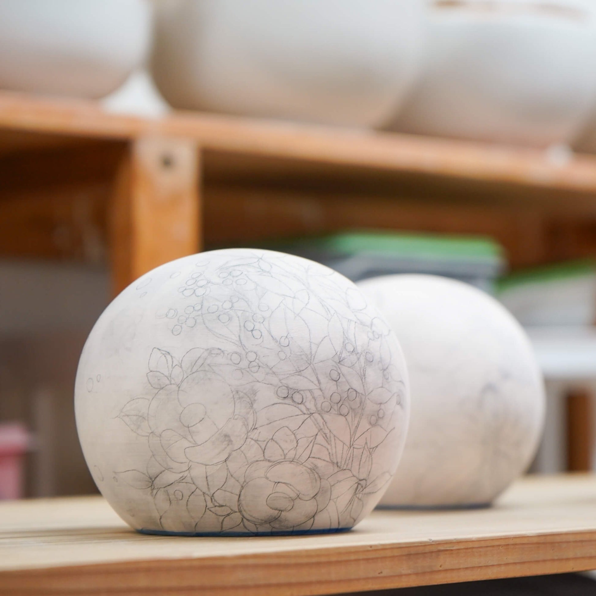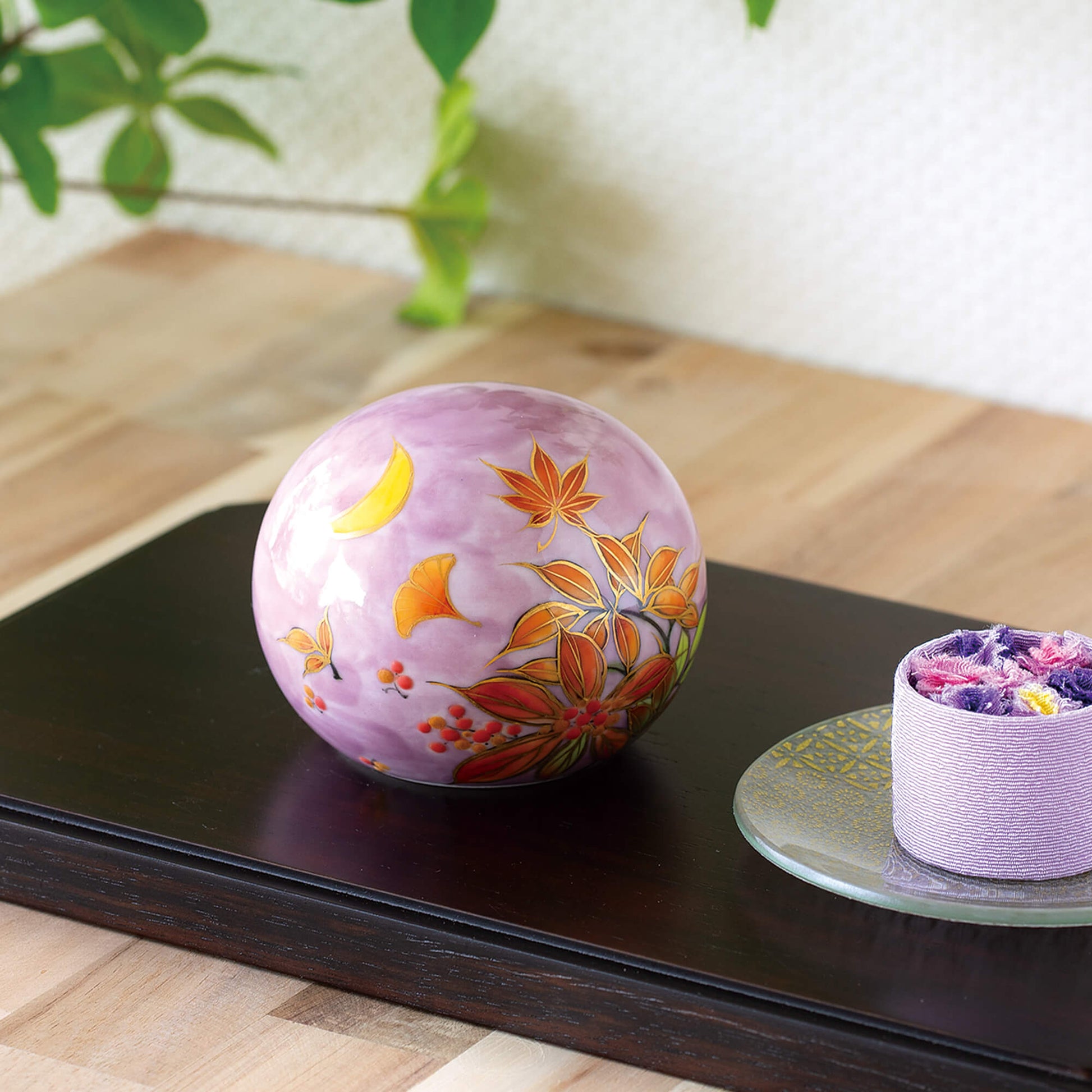 大好きな母が亡くなるずっとずっと前 (母がまだまだ元気だった頃) 母は、「冷たい遠くのお墓には入りたく無い。」「ずっと家に置いて欲しいと言いました。」その時、私がぼんやりとイメージしたのが、まん丸い形で綺麗な絵が描かれていたら良いなぁ。と。蓋物では無くまん丸のカタチ。そんなの出来るのかしら? と。その時は、そういうものが作れないかと心に温めていました。当時は、まだ手元供養と言うものは存在しませんでした。
