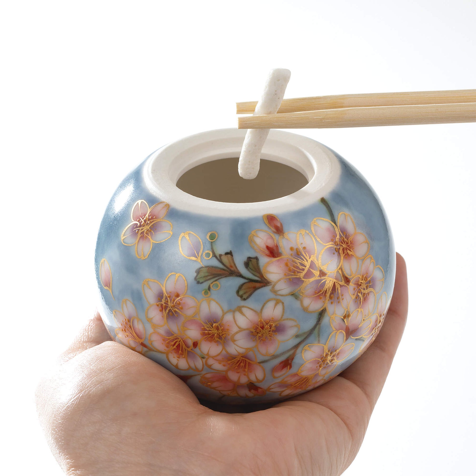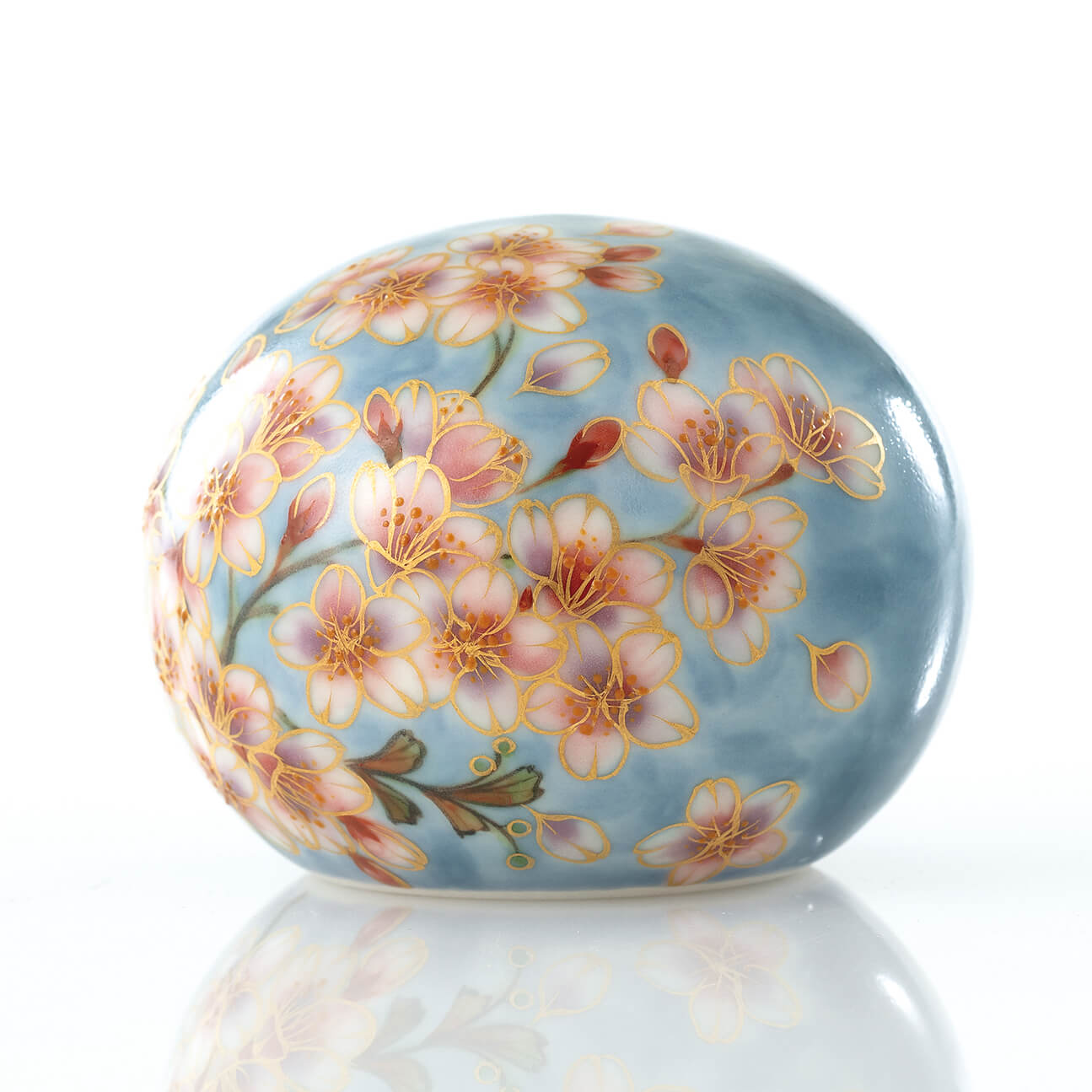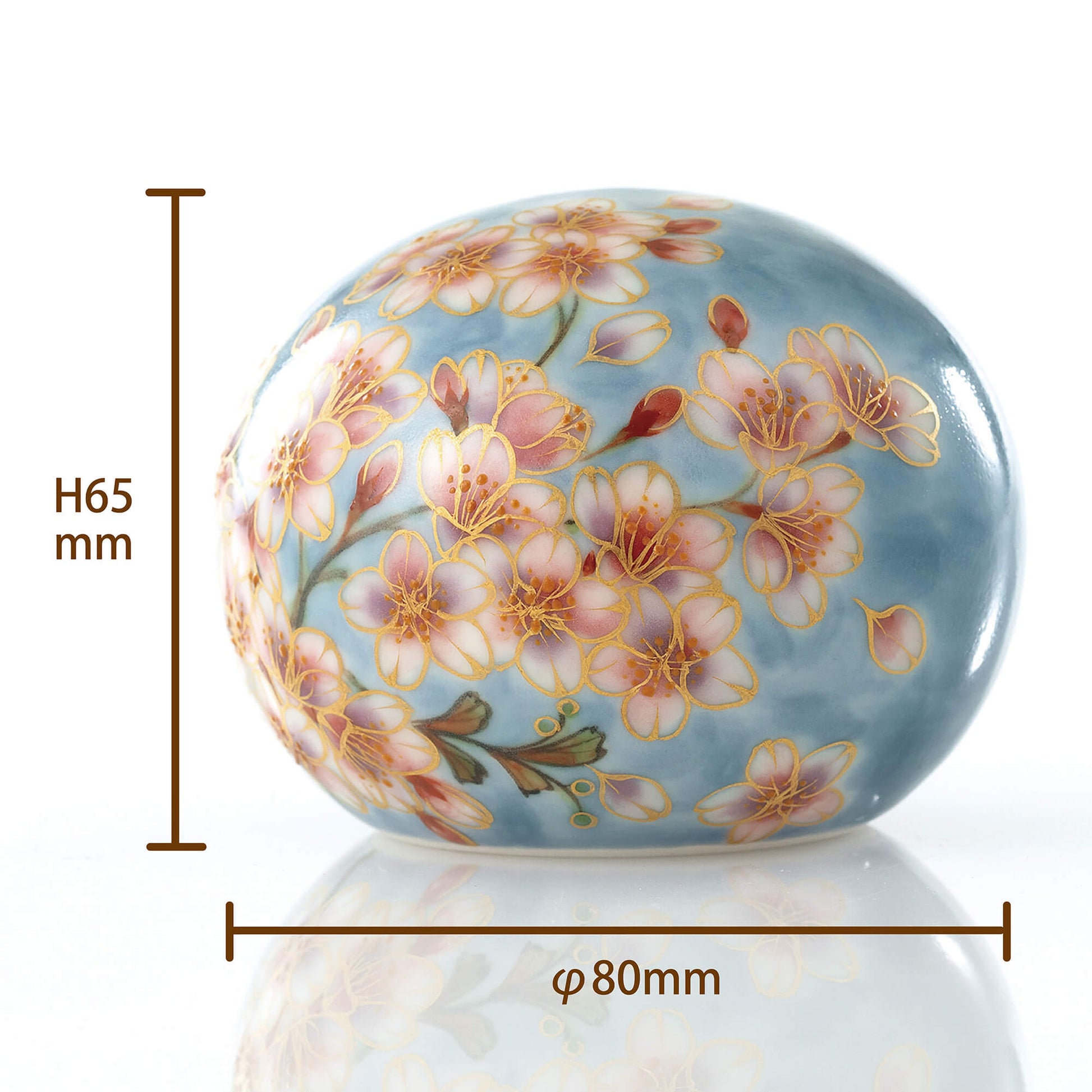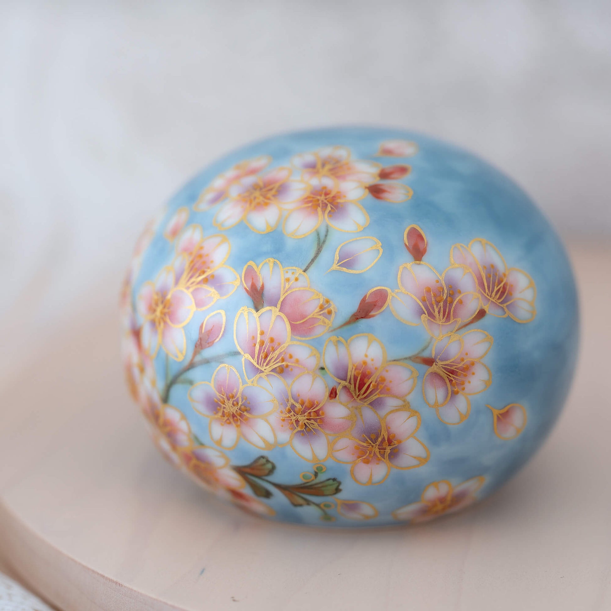 青空の清々しい色合いと、淡い桜の花が織りなすこのデザインは、見ているだけで心がほっこりと和むような、繊細で美しい仕上がりです。春の穏やかなひとときを感じさせるこのミニ骨壷は、親しみやすく日常にほんのりとした温かさを添えてくれます。