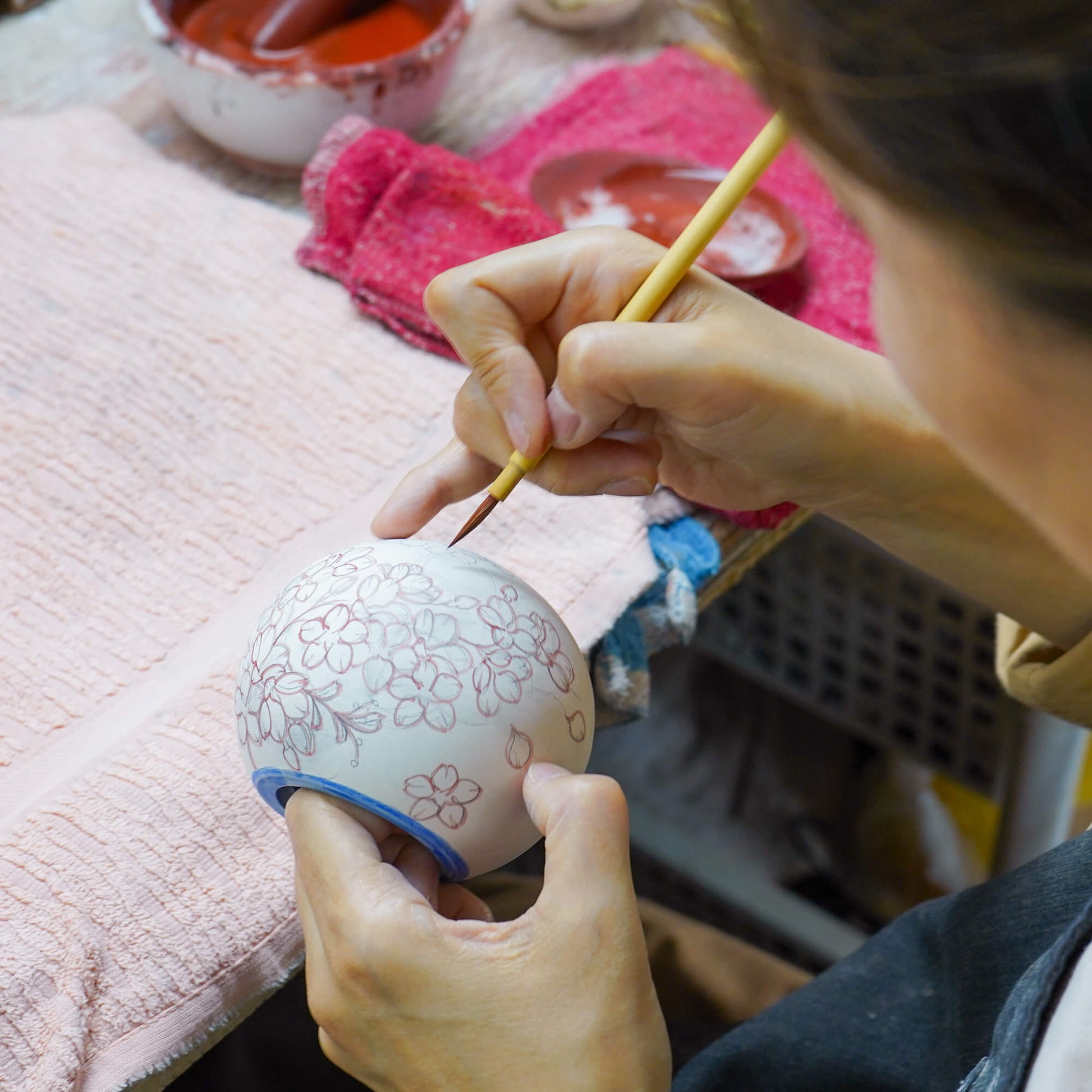 陶葊の手がける清水焼は、鮮やかな発色とほかにはない強度が特徴です。清水焼は本焼きをした上に絵をつける「上絵付け」で知られていますが、陶葊では釉薬を塗る前に彩色する「下絵付け」を採用。さらに1,200度という高温で焼くことで、強度のある清水焼を作ることに成功しました。高温で焼くと鮮やかな色味を出すのが難しいのですが、下絵に使う絵の具から開発することで、雅びな色味はそのままに傷つきにくさも実現しました。