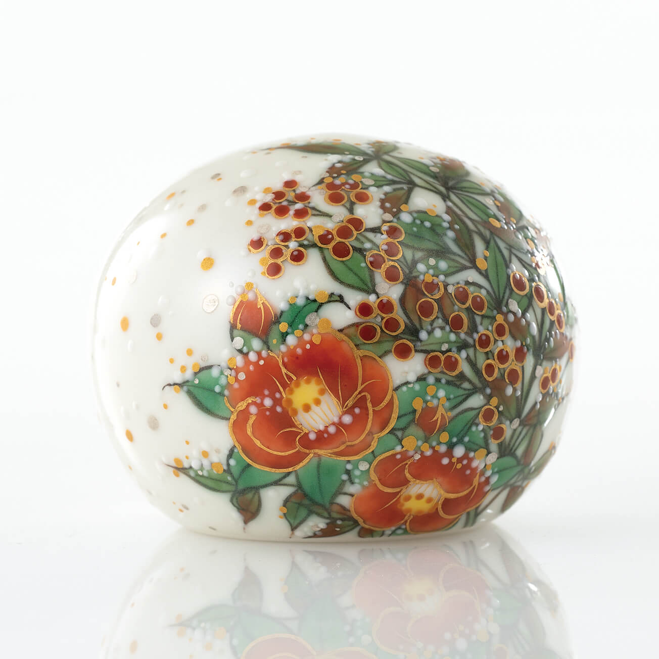 寒い季節の美しさと静けさを表現し、柔らかな雪が降る風景に、鮮やかな椿の花と赤い南天の実が冬の彩りを添えています。雪には立体感があり、手触りでもその美しさを感じられます。
