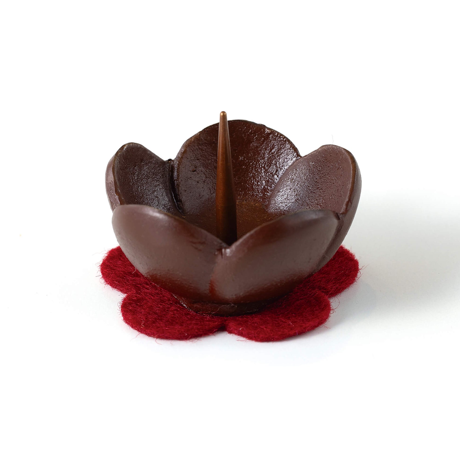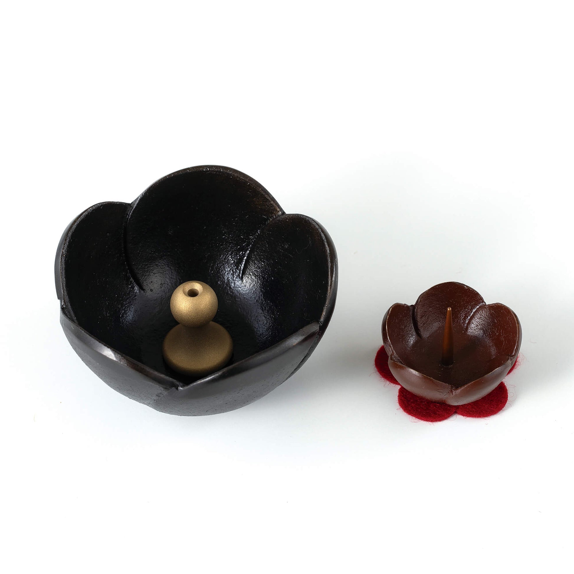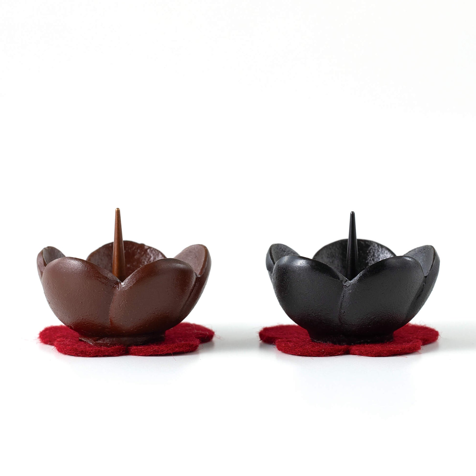 うめ燭台小は、富山県高岡の職人によって丁寧に手作りされております。伝統的な鋳造法を用いて製造され、色付けにはこだわりのある伝統的な技法が採用されています。燭台には可愛い梅型の防火性フェルトマットが付属しております。 真鍮製であるため、長期間ご使用いただける上、水洗いも可能ですので、清潔に保つことができます。同シリーズの香炉も併せてお使いいただけます。どうぞお気軽にお求めください。