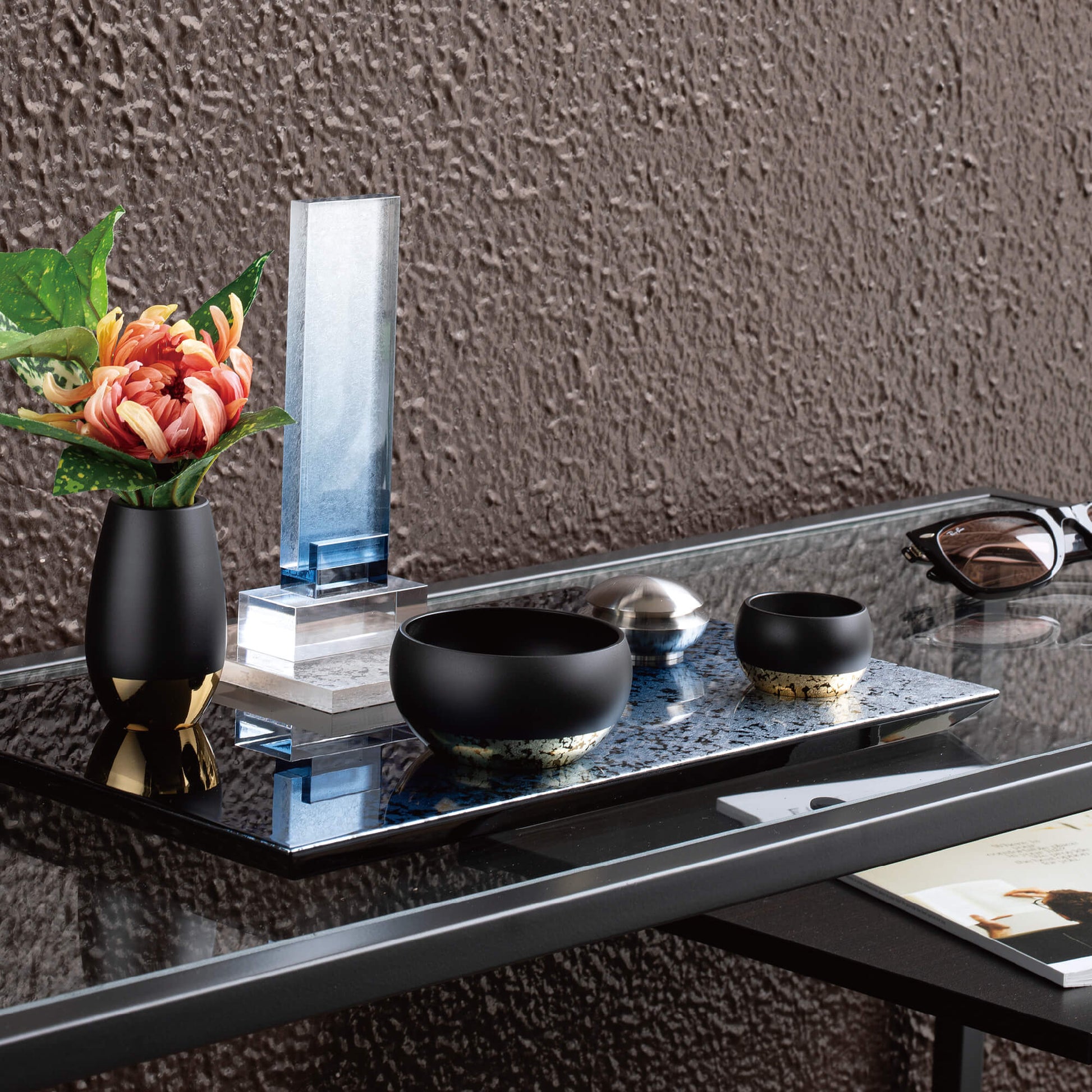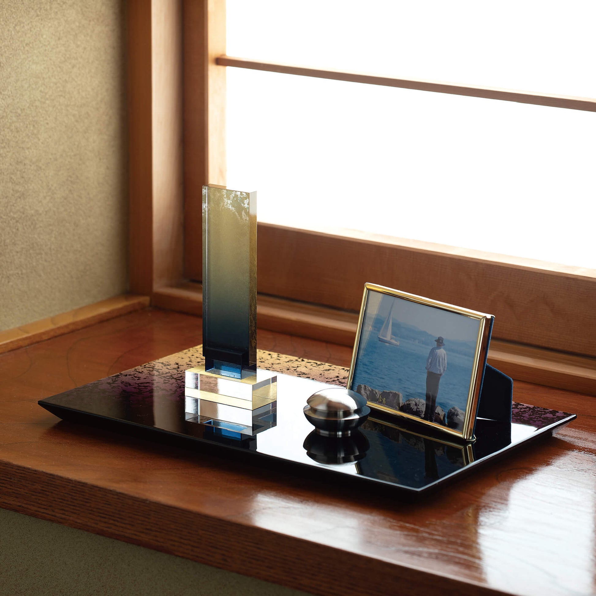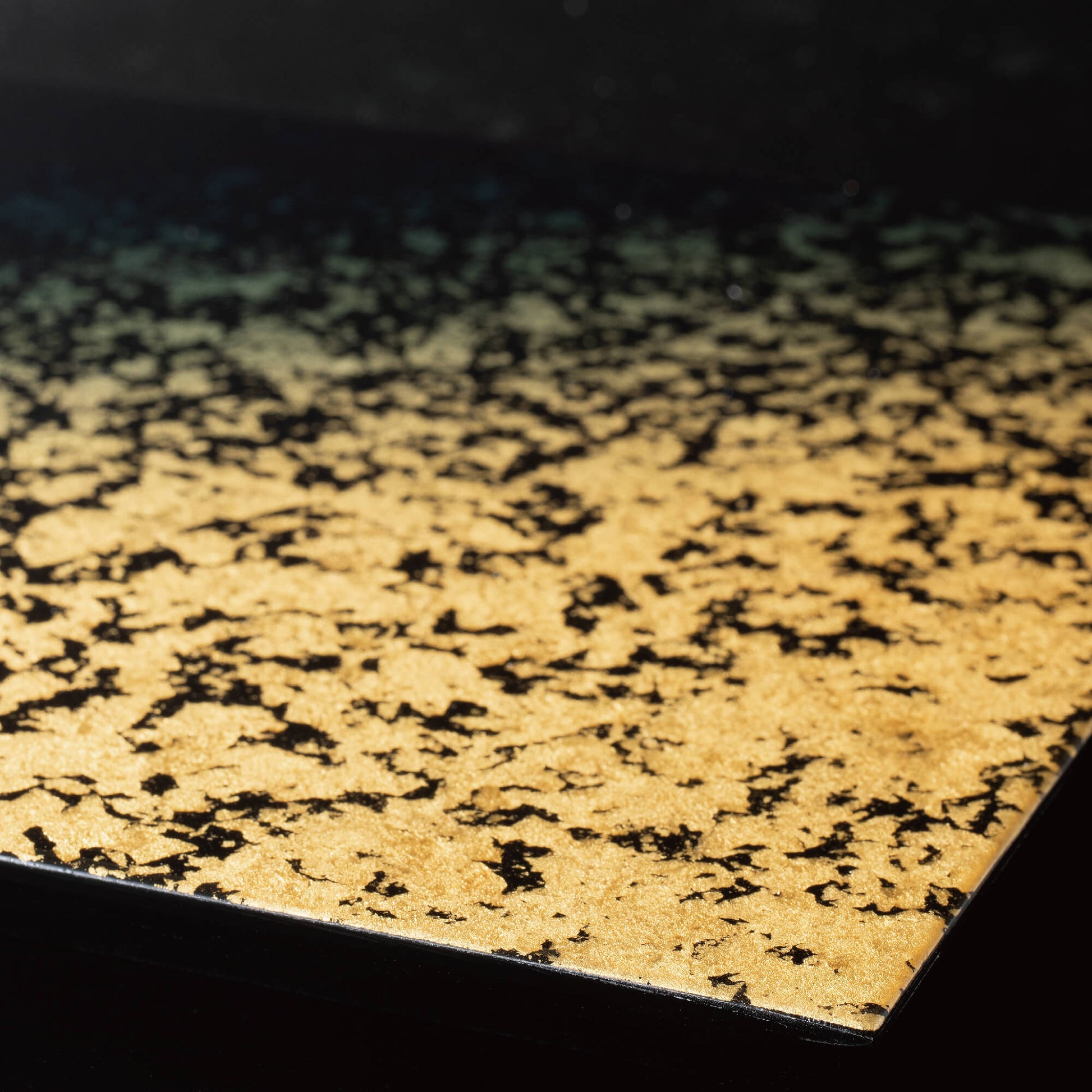 黒の静けさは、深く沈んだ心の奥底を。 そこに広がる箔のひび割れは、時の経過と心の揺らぎを表しています。 まるで大地から静かに光がにじみ出るように、記憶と祈りが浄化されていく様子をかたちにしました。