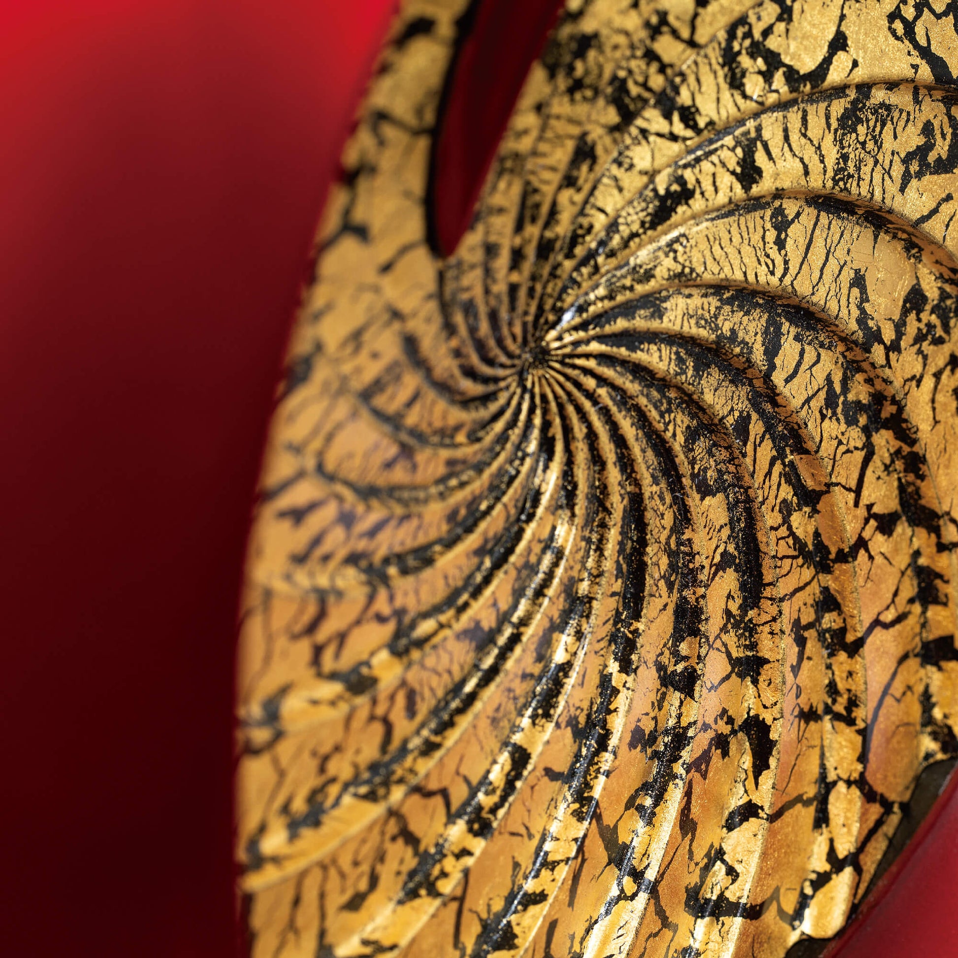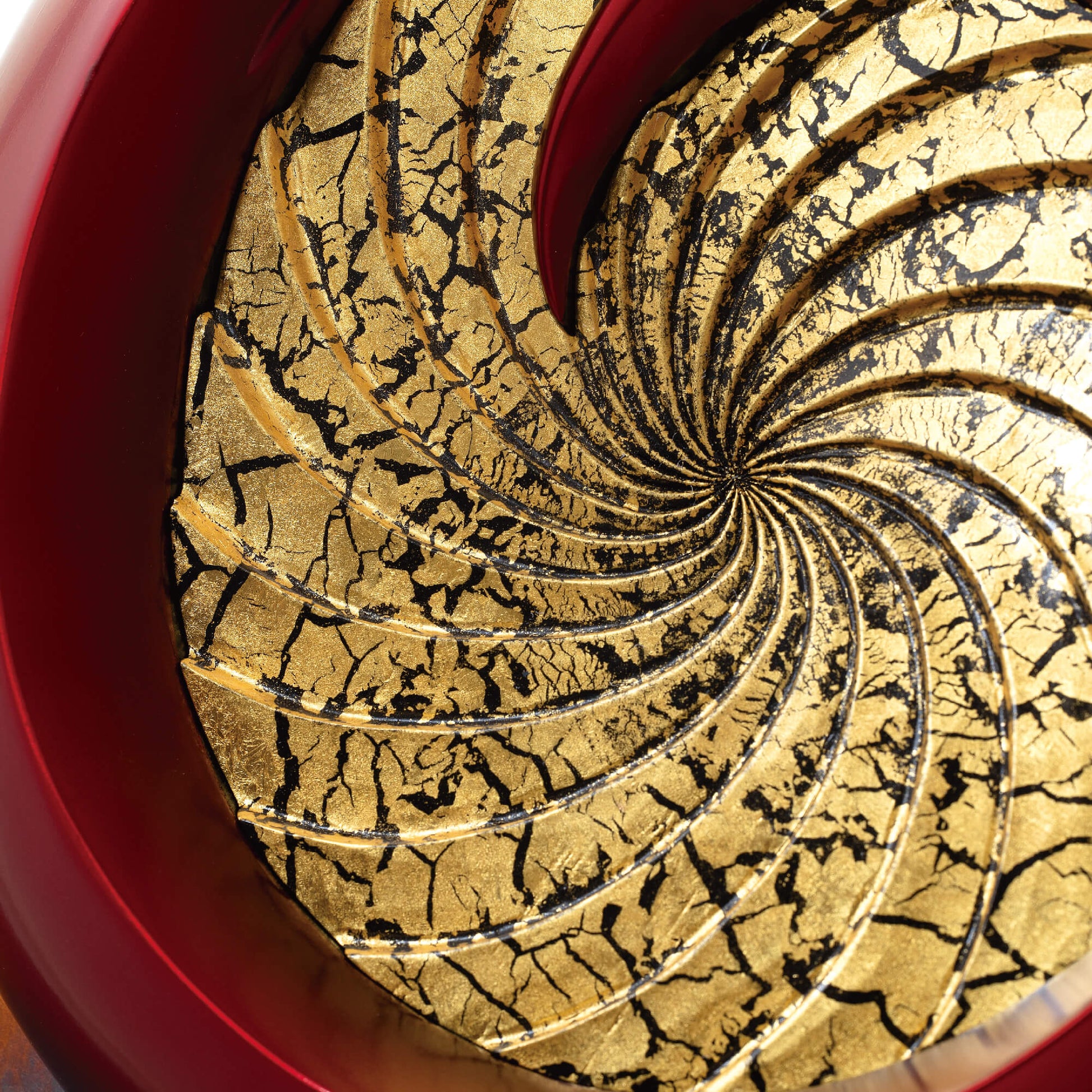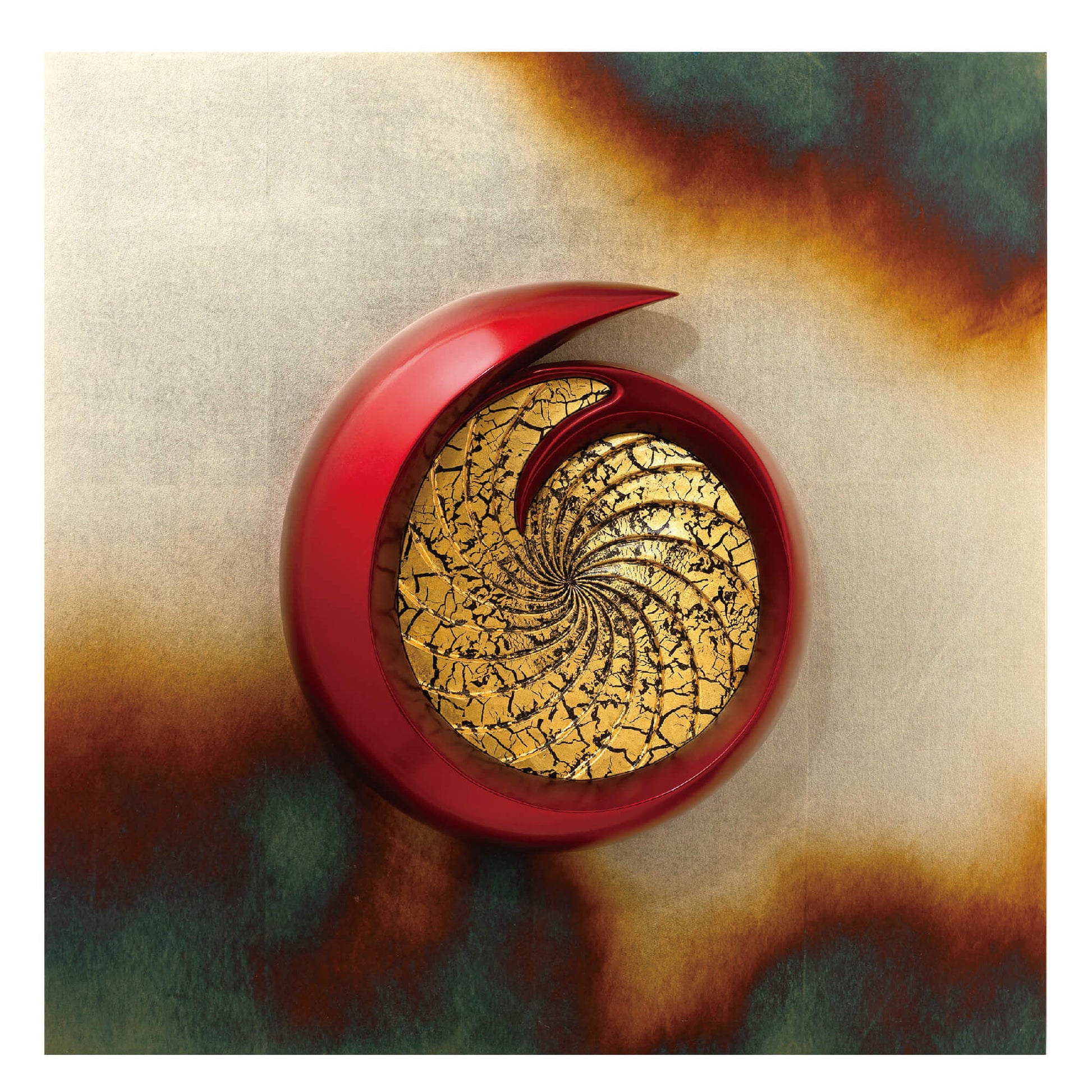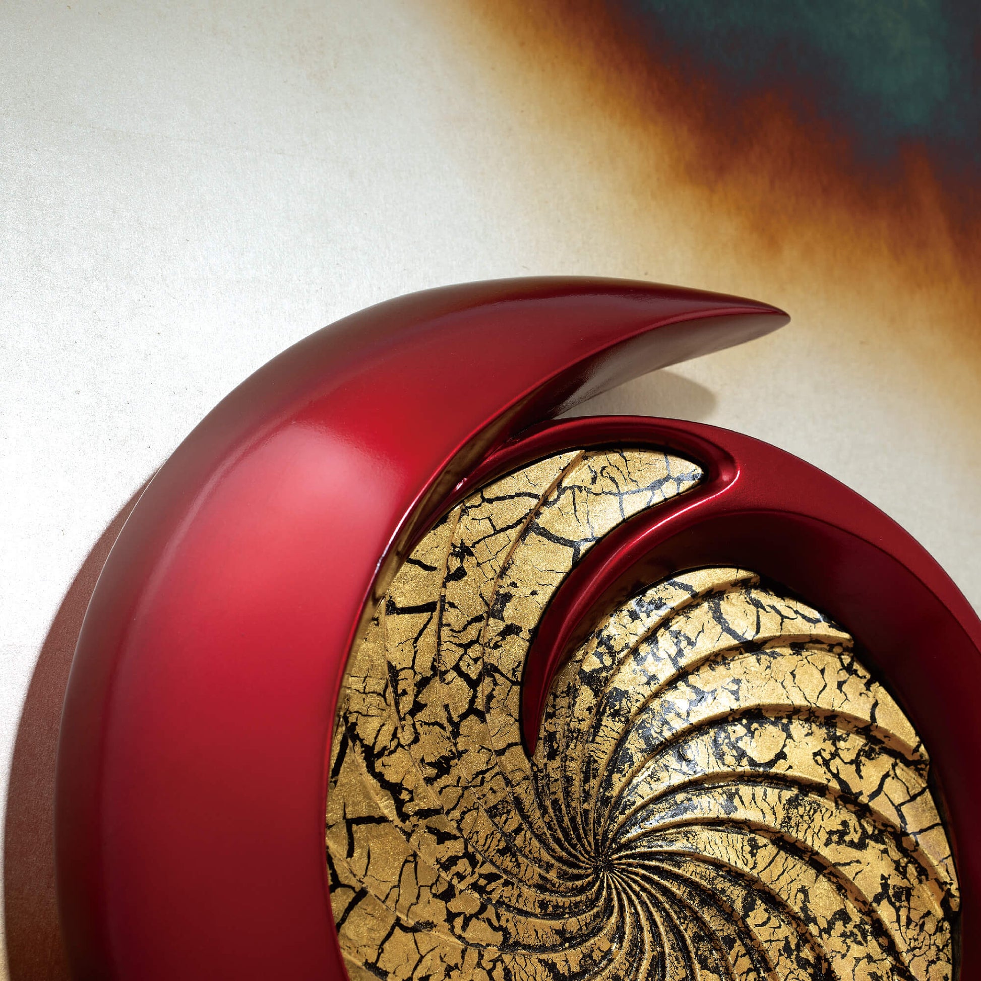 そのうずは天と地を結ぶ軌跡を描き、人の魂が大いなる宇宙と共鳴することを象徴しています。本体の深紅のグラデーションは、歩んできた人生の情熱と、積み重ねられた時間の記憶を刻むものです。背面には総銀箔を貼り、日本画の伝統技法「銀焼き」により生み出された雲が広がり、宇宙的な背景を形作ります。さらに、この作品は裏側に遺灰を納める木製スティックを収められる構造を備え、大切な故人を想い祈る場としての役割も担います。