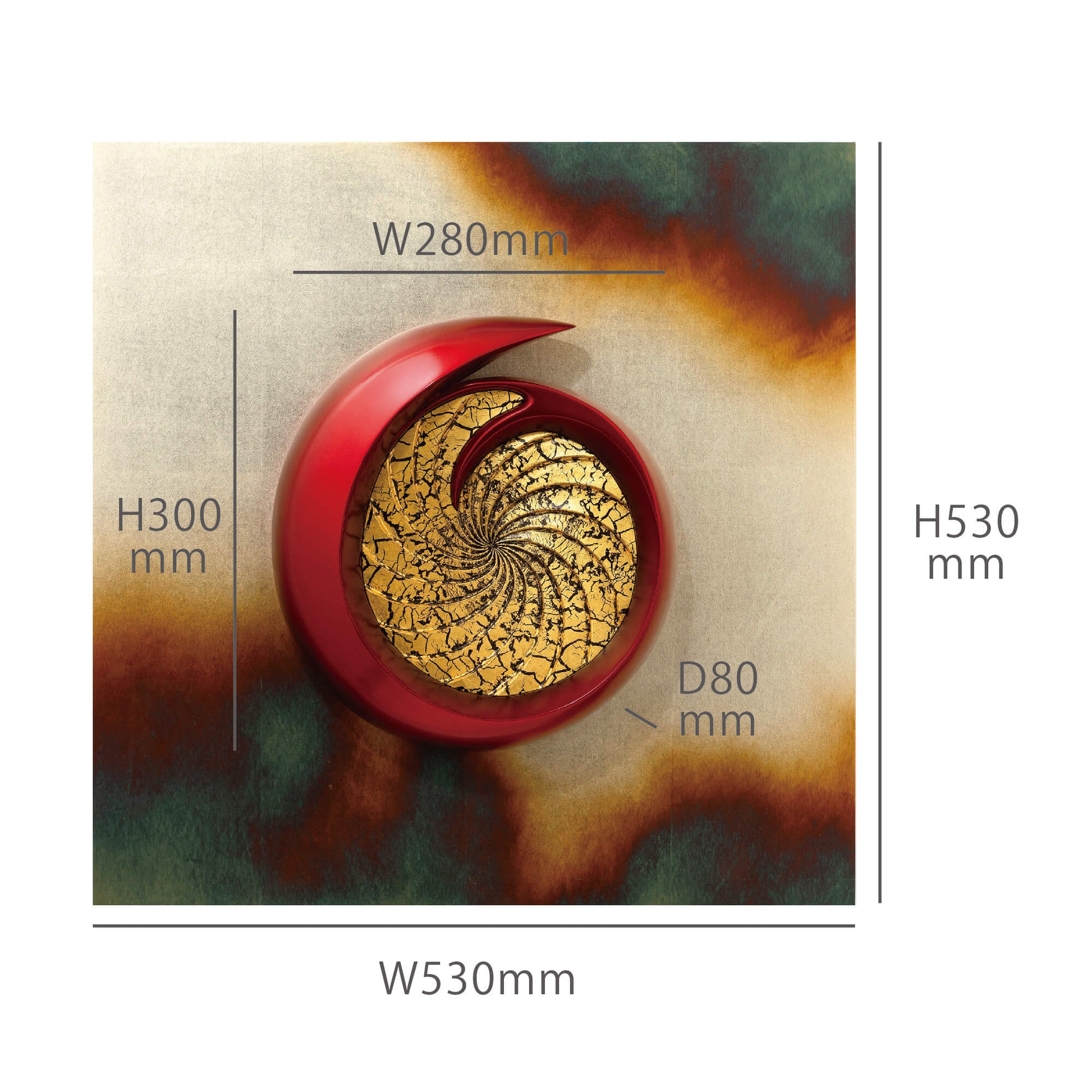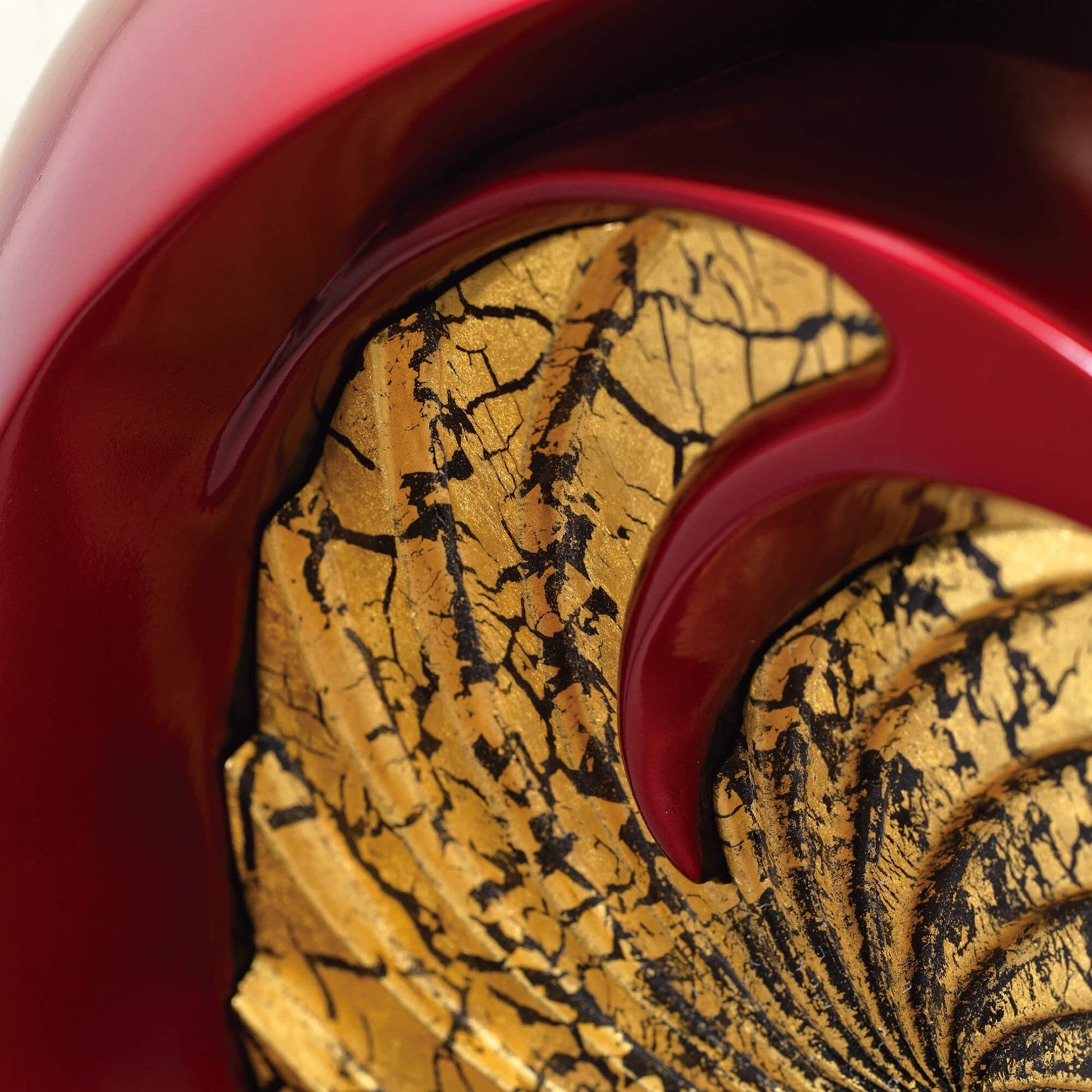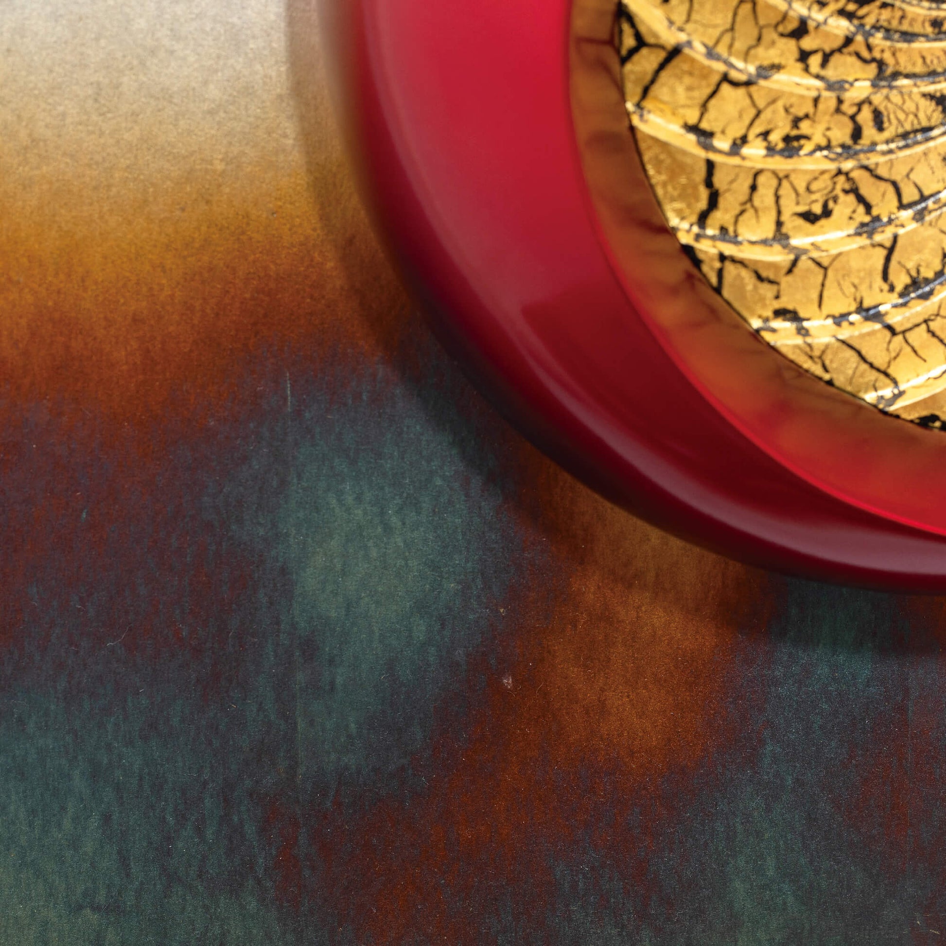 そのうずは天と地を結ぶ軌跡を描き、人の魂が大いなる宇宙と共鳴することを象徴しています。本体の深紅のグラデーションは、歩んできた人生の情熱と、積み重ねられた時間の記憶を刻むものです。背面には総銀箔を貼り、日本画の伝統技法「銀焼き」により生み出された雲が広がり、宇宙的な背景を形作ります。さらに、この作品は裏側に遺灰を納める木製スティックを収められる構造を備え、大切な故人を想い祈る場としての役割も担います。