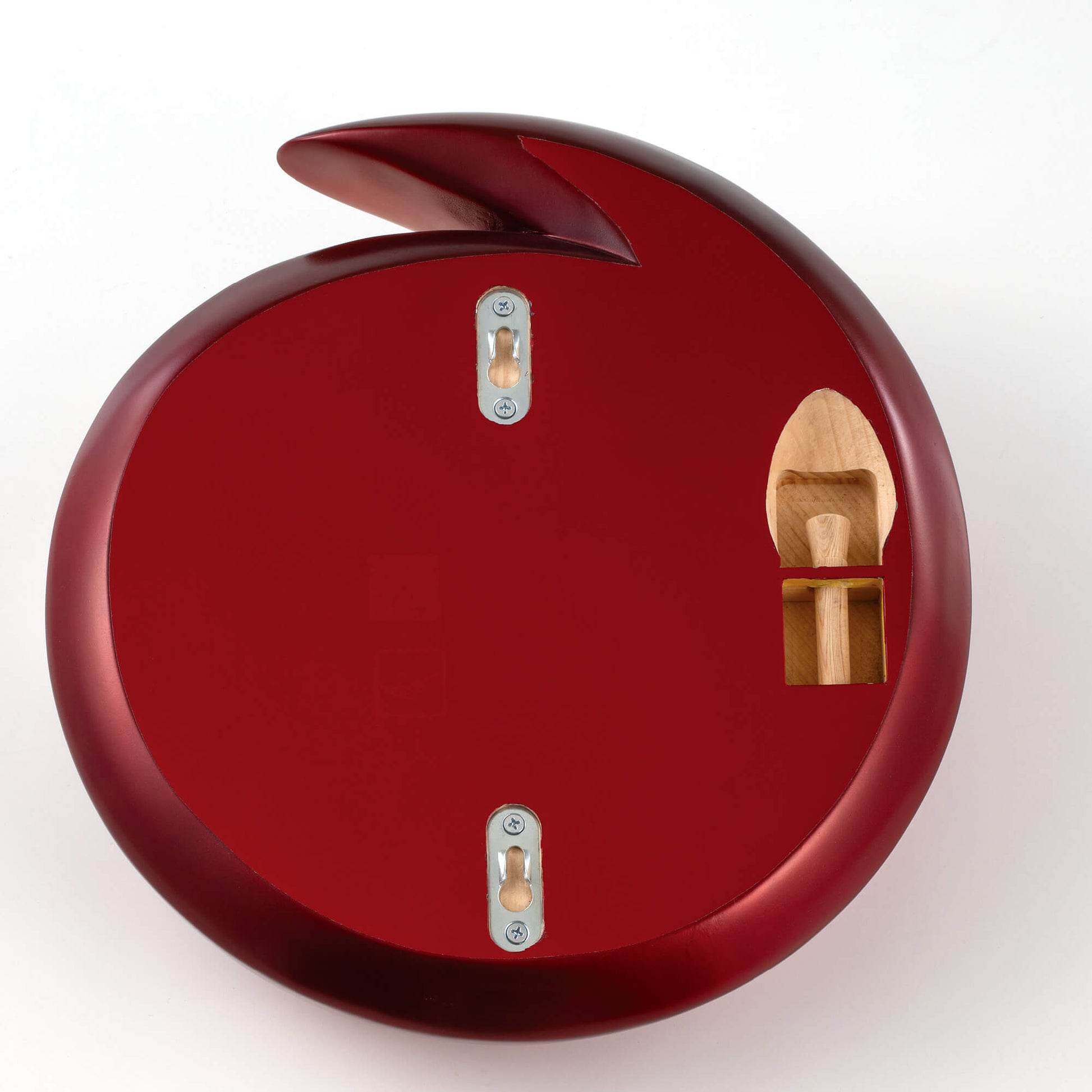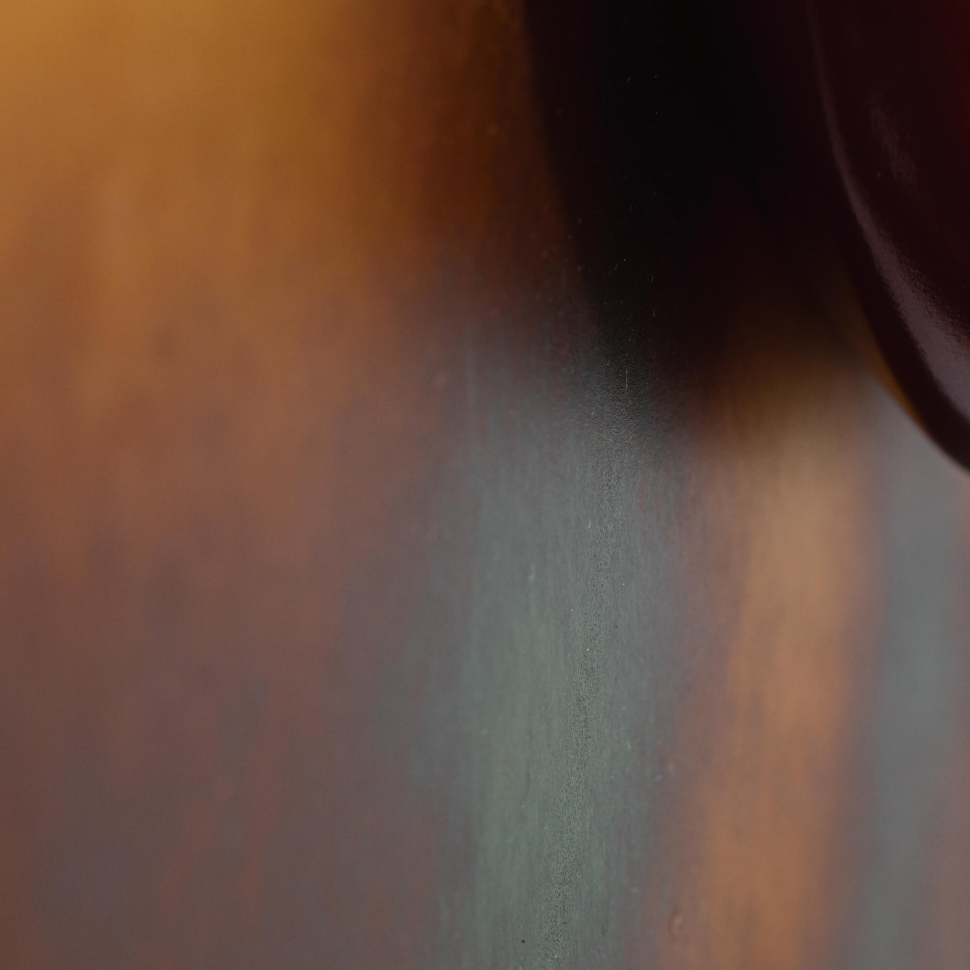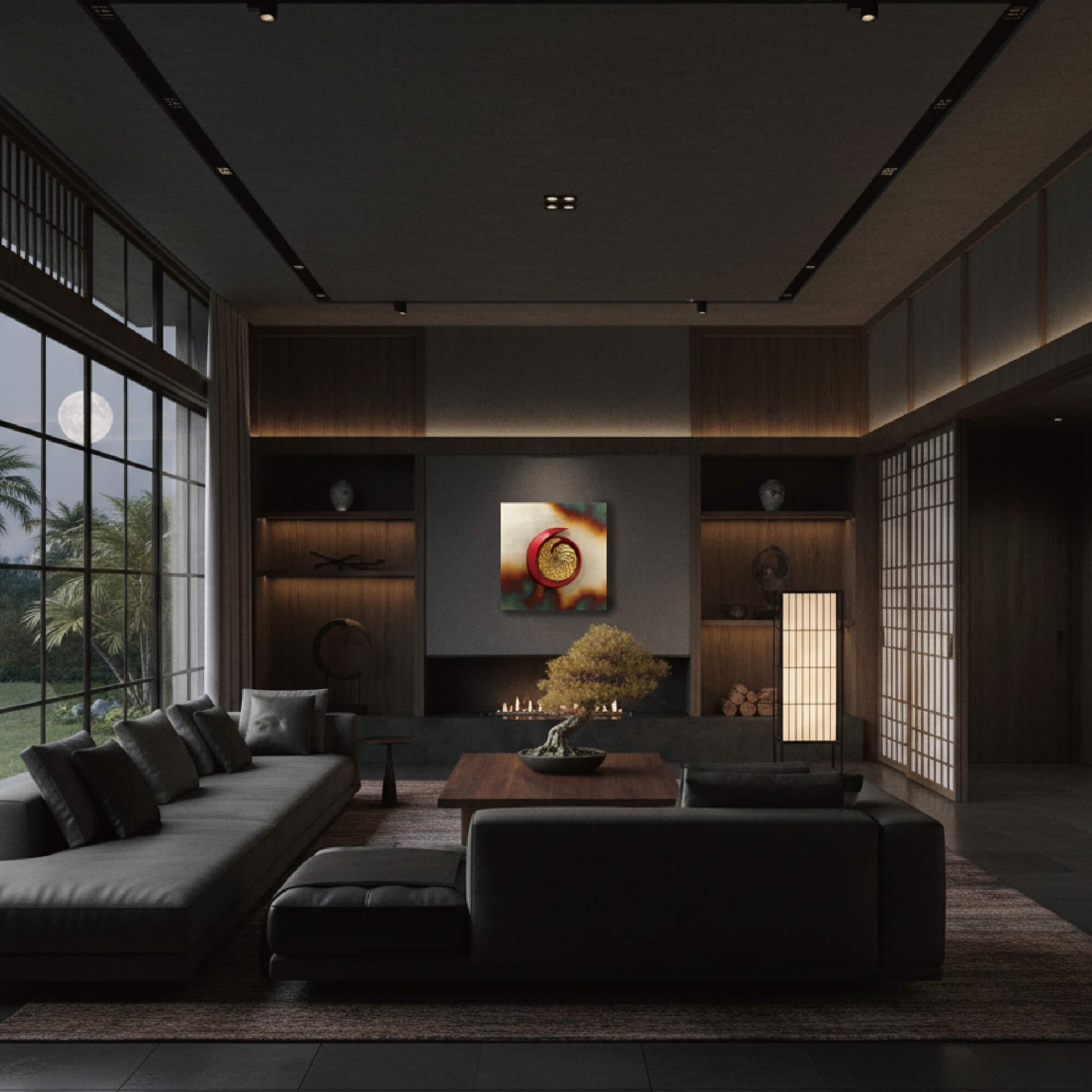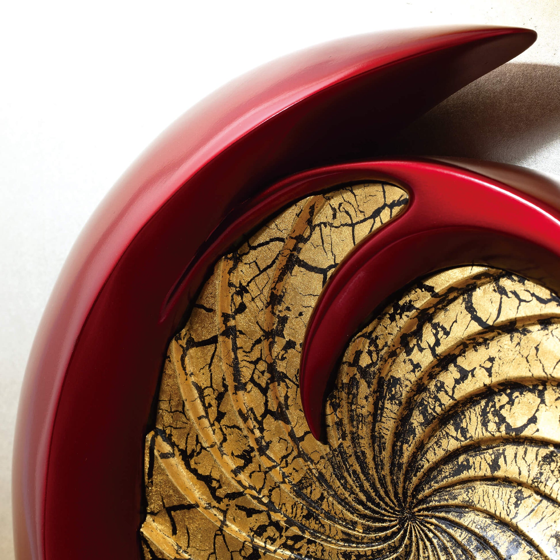 そのうずは天と地を結ぶ軌跡を描き、人の魂が大いなる宇宙と共鳴することを象徴しています。本体の深紅のグラデーションは、歩んできた人生の情熱と、積み重ねられた時間の記憶を刻むものです。背面には総銀箔を貼り、日本画の伝統技法「銀焼き」により生み出された雲が広がり、宇宙的な背景を形作ります。さらに、この作品は裏側に遺灰を納める木製スティックを収められる構造を備え、大切な故人を想い祈る場としての役割も担います。